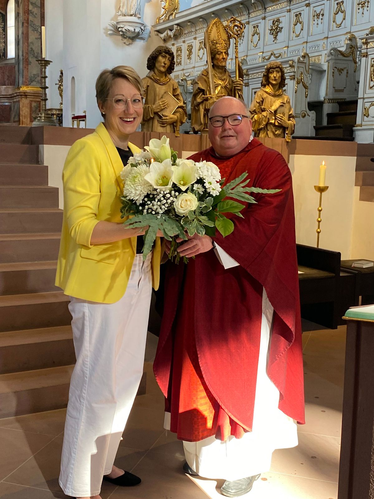 Beim Gottesdienst im Neumünster zum Sommerfest für alle Dom-Ehrenamtlichen dankte Dompfarrer Stefan Gessner Eck für ihre engagierte Tätigkeit am Würzburger Dom. Sie sei „die Frau, die am richtigen Platz im Herzen der Diözese ihre Aufgabe mit viel Herzblut erfüllt“. Besucherinnen und Besucher des Doms würden sie von Hochfesten und besonderen Veranstaltungen kennen, wenn sie mit ihrem Team die Gläubigen in Empfang nehme. Doch die Dompastoral sei eine „pastorale Schlüsselstelle“. Dort würden unter anderem alle ehrenamtlichen Dienste koordiniert, wie die Ausbildung von Domführerinnen und -führern sowie der Mitarbeitenden in der Besucherinfo. Weiter engagiere sich Eck als Lektorin wie auch als Kantorin im Dom und koordiniere als Referentin für citypastorale Projekte zusammen mit ihrer evangelischen Kollegin die ökumenische „Nacht der offenen Kirchen“. Ihre Energie und Tatkraft schöpfe sie aus ihrem Glauben und den Begegnungen mit den vielen Menschen im Umfeld des Würzburger Doms.