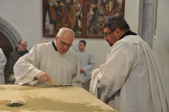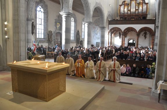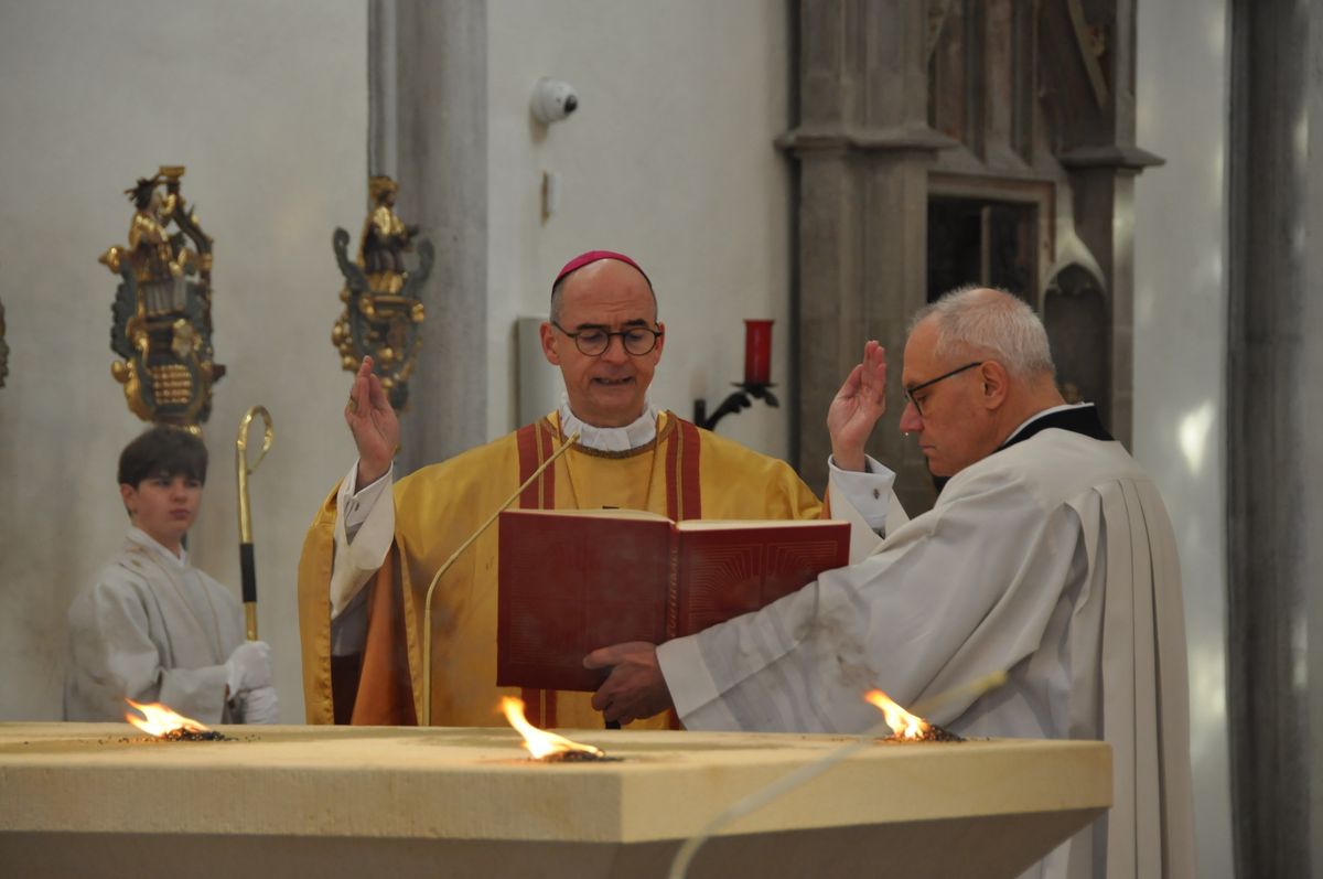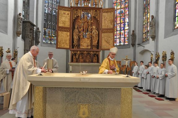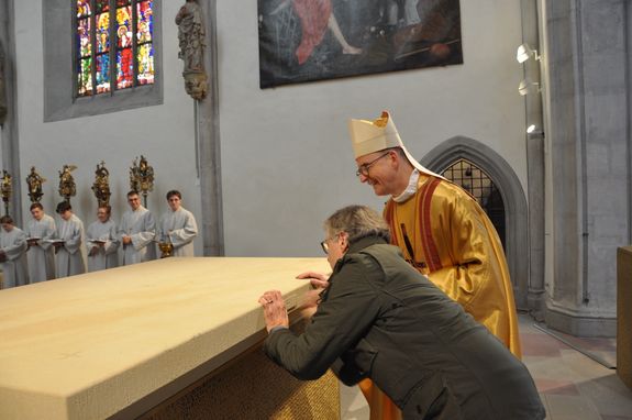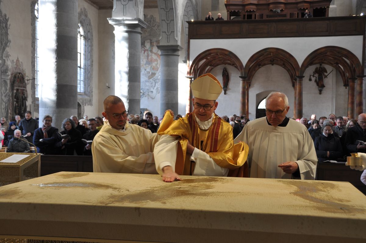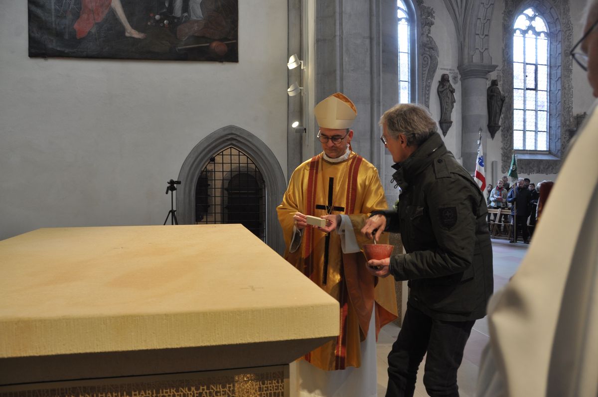 Rund 500 Besucher und Mitwirkende verfolgten den zweieinhalbstündigen Weihegottesdienst. „Der Altar ist der Ort in unseren Kirchen, an dem wir den Sieg des Lebens über den Tod feiern“, sagte Bischof Jung in seiner Predigt. Durch die Weihe werde dieser Altar der profanen Nutzung entzogen. „Er wird ganz Gott übereignet.“ Die besondere Verehrung drücke sich in der Eucharistie durch den Altarkuss des Priesters und durch die Inzens (wörtlich übersetzt „Anzünden“) mit Weihrauch aus.