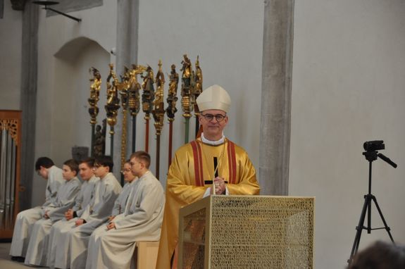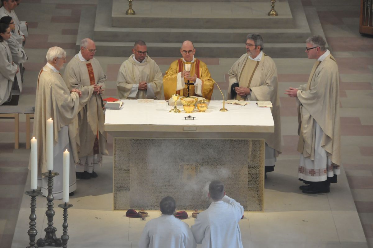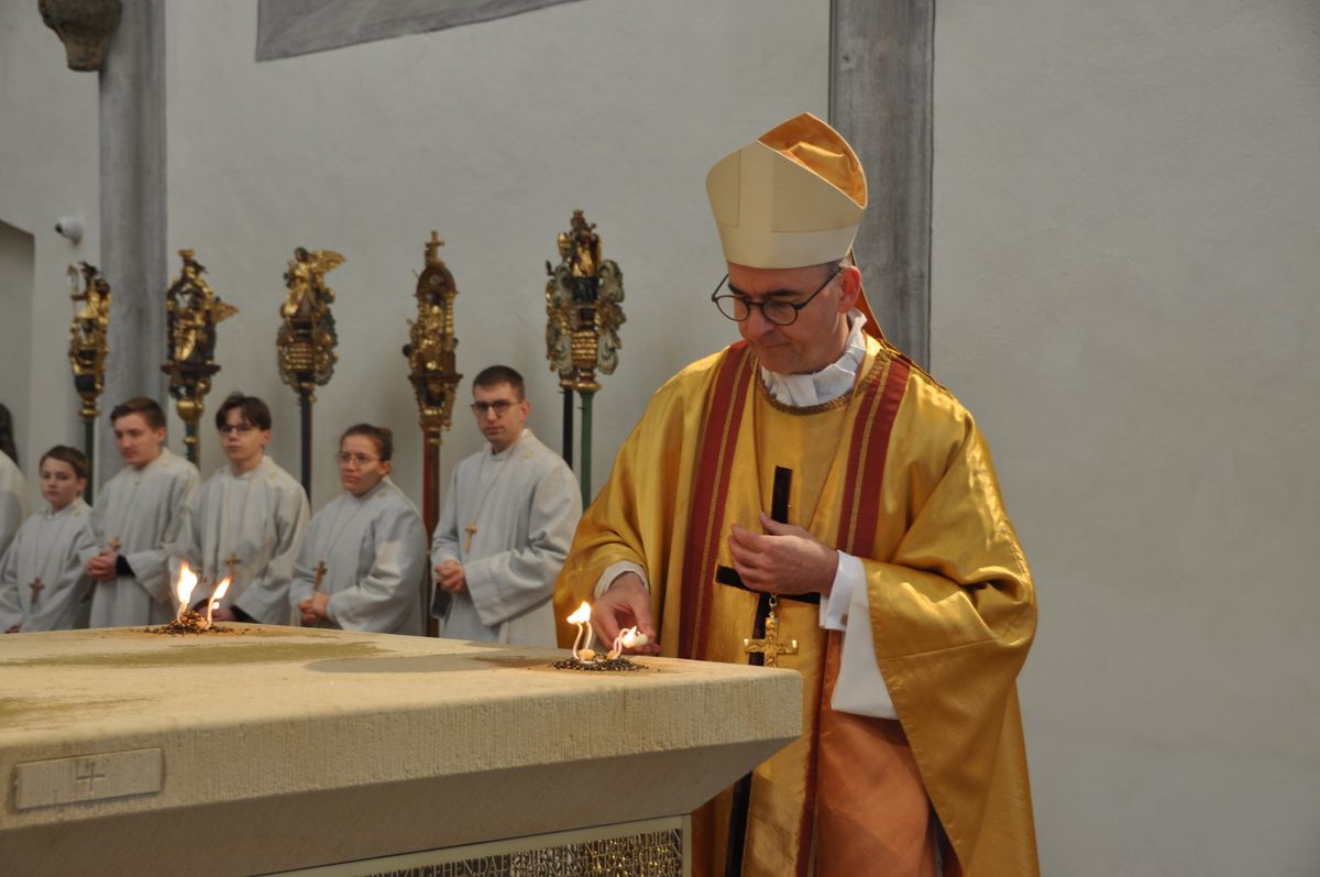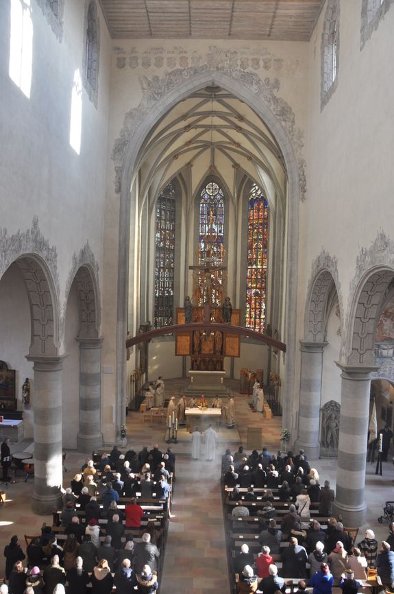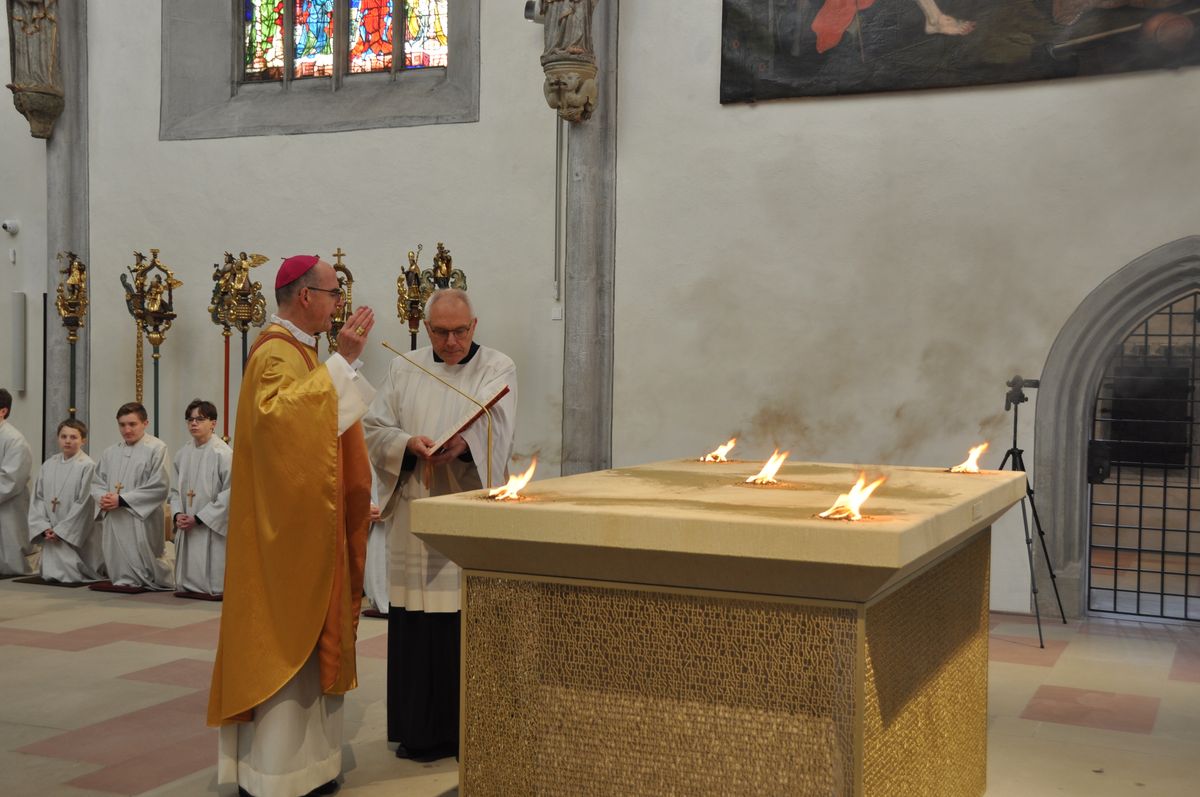 Rund 500 Besucher und Mitwirkende verfolgten den zweieinhalbstündigen Weihegottesdienst. „Der Altar ist der Ort in unseren Kirchen, an dem wir den Sieg des Lebens über den Tod feiern“, sagte Bischof Jung in seiner Predigt. Durch die Weihe werde dieser Altar der profanen Nutzung entzogen. „Er wird ganz Gott übereignet.“ Die besondere Verehrung drücke sich in der Eucharistie durch den Altarkuss des Priesters und durch die Inzens (wörtlich übersetzt „Anzünden“) mit Weihrauch aus.