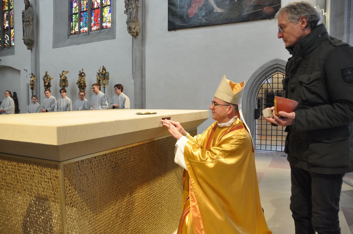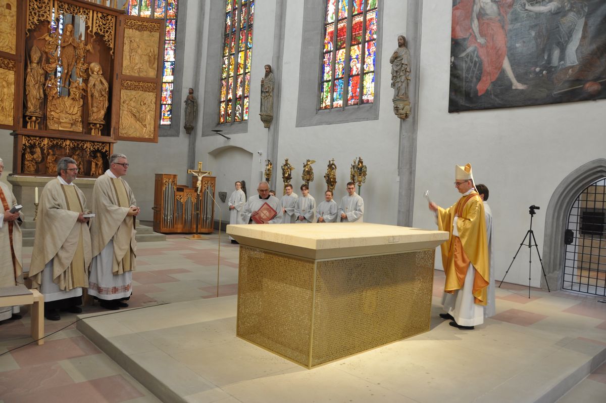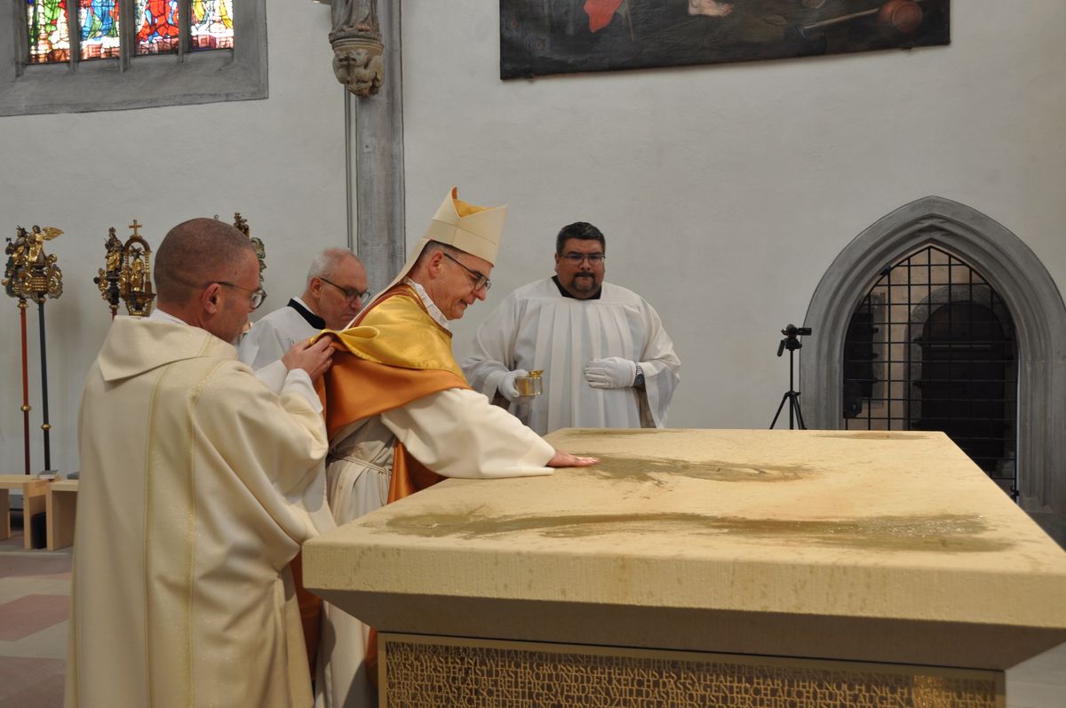 Der Ritus sieht vor, dass zunächst Reliquien in der Altarplatte eingemauert werden. Bischof Jung hatte unter anderem Reliquien der Bistumsheiligen Kilian und Burkard in einer goldenen Schatulle mitgebracht. Restaurator Stefan Lochner verschloss die Öffnung. Nach der Allerheiligenlitanei wurde der neue Altar mit Weihwasser besprengt und mit Chrisamöl gesalbt. Augustinerpater Markus Reis und Bischof Jung entzündeten schließlich an den vier Ecken und in der Mitte Feuer und Weihrauch. Nach der Reinigung der Natursteinplatte durch Liturgiereferent Dr. Stephan Steger wurde der Altar erstmals eingedeckt.