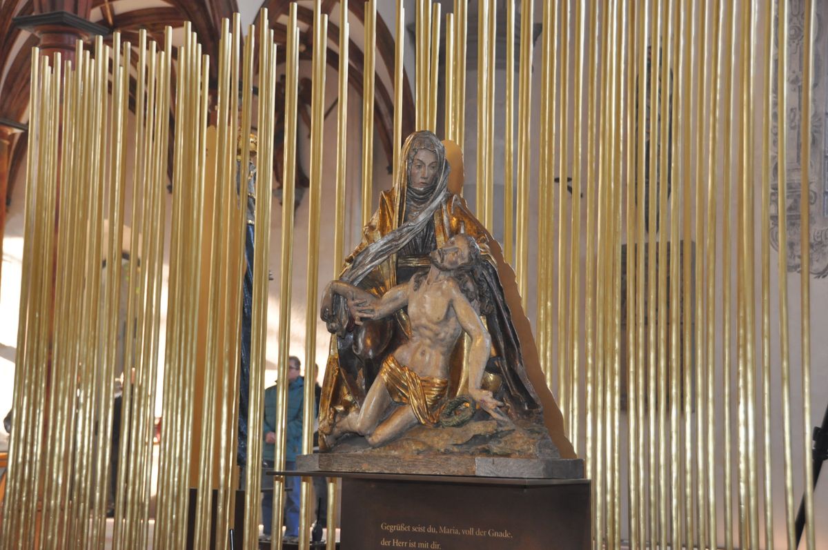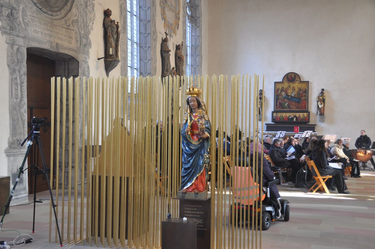 „Der Marienort greift das Thema Licht und Transzendez auf“, beschreibt das Künstlerehepaar das Konzept für die zwei historischen Marienfiguren im Seitenschiff. Goldene Stäbe markieren die Marienwand, lassen aber auch den Blick auf den Raum dahinter offen. „Es entsteht ein Spiel von Transparenz und Transzendenz, von Aufsicht und Durchsicht, Materialität und Auflösung.“ Die beiden Marienfiguren stehen auf patinierten Messingkonsolen mit einpunzierten vergoldeten Texten des Ave Maria.