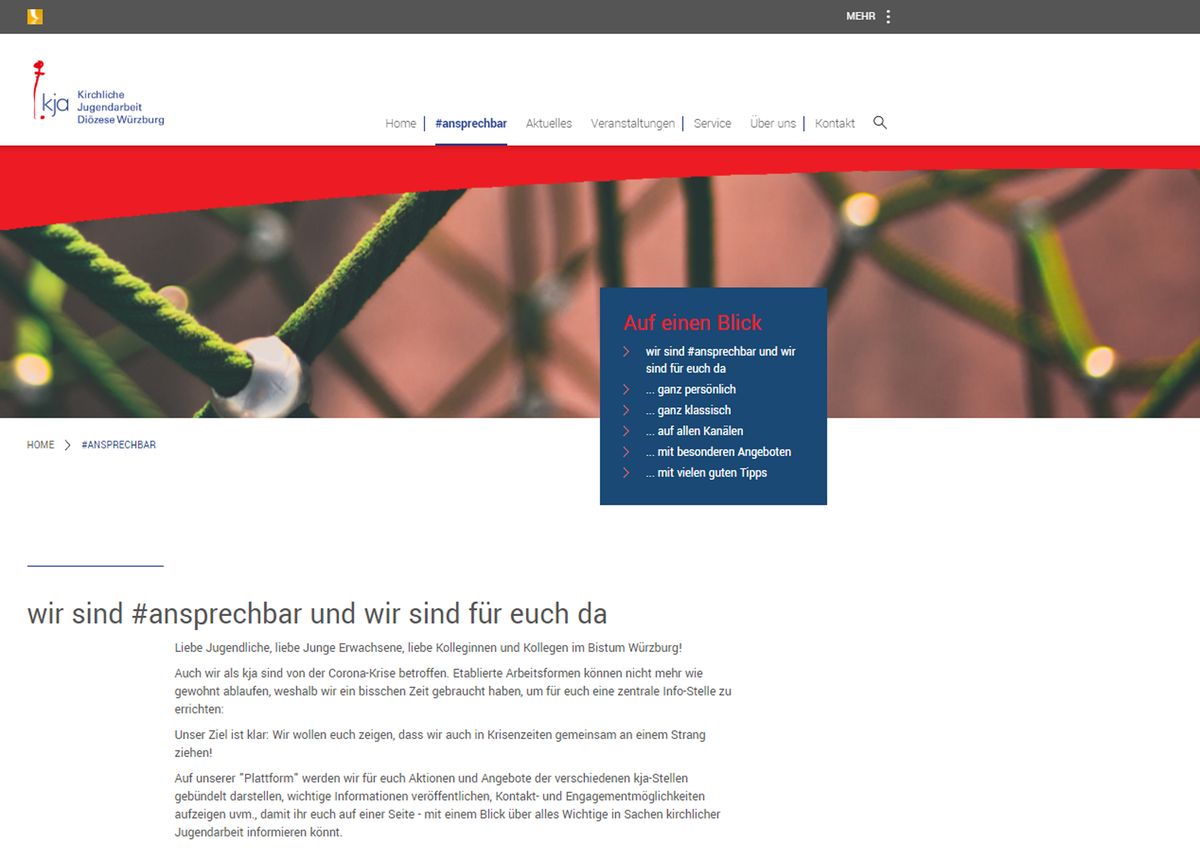 Von Montag bis Freitag (mit Ausnahme der Feiertage) in der Zeit von 9 bis 16 Uhr ist unter der zentralen Telefonnummer 0931/38663033 eine Jugendseelsorgerin oder ein Jugendseelsorger der kja erreichbar. Hier können alle Jugendlichen und jungen Erwachsenen anrufen, die Gesprächsbedarf haben, Anregungen oder Unterstützung für sich persönlich oder für ihr Engagement vor Ort suchen. Alle Angebote und Aktionen der kja, wichtige Informationen, Kontakt- und Engagementmöglichkeiten finden sich auf einen Blick auf der Internetseite https://www.kja-wuerzburg.de/ansprechbar/.