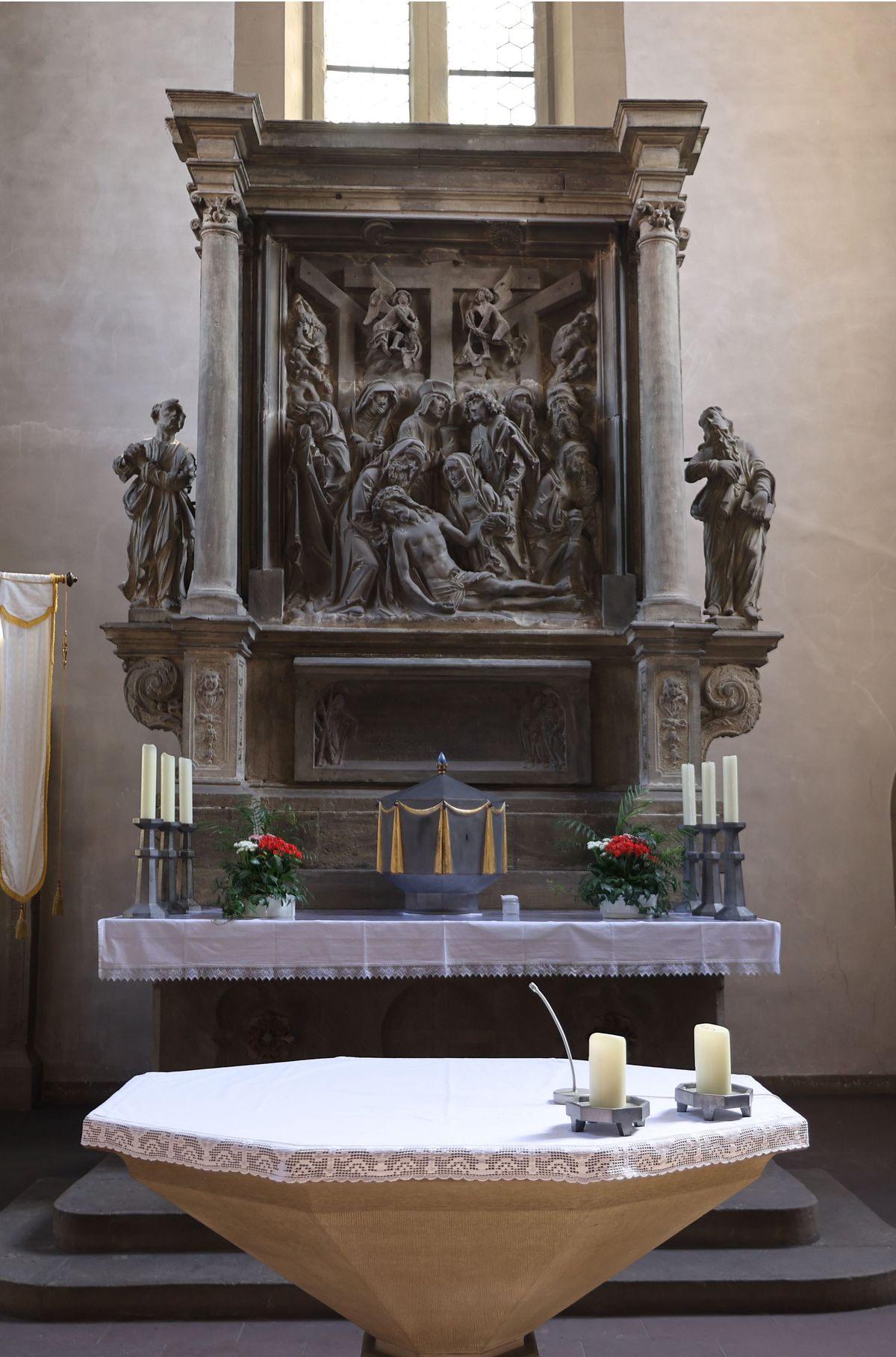 Das letzte bekannte Steinbildwerk Tilman Riemenschneiders hat die Kreuzabnahme und die Beweinung Christi zum Thema. Zwischen 1523 und 1526 habe „Meyster Dyln“, wie Riemenschneider seinerzeit genannt wurde, dieses Werk geschaffen – so vermuten zumindest die Fachleute. Somit fällt die Fertigstellung des Altares in eine Zeit, die biographisch für Riemenschneider äußerst einschneidend war, die Zeit des Bauernkriegs nämlich, auf dessen 500. Wiederkehr wir in diesem Festjahr auch noch zurückschauen.