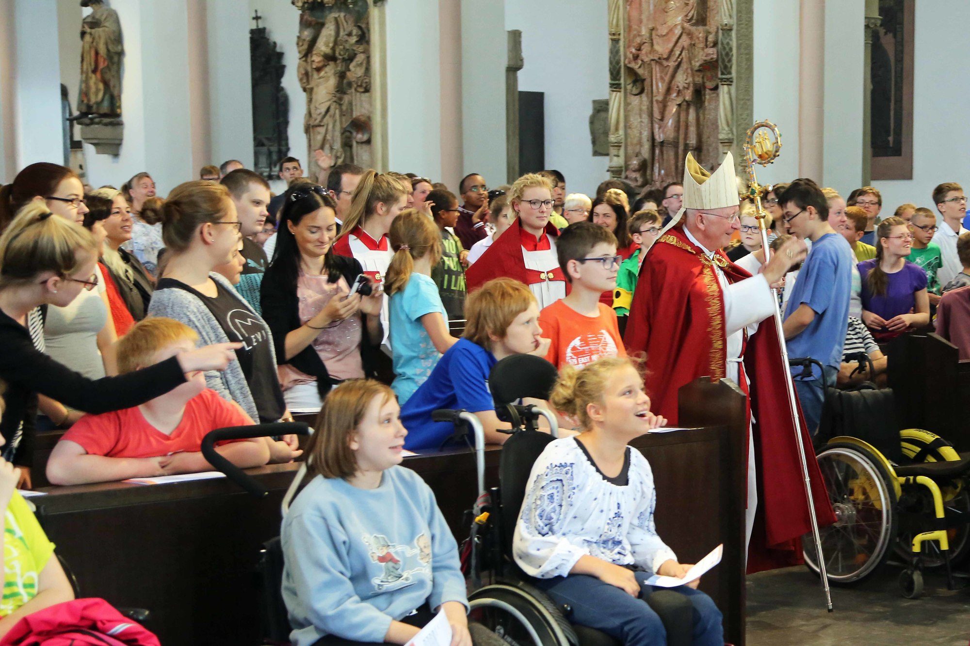 Würzburg (POW) „Einfach spitze, dass Du da bist!“, schallt es in ohrenbetäubender Lautstärke durch den Kiliansdom. Im Takt klatschen die jungen Leute in die Hände und winken. „Ich freue mich, dass Ihr alle da seid“, ruft Weihbischof Ulrich Boom den rund 600 Kindern und Jugendlichen sowie etwa 150 Begleitpersonen aus 16 Schulen und Einrichtungen aus dem ganzen Bistum Würzburg zu. Dann begrüßen diese mit lautem Applaus Jesus und die Frankenapostel Kilian, Kolonat und Totnan. Bei der Kiliani-Wallfahrt für die Förderschulen am Donnerstag, 13. Juli, ist alles ein bisschen lauter, bunter und spontaner als bei den anderen Wallfahrten.