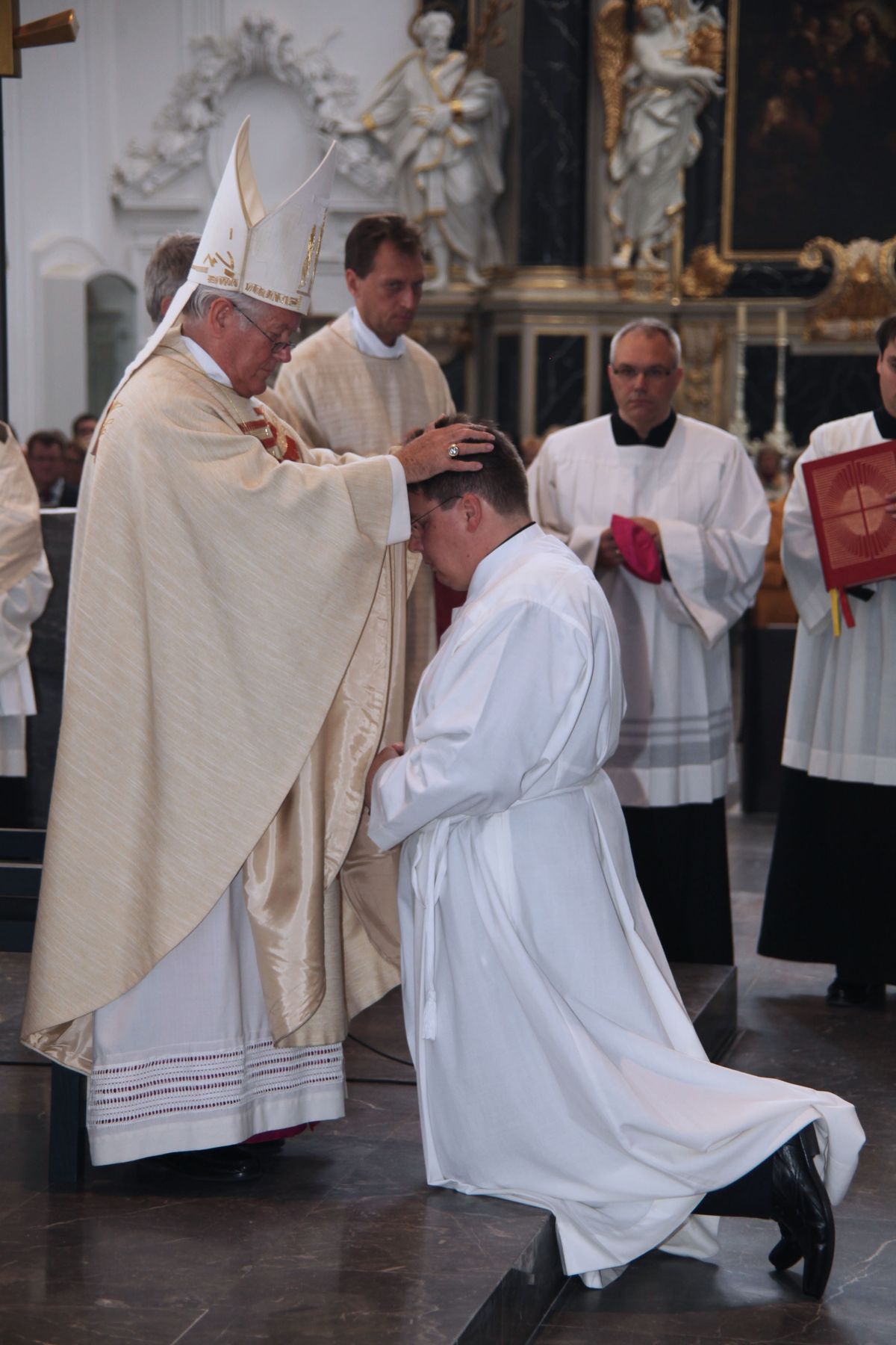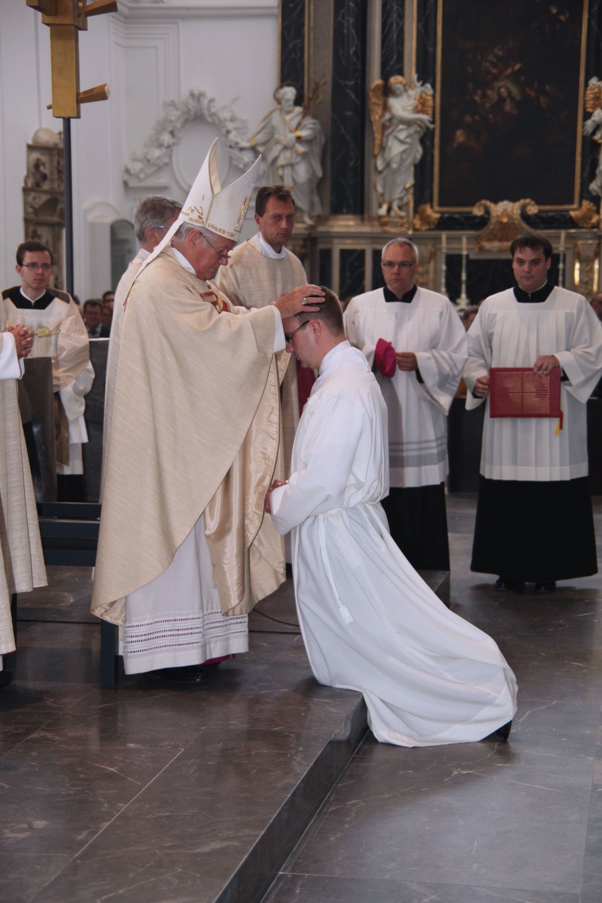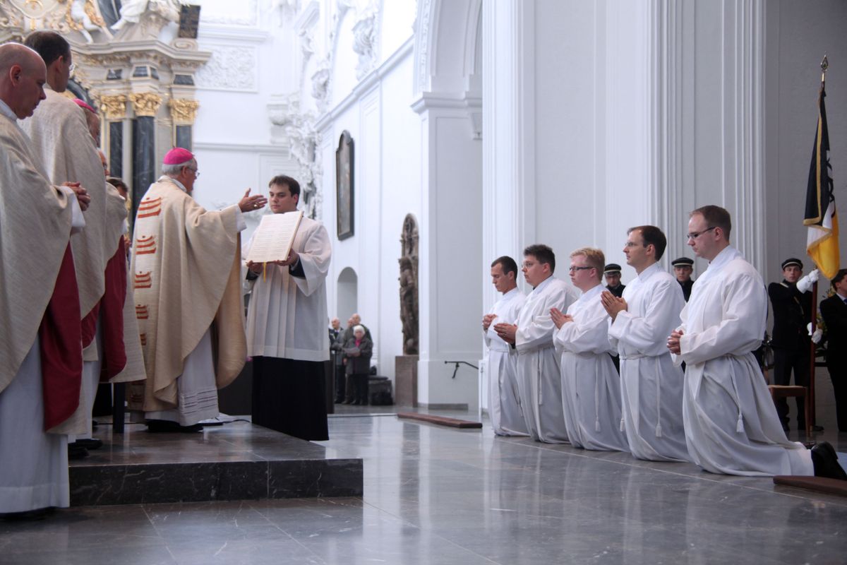 Bei der Anrufung der Heiligen lagen die fünf Männer als Zeichen der Hingabe an Christus ausgestreckt am Boden. Danach legte ihnen Bischof Hofmann schweigend die Hände auf und beauftragte und bevollmächtigte sie zum Diakonendienst. Zum Abschluss sprach der Bischof das feierliche Weihegebet für die Diakone. Bevor die Eucharistie gefeiert wurde, zogen die Praktikumspfarrer den Neugeweihten die Diakonengewänder an. Bischof Hofmann überreichte schließlich das Evangelienbuch, umarmte die Diakone und wünschte ihnen Frieden.
