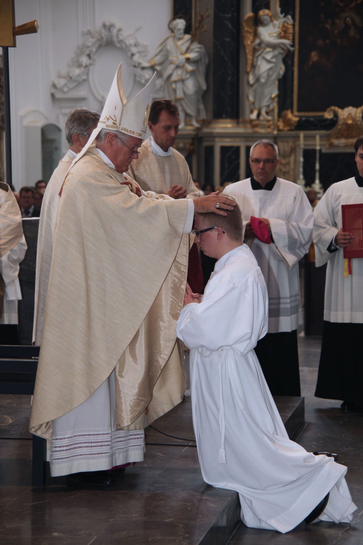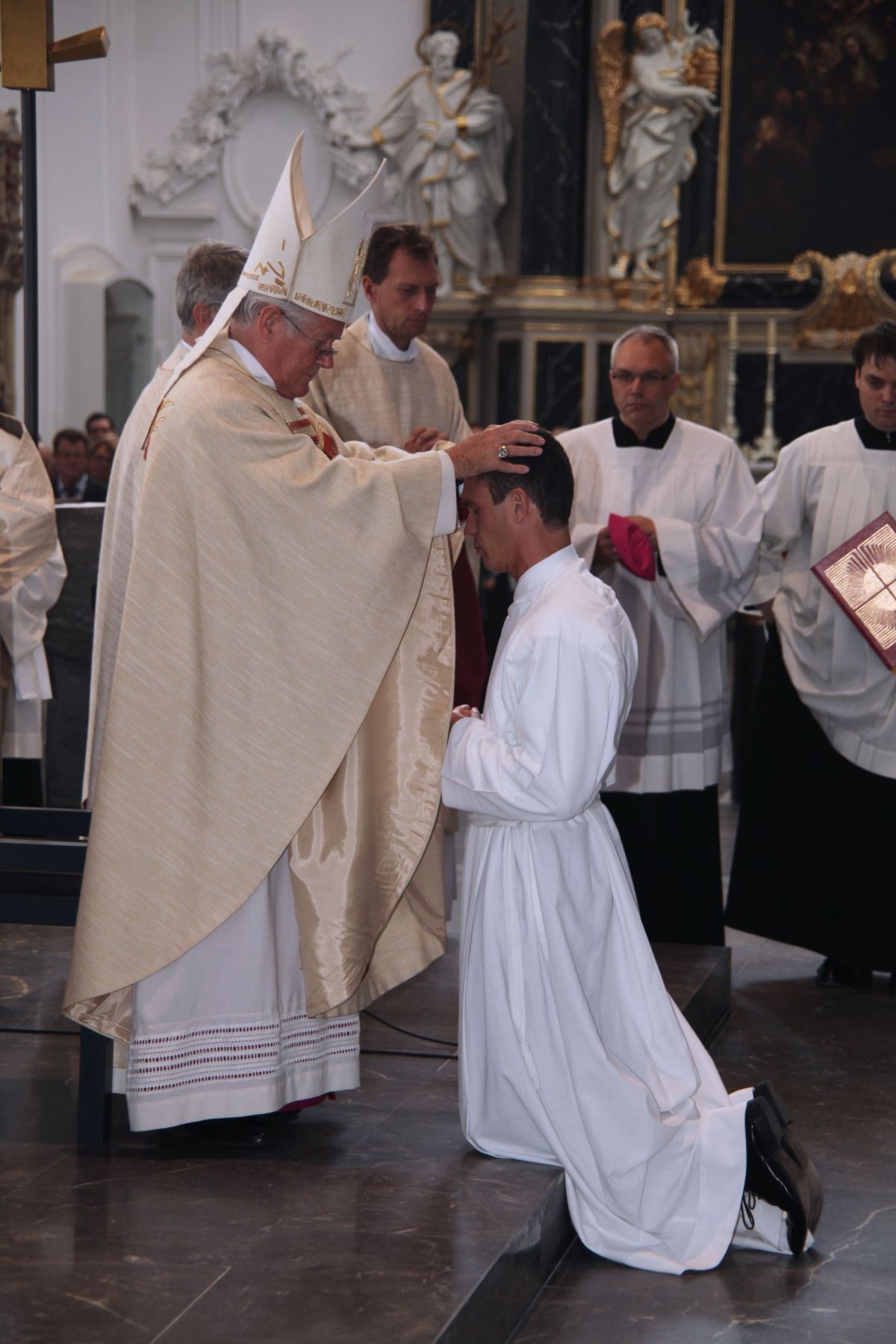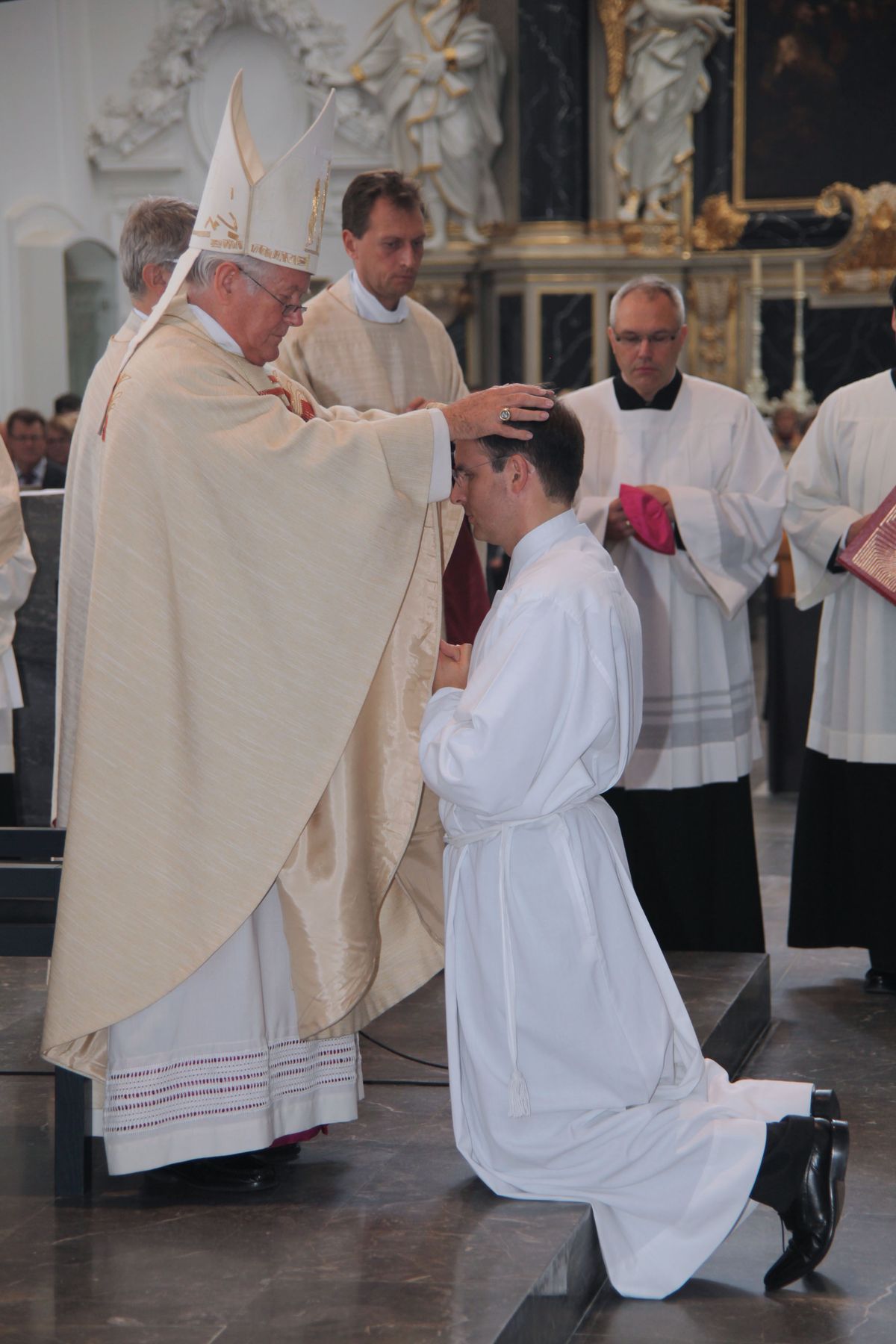 Bei der Anrufung der Heiligen lagen die fünf Männer als Zeichen der Hingabe an Christus ausgestreckt am Boden. Danach legte ihnen Bischof Hofmann schweigend die Hände auf und beauftragte und bevollmächtigte sie zum Diakonendienst. Zum Abschluss sprach der Bischof das feierliche Weihegebet für die Diakone. Bevor die Eucharistie gefeiert wurde, zogen die Praktikumspfarrer den Neugeweihten die Diakonengewänder an. Bischof Hofmann überreichte schließlich das Evangelienbuch, umarmte die Diakone und wünschte ihnen Frieden.
