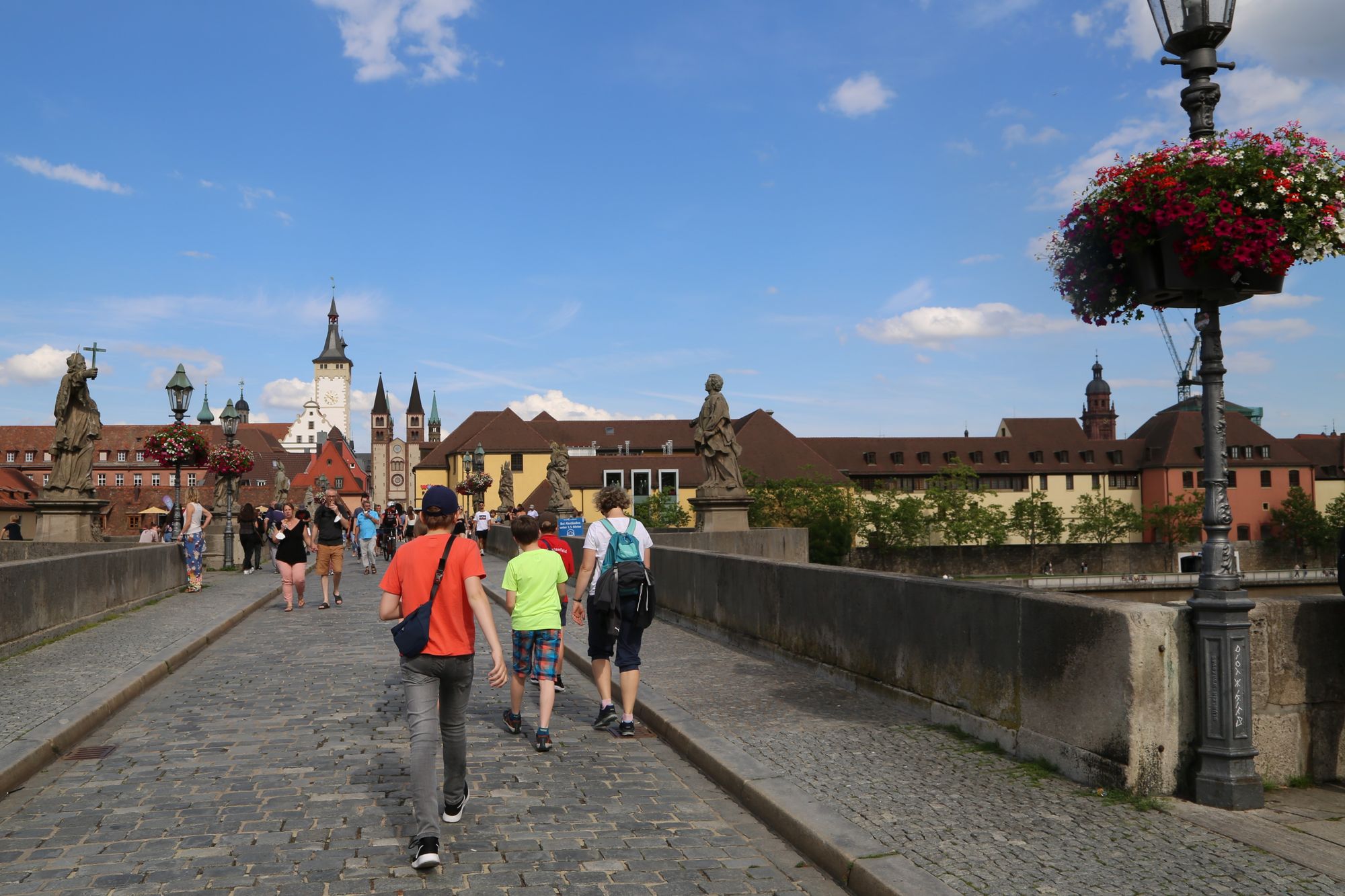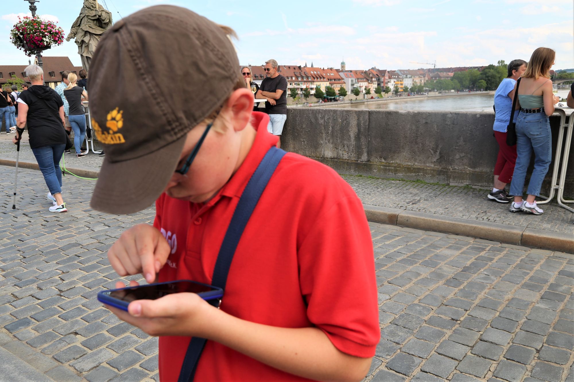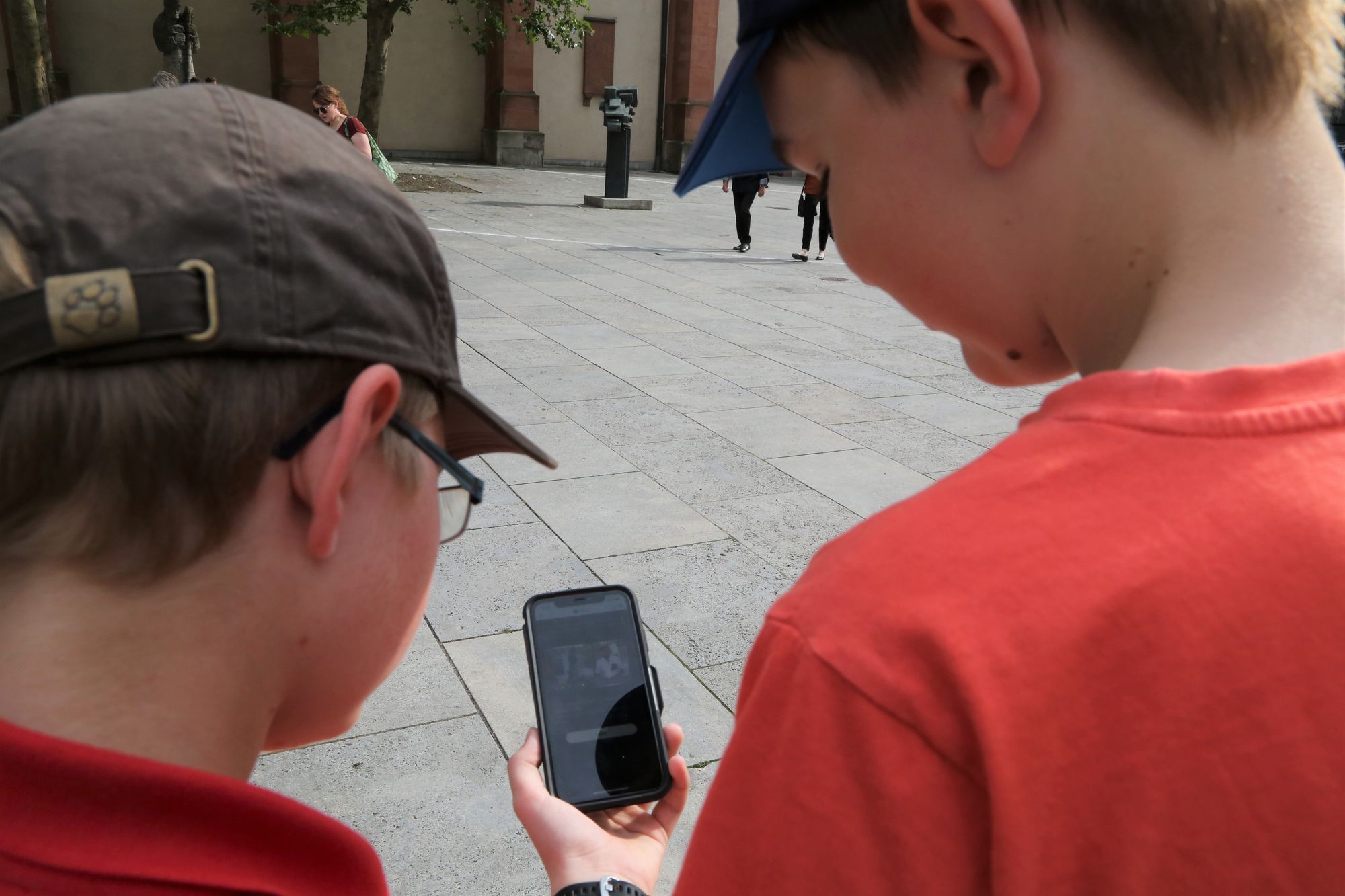 Rätsel lösen wollten fünf Mädchen und Jungen im Alter zwischen sieben und 14 Jahren: Fidelis, Immina, Philipp, Remigius und Simon. „Ein Actionbound ist wie eine Schnitzeljagd, nur mit dem Handy!“, erklärten sie. Nach dem ersten Tipp war jedoch schon klar: „Wir müssen zur Alten Mainbrücke!“ Dem Pfeil auf dem Handy, der wie ein Kompass die Richtung zur nächsten Station vorgab, schenkte die Gruppe ab da nur noch wenig Beachtung. Ähnlich war es bei den folgenden vier Stationen – echte Würzburg-Kenner eben.