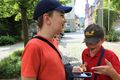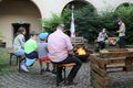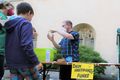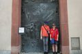 Auf dem Weg zur dritten Station machte die Gruppe einen Abstecher zur Eisdiele. Mit Bananeneis gestärkt, lauschten die Kinder der vierten Botschaft: Burgunda, eine Marktfrau, berichtete authentisch fränkisch, wie sie mit eigenen Augen den Mord an den drei Mönchen mitansehen musste. Beim anschließenden Rätsel war eine Frage: „Wann wurden die Frankenapostel umgebracht?“ Auf Nachfrage, wie ihnen der „Actionbound“ bisher gefällt, antworteten die Mädchen und Jungen: „Subba, sehr informadiv“ – echte Franken eben.