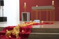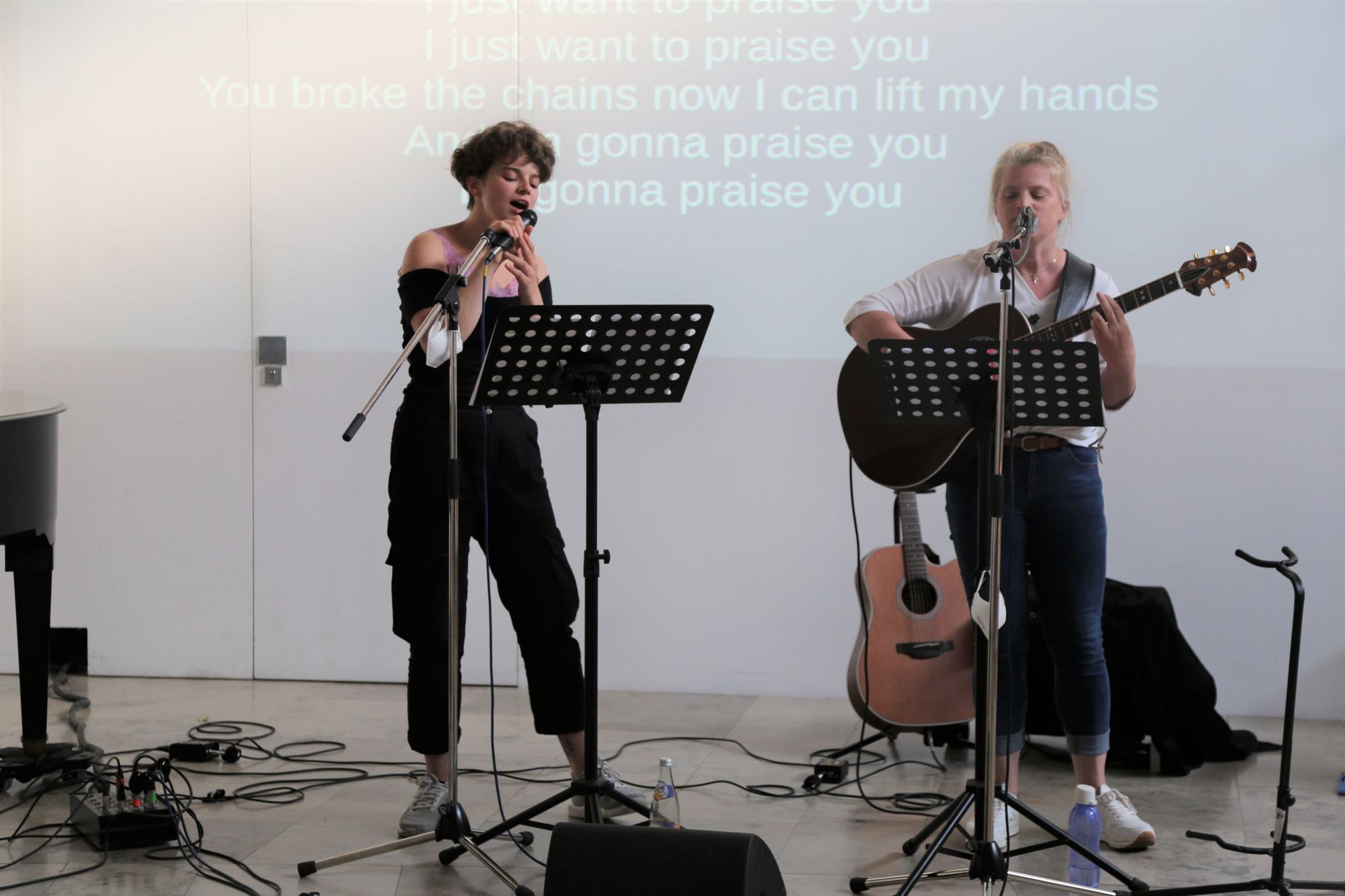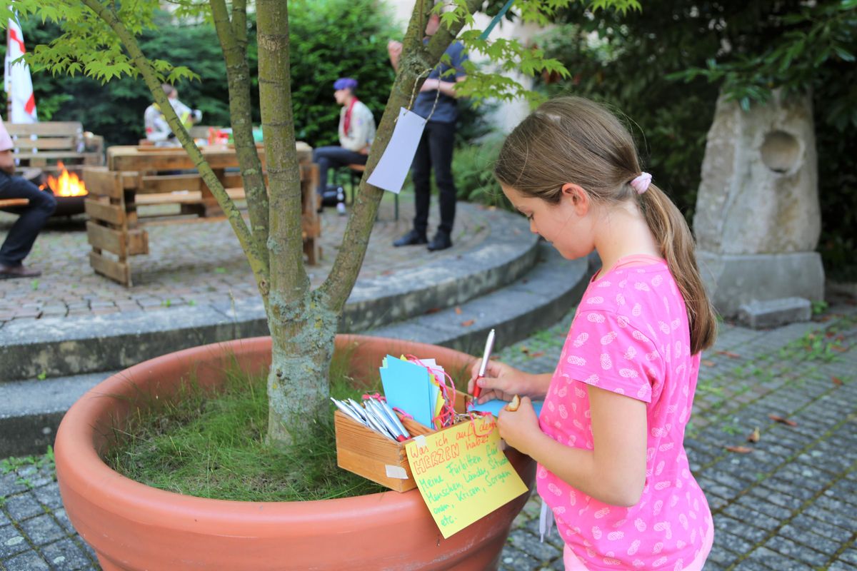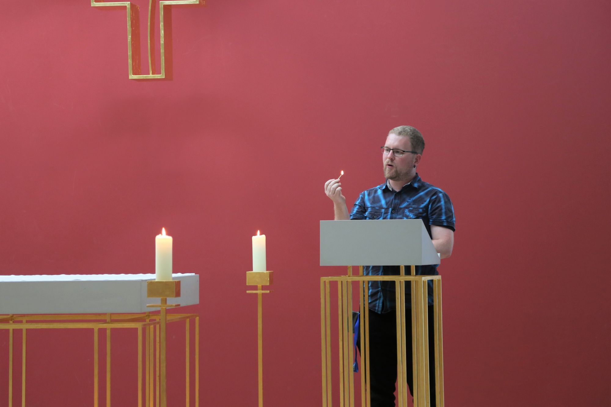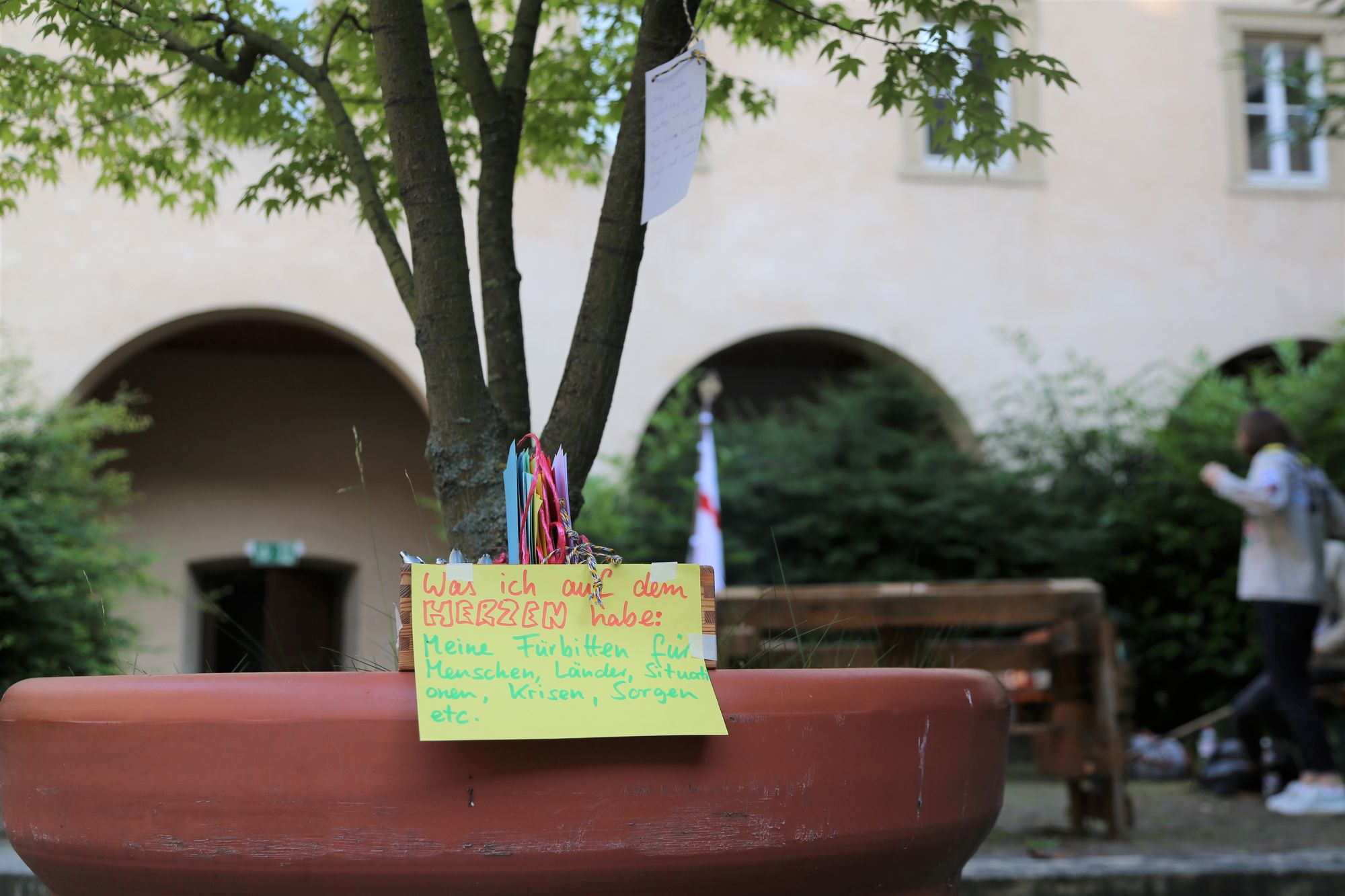 Im Kilianeum-Haus der Jugend hatten die Jogger Gelegenheit, zu duschen und sich umzuziehen. Danach konnte der Gottesdienst mit etwas Verspätung beginnen. Mit moderner Musik und in lockerer Atmosphäre begannen die 20 Jugendlichen unter dem Motto „Inflamed. What would Jesus do?“, den Tag der Jugend zu feiern. Nach der Predigt ging der Gottesdienst im Innenhof des Kilianeums-Haus der Jugend weiter. Dort hatten die Jugendlichen Zeit, sich in Kleingruppen zu den Leitfragen des Gottesdienstes auszutauschen: „Was gibt mir den Mut, neue Dinge zu tun?“, „Was lässt das innere Feuer in mir brennen?“ und „Was trägt mich bei neuen Herausforderungen?“ Um die Feier des Gottesdienstes in den Alltag münden zu lassen, gab es statt vorgefertigten Fürbitten einen Fürbittenbaum. An diesen konnten Zettel mit Sorgen und Bitten befestigt werden. Statt dem Schlusssegen konnte sich jeder eine Klammer mit der Aufschrift „Ich segne dich gerne“ an die Kleidung heften. Damit wurde die Bereitschaft symbolisiert, für andere da zu sein. Um zur Ruhe zu kommen, hatten Pfadfinder des Bezirks Würzburg ein Lagerfeuer vorbereitet, und um den eigenen Hoffnungsfunken zu entzünden, konnte ein Windlicht gebastelt werden. Meier, der den Gottesdienst gemeinsam mit Jugendseelsorger Christian Bargel organisiert hatte, war sehr froh, dass das Wetter hielt: „Ich finde es auch sehr schön, dass die, die sich auf den Tag hier eingelassen haben, mit Feuer und Flamme dabei waren.“