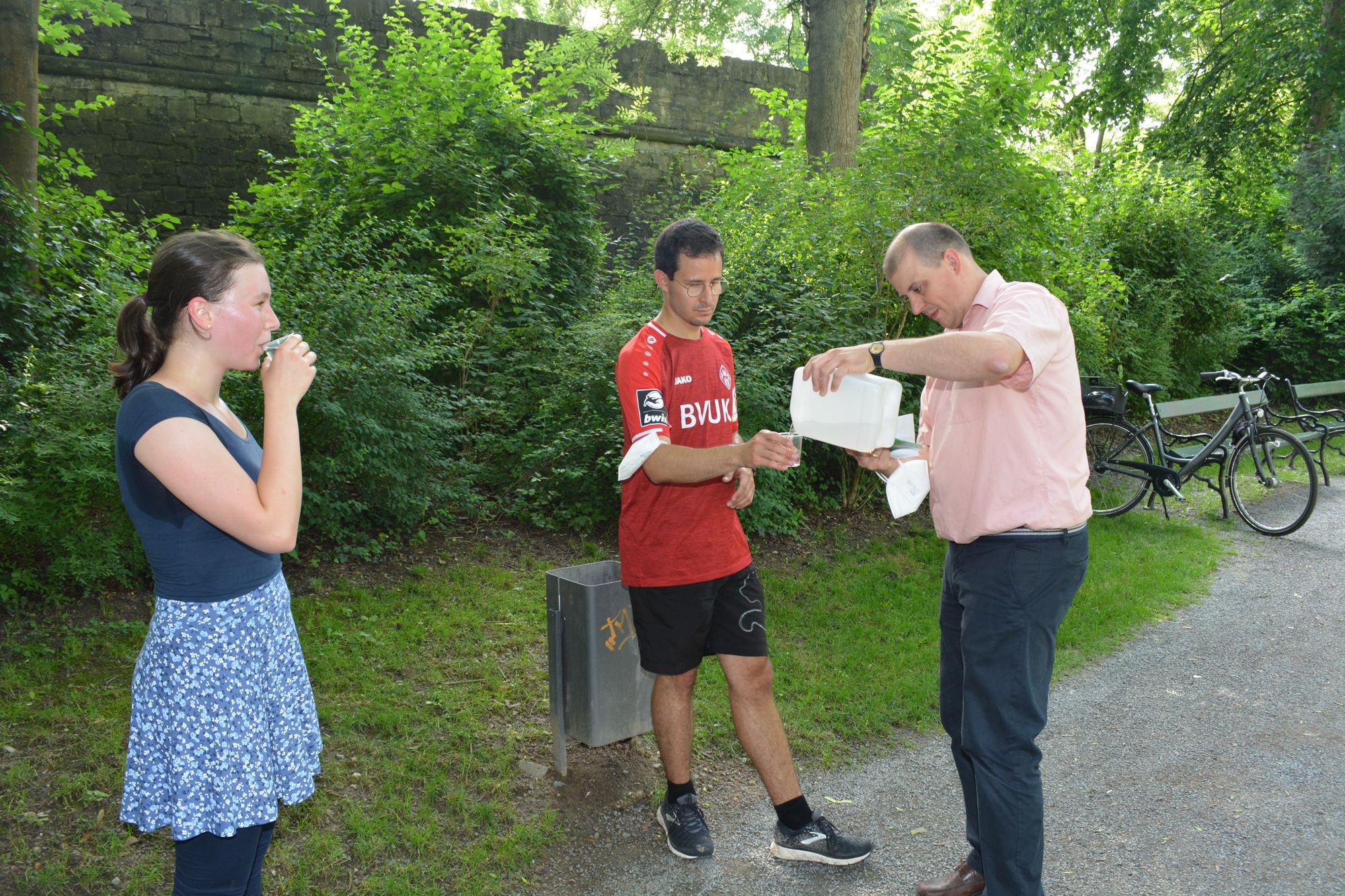 Trotz der Wärme hielten die vier Läufer durch. Im „Klein-Nizza“, einer mit Teichen und Blumenbeeten gestalteten Parkanlage, wurden sie wieder von Meier erwartet. Hier gab es erneut Wasser zum Trinken. Ruhig stehend und atmend hörten die Teilnehmer Meier zu: Die Menschen, die Natur – alles an diesem Ort sei bunt und vielfältig. Diese Vielfalt sei herrlich und verdiene es, mit dem Atem aufgesogen zu werden. Anschließend las Meier Auszüge aus dem Psalm 104 vor: „Preise den Herrn, meine Seele!“