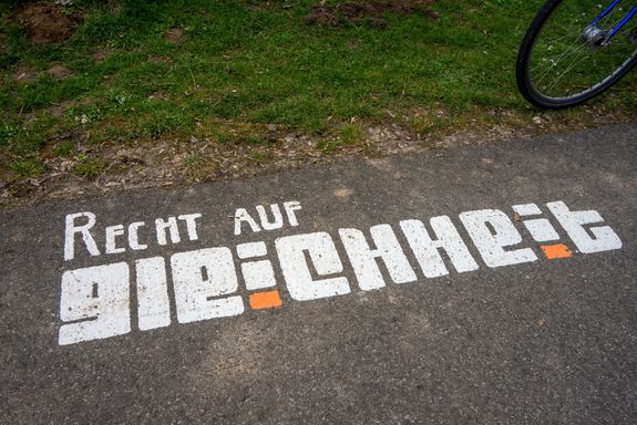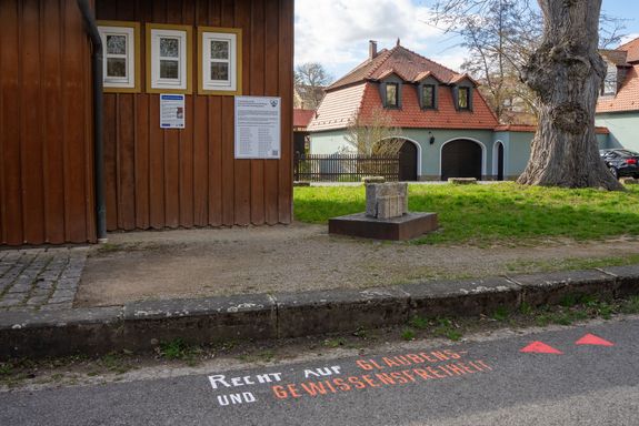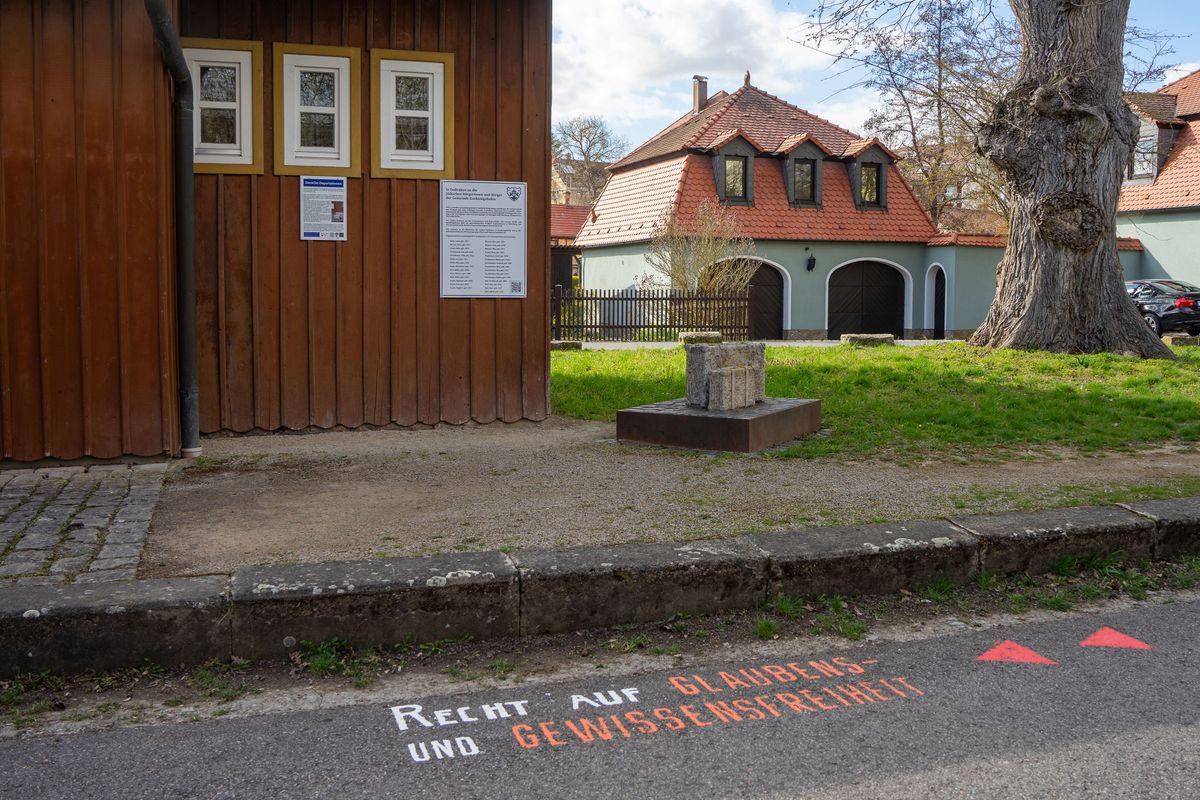Dass das Recht auf Glaubens- und Gewissensfreiheit am alten Bahnhof Gaukönigshofen verortet ist, ist kein Zufall: Im Ort erinnern das Museum „Ehemalige Synagoge“ und die Mikwe an das einst reiche jüdische Leben, ein steinernes Koffer-Denkmal gemahnt an die deportierten Juden. Nachdenklich stimmt die Aufschrift am Ortsende von Baldersheim mit Blick auf das Auber Schloss, wo eine Gemeinschaftsunterkunft der Regierung von Unterfranken untergebracht ist. Die Aufschrift „Recht auf Asyl“ wurde noch vor der Auftaktveranstaltung geschwärzt, berichtet Lörner. Erschreckend sei das gewesen, doch zugleich hätten sich sofort Menschen aus Aub zu Wort gemeldet, die sich klar distanzierten.