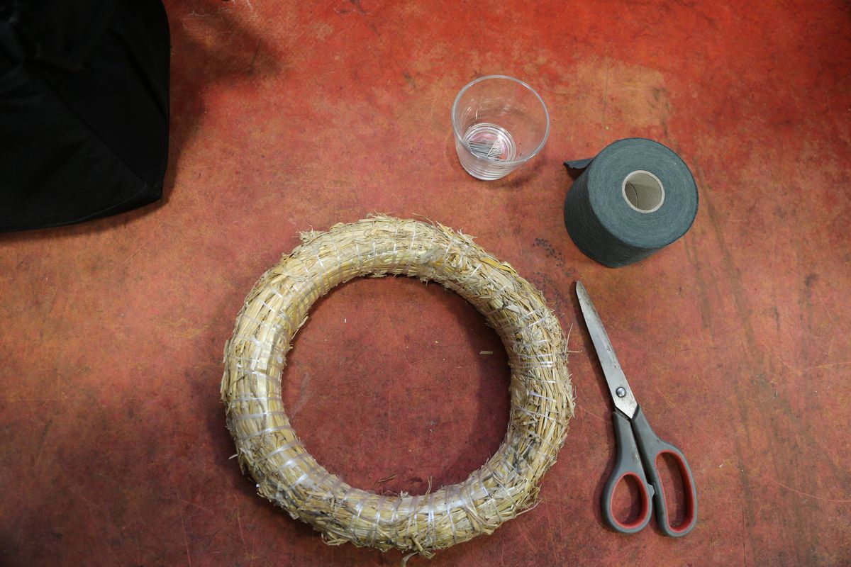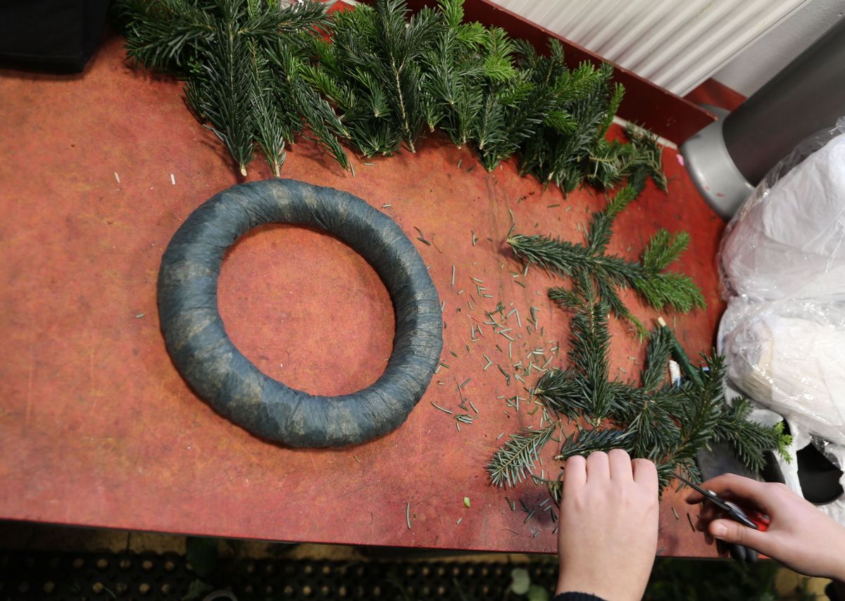 Auf einer Tischplatte bereitet eine Mitarbeiterin die Utensilien vor. Ein Kranz aus Stroh, grünes Wickelband, Bindedraht sowie eine Gartenschere. Sie stellt eine Dose mit Nadeln dazu. „Die sind zum Feststecken, damit der Kranz auch gut hält.“ Vor dem Binden nimmt sie den Strohkranz in die Hand und umwickelt ihn mit dem Wickelband. Dadurch ist das Stroh verdeckt und nicht zwischen den Tannenzweigen sichtbar. Danach steckt sie das Band mit den Nadeln im Kranz fest.