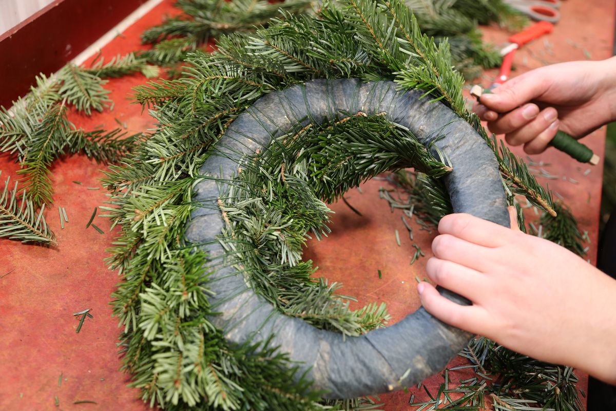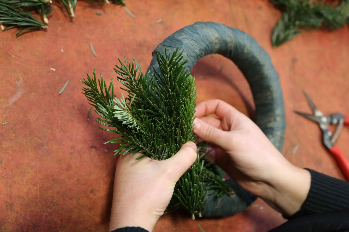 Im Anschluss sucht sie einen neuen Zweig von ihrem Stapel. Sie legt erneut einen größeren Zweig an die Kranzaußenseite an. Die neue Schicht Grün wird dabei leicht über die vorherige Schicht gelegt. „Die Zweige sollten sich immer überlappen, damit keine Lücken entstehen“, erklärt die Mitarbeiterin und zeigt, wie sie die Zweige oberhalb der vorherigen Schicht anlegt. Diese Technik wiederholt sie, bis der ganze Kranz einmal umwickelt wurde. „Das dauert jetzt etwas“, sagt sie zwischendurch. „Es ist etwas mühselig, aber wenn man es richtig macht, sieht der Kranz am Ende schöner und voller aus.“ Wichtig sei es, den gesamten Kranz einmal zu umrunden. Zum Ende hin sollten die Tannenzweige dabei unter die Zweige vom Anfang geklemmt werden, sodass möglichst alle Lücken geschlossen werden. „Sollten trotzdem Lücken entstehen, kann man sie noch nachträglich mit Tannengrün füllen.“
