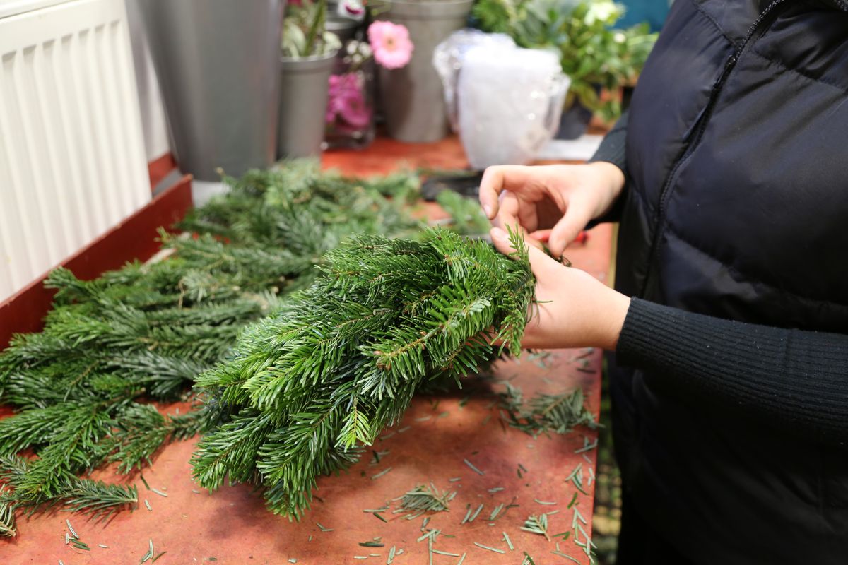 „Jetzt geht es los“, die Mitarbeiterin legt einen großen Stapel Tannenzweige vor sich ab. Die Zweige sind unterschiedlich groß. Sie nimmt jeweils einen Zweig in die Hand und schneidet ihn zurecht. „Die Tannenzweige müssen in unterschiedliche Längen geschnitten werden“, erklärt sie. Dabei sollten kleine, mittlere und große Zweige abgeschnitten werden. Sie entfernt die Stiele, damit der Kranz nicht zu dick wird. Nach und nach stapeln sich Tannenreste auf dem Boden. „Am besten benutzt man möglichst dünne Zweige.“ Sie sortiert die zurechtgeschnittenen Zweige und legt sie vor sich auf dem Tisch ab.