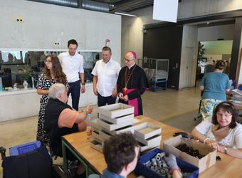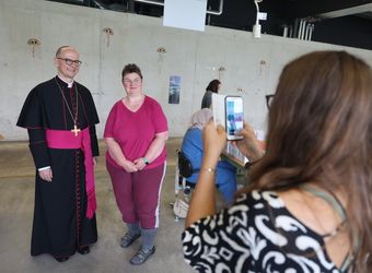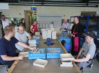 Interessiert zeigte sich der Bischof bei der anschließenden Führung durch die Arbeitsgruppen. Je nach Fähigkeit und Neigung sind die Frauen und Männer dort unter anderem im Verpacken und Montieren beispielsweise von Kleinteilen für die Kraftfahrzeugindustrie tätig. Wiederholt wurde der Bischof um ein gemeinsames Selfie gebeten. Nicht schlecht staunte der Gast aus Würzburg, als ihm eine junge Frau stolz auf ihrem Handy die Rosenkranz-App zeigte, die sie regelmäßig nutze. „Vielen Dank, dass ich heute bei Euch sein durfte“, verabschiedete sich der Bischof in Schmerlenbach. Der nächste Kiliani-Termin erwarte ihn bereits.