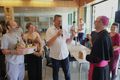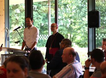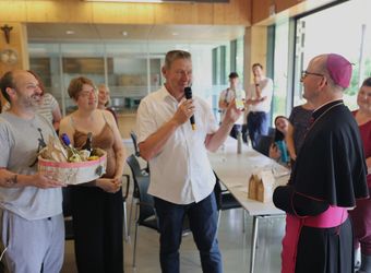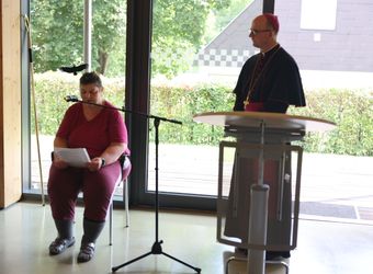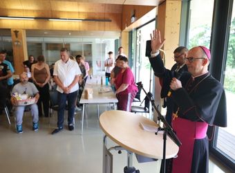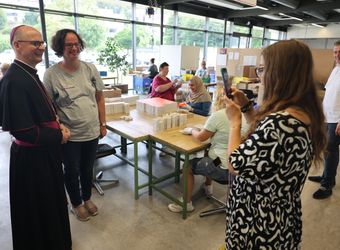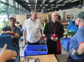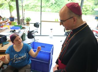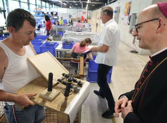 Schmerlenbach (POW) Kiliani findet nicht nur in Würzburg statt: Auch in diesem Jahr ist Bischof Dr. Franz Jung wieder zu einem Kiliani-Gottesdienst während der Wallfahrtswoche aufs Land gefahren. In den Werkstätten der zum Diözesan-Caritasverband Würzburg gehörenden Lebenshilfe Schmerlenbach gestaltete er am Mittwochvormittag, 10. Juli, eine Wort-Gottes-Feier für die dort arbeitenden rund 140 Menschen mit Behinderung und das Betreuerteam. Im Anschluss ließ er sich die Einrichtung zeigen und unterhielt sich mit den dort tätigen Frauen und Männern.
