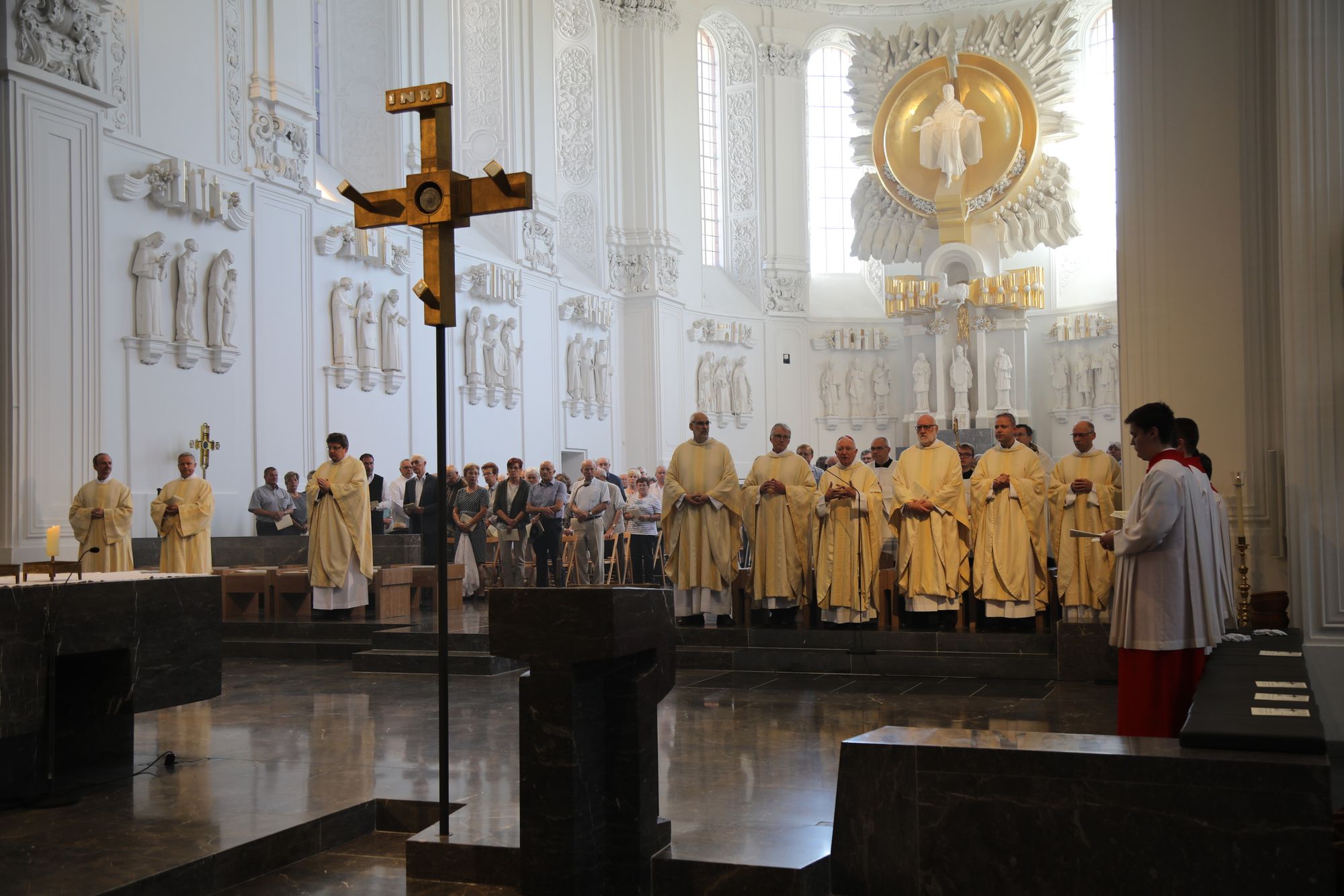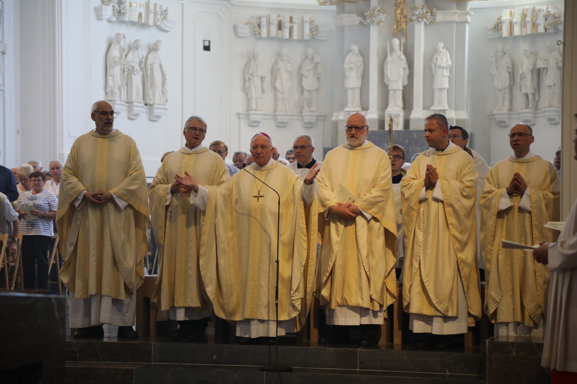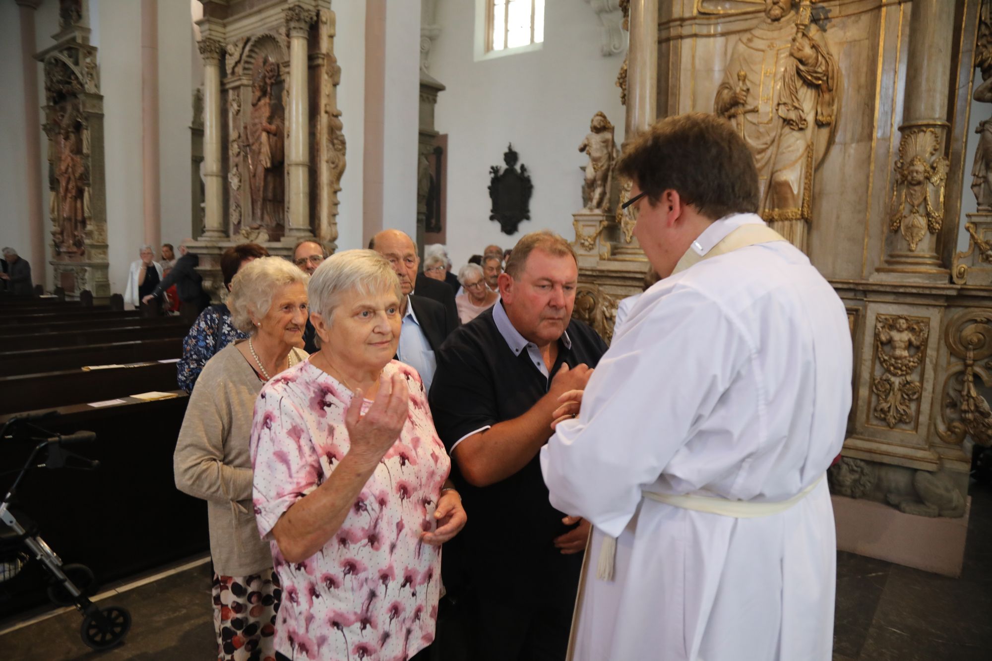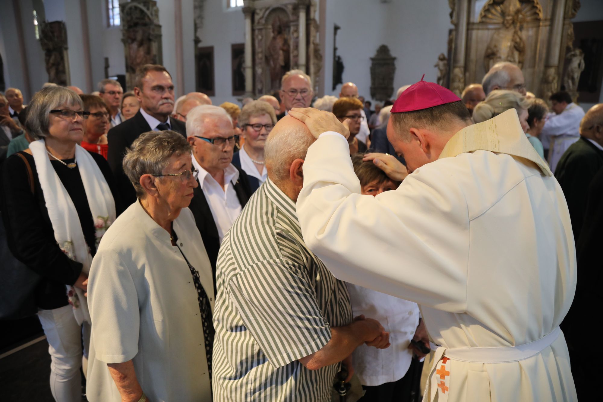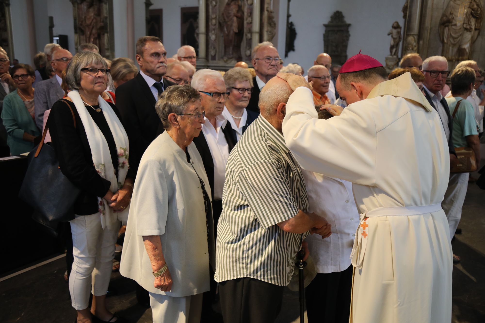 Würzburg (POW) Weihbischof Ulrich Boom hat am Donnerstagvormittag, 4. Juli, mit Ehepaaren aus den Dekanaten Bad Kissingen, Hammelburg, Kitzingen, Ochsenfurt, Schweinfurt-Nord und -Süd sowie der Stadtpfarrei Schweinfurt einen Pontifikalgottesdienst gefeiert, die auf 50, 60 oder 65 gemeinsame Jahre zurückblicken. „Mit ihrem Pilgerweg des Vertrauens – das ist die Ehe – zeigen Sie nicht nur, wie Gott zu den Menschen hält und Christus zur Kirche steht, sondern Sie bestärken uns in der säkularen Gesellschaft, wie Leben gelingen kann. Wo wir in Liebe zueinander stehen und füreinander sorgen, einander ertragen und verzeihen, da wird Vertrauen sichtbar und gestärkt“, sagte der Weihbischof vor rund 1100 Gläubigen im Kiliansdom.