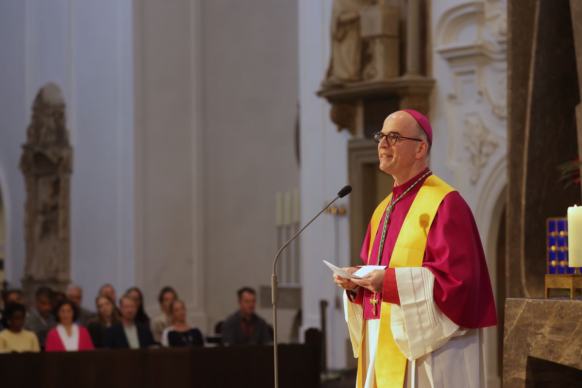 Bischof Jung erinnerte in seiner Predigt an das von Papst Franziskus ausgerufene Heilige Jahr 2025, das unter dem Motto „Pilger der Hoffnung“ steht. Unter dieser Überschrift legte er Psalm 122 aus. Der Bischof erinnerte an die darin beschriebene Freude, „zum Haus des Herrn“ zu ziehen. Das damit gemeinte himmlische Jerusalem sei „Inbegriff der Vollendung“ und stehe für Frieden und Geborgenheit. „In dieser Stadt gibt es nichts Böses mehr. Ihre Tore bleiben Tag und Nacht geöffnet, weil Gott in ihrer Mitte wohnt. Sein Licht durchflutet sie ganz, und allen, die durch ihre Tore einziehen, ist himmlischer Friede verheißen.“ Es sei daher kein Wunder, dass der Pilger im Psalm sich freue, dorthin aufzubrechen. Angesichts einer „zerrissenen Welt“ mahnte Bischof Jung, nicht die Hoffnung zu verlieren. „Der Blick hinauf zum Himmel schenkt uns die Kraft, auf dem Weg nicht zurückzubleiben.“ Jeder Gottesdienst sei ein solcher Aufblick, der neue Kraft und Orientierung schenke.