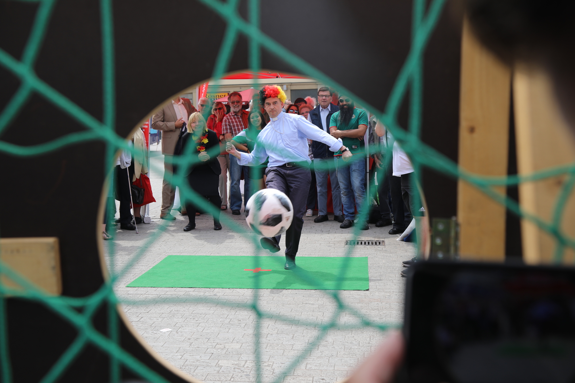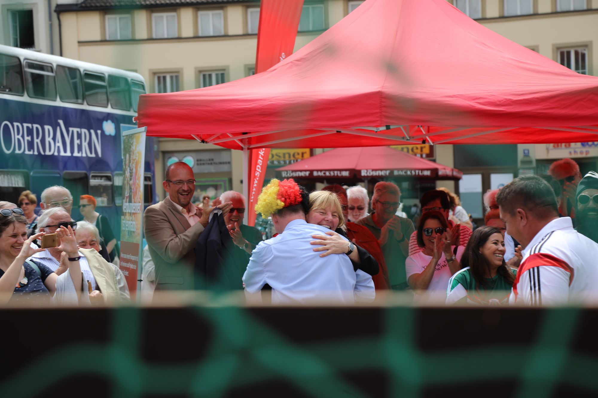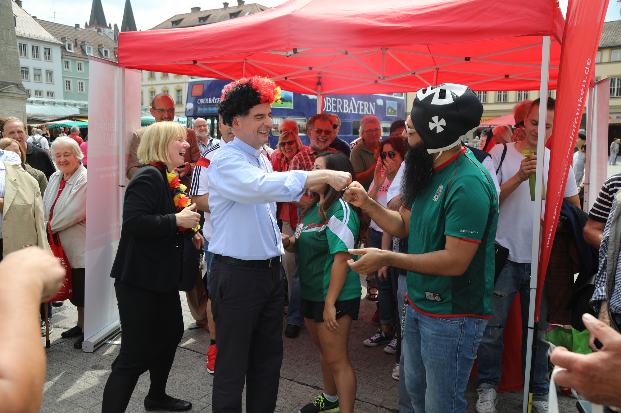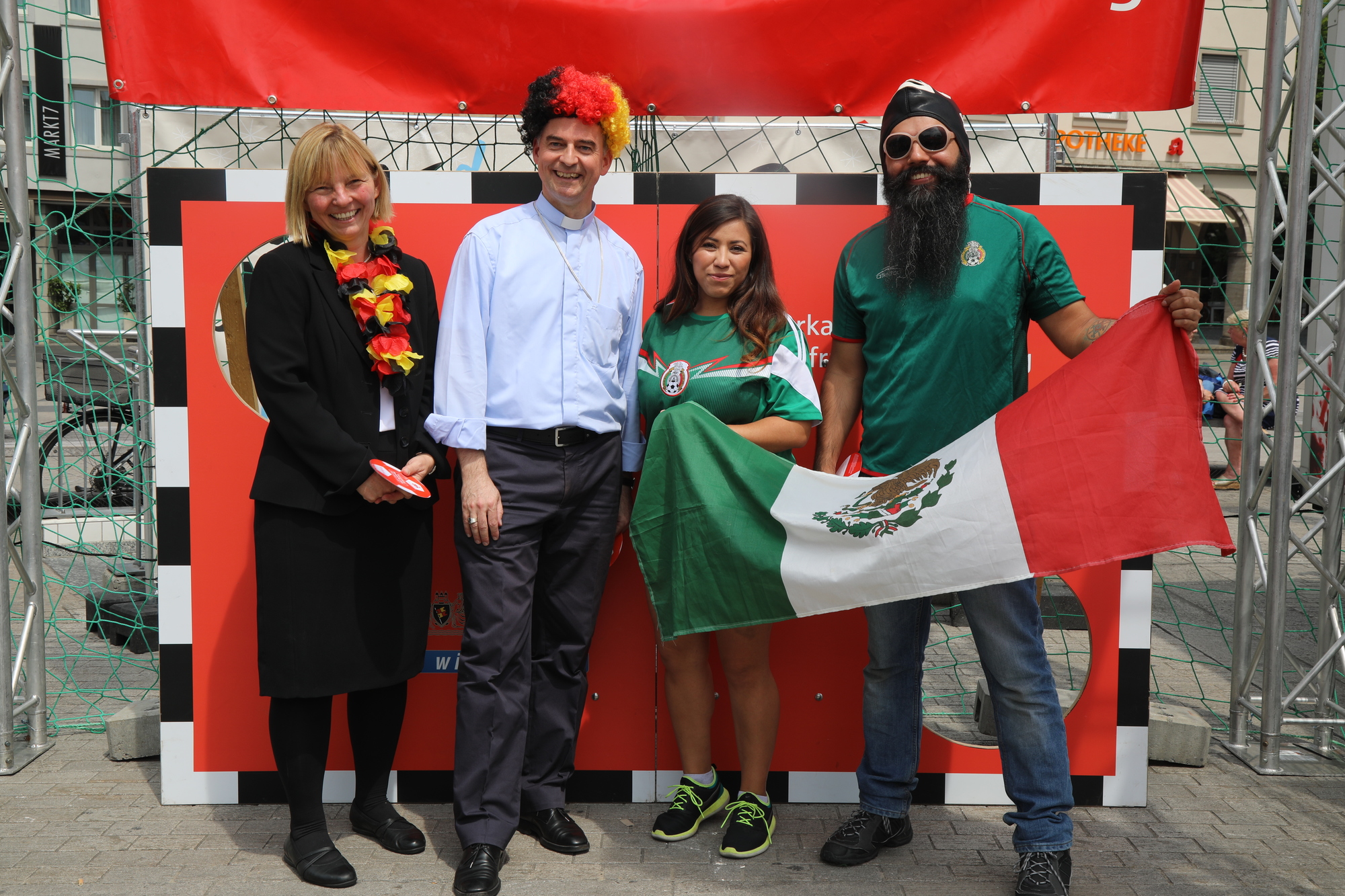 Zumindest, wenn man dem Ergebnis eines am Freitag, 15. Juni, ausgetragenen symbolischen Wettstreits zwischen Vertretern beider Nationen als Vorhersage traut. Als treffsicher erwies sich Bischof Dr. Franz Jung beim Torwandschießen von Main-Post und Sparkasse Mainfranken auf dem Unteren Markt. Dort trat er gemeinsam mit der evangelisch-lutherischen Dekanin Dr. Edda Weise an, um sich im spielerischen Wettstreit mit dem mexikanischen Fotografen Ulises Ruiz und der mexikanischen Studentin Maya Zapata zu messen. Jeder Spieler hatte unten wie oben drei Schuss. Bischof Jung erzielte mit einem Kraftschuss in das linke obere Loch den Siegtreffer. „Ein Glückstreffer“, wie er sagte. Er sei kein geübter Fußballer, erzählte Bischof Jung vor Beginn der Veranstaltung. Seinen letzten Treffer habe er 1987 bei einem Elfmeter während der deutschen Fußballmeisterschaft der Priesterseminare erzielt.