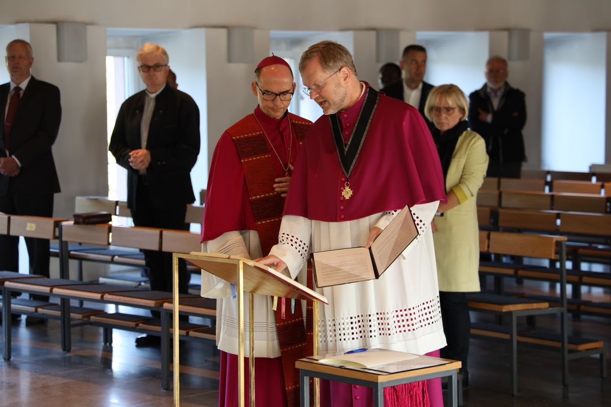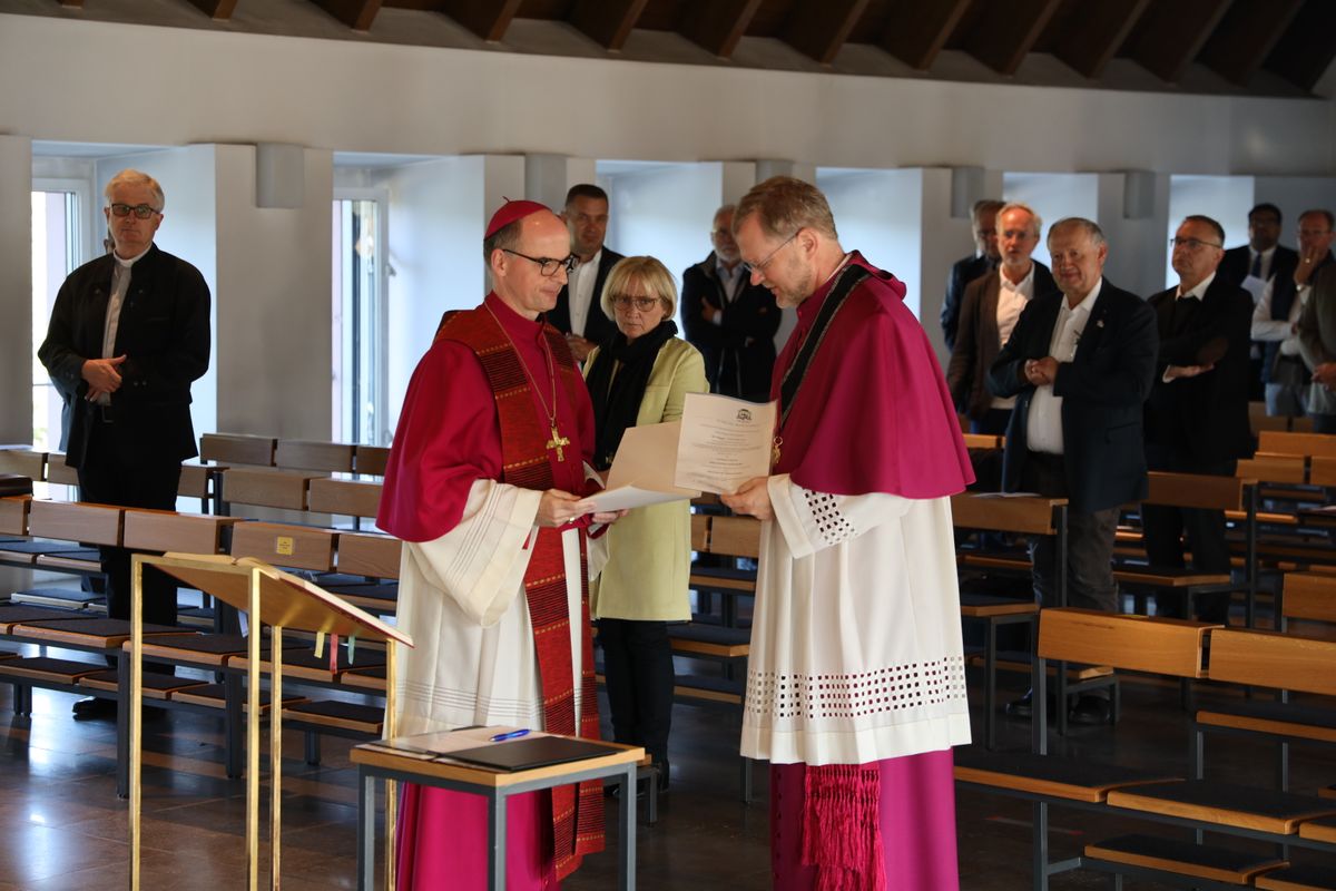 In der Hauskapelle des Würzburger Exerzitienhauses Himmelspforten sprach der Generalvikar im Beisein der Mitglieder des Allgemeinen Geistlichen Rats und der Dekanekonferenz das Große Glaubensbekenntnis und legte sein Treueversprechen ab. Bischof Jung legte in einer kurzen Ansprache das Tagesevangelium aus. Er betonte, dass Jesus jeden Tag sein „Folge mir nach“ spreche. Es gelte, diesen Ruf zu hören und der Berufung zu folgen, in dem was Gott einem zumute und zutraue. Jesus halte mit Zöllnern und Sündern Mahl. In gleichem Maße sei es heute wichtig, die Grenzen der Gemeinden zu überwinden und dort das Evangelium vorzuleben und zu verkündigen, insbesondere im Blick auf die „Pastoral der Zukunft“. Wie Bischof Jung weiter erzählte, habe er als Generalvikar in Speyer innerhalb kurzer Zeit erfahren, wie wichtig es sei, „in die Schule der Barmherzigkeit“ zu gehen. „Ich habe gelernt, Verantwortung zu übernehmen und den Dingen hinterher zu gehen.“ Dabei habe er verstanden, dass jeder Mensch schwach sei. „Aber Gott will gerade mit Sündern den Weg gehen“, betonte Bischof Jung. Die öffentliche Vorstellung von Generalvikar Vorndran findet am Sonntag, 27. September, um 10 Uhr bei einem Pontifikalgottesdienst im Kiliansdom statt.