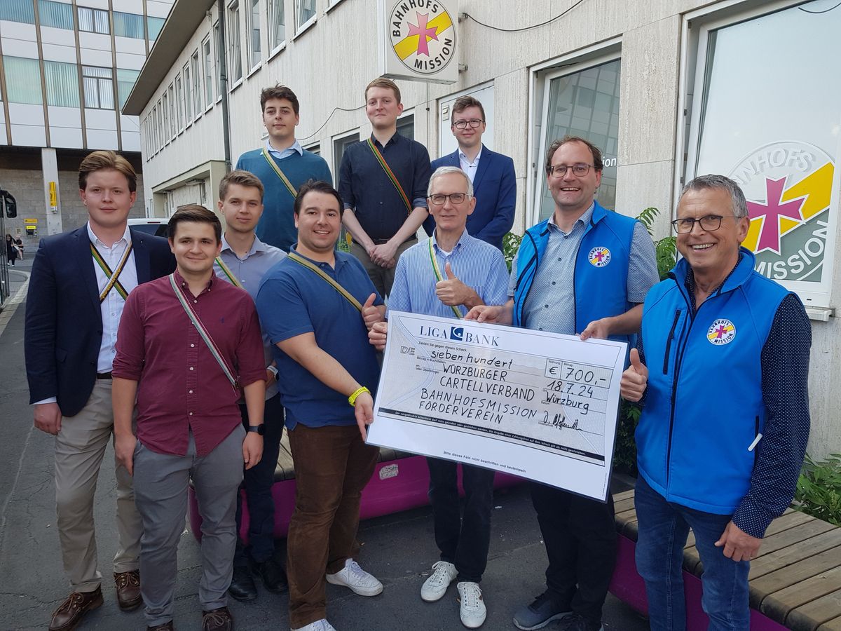Das Geld ist der Erlös eines Wohltätigkeitskonzerts in der Würzburger Residenz, heißt es in einer Pressemitteilung. Vier Ensembles des Heeresmusikkorps aus Veitshöchheim musizierten im Kaisersaal. Gastgeber waren Johannes Wald als Ortsverbandsvorsitzender, begleitet von Ortsverbandsschriftführer Silas Schneider und Ortsverbandskassier Timon Hecker sowie Dieter Pfaffenzeller als Vorsitzender des Vereins „CV in Würzburg e. V.“. Vertreter aller fünf Studentenverbindungen des Würzburger Cartellverbands kamen zur Spendenübergabe an den Hauptbahnhof. Nach einer Führung kam die Gruppe mit Kilian Bundschuh, ehrenamtlicher Mitarbeiter beim Förderverein der Bahnhofsmission, und Michael Linder-Jung, Leiter der Würzburger Bahnhofsmission, ins Gespräch. Die Besucher erfuhren, dass die Anzahl der Hilfesuchenden sich in den vergangenen Jahren verdoppelt habe. Auch wurde von den laufenden Projekten wie dem „Projekt Mutmacher“ gesprochen. Hier bietet die Bahnhofsmission gemeinsam mit der Deutsche Bahn Stiftung Hilfe zur Selbsthilfe an und berät zum Beispiel in Sucht- und Schuldenfragen. Somit werde ein nachhaltiges Konzept zur Unterstützung geboten. Lindner-Jung hob hervor, dass die Institution unabhängig von Herkunft, Alter oder sozialer Stellung Hilfe anbiete. „Unsere Einrichtung ist ein Ort, in dem jeder Mensch filterlos willkommen ist.“ Bundschuh ergänzte, dass die Einrichtung „von der Tasse Tee bis zur professionellen Beratung“ helfe ‒ und das als eine von bundesweit sechs Bahnhofsmissionen sogar 24 Stunden am Tag.