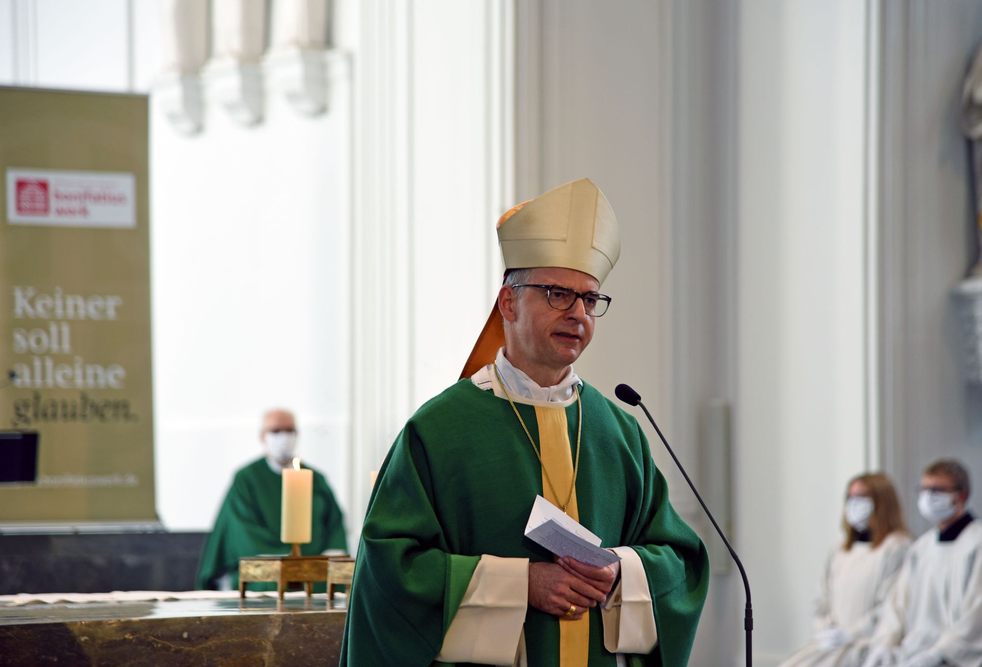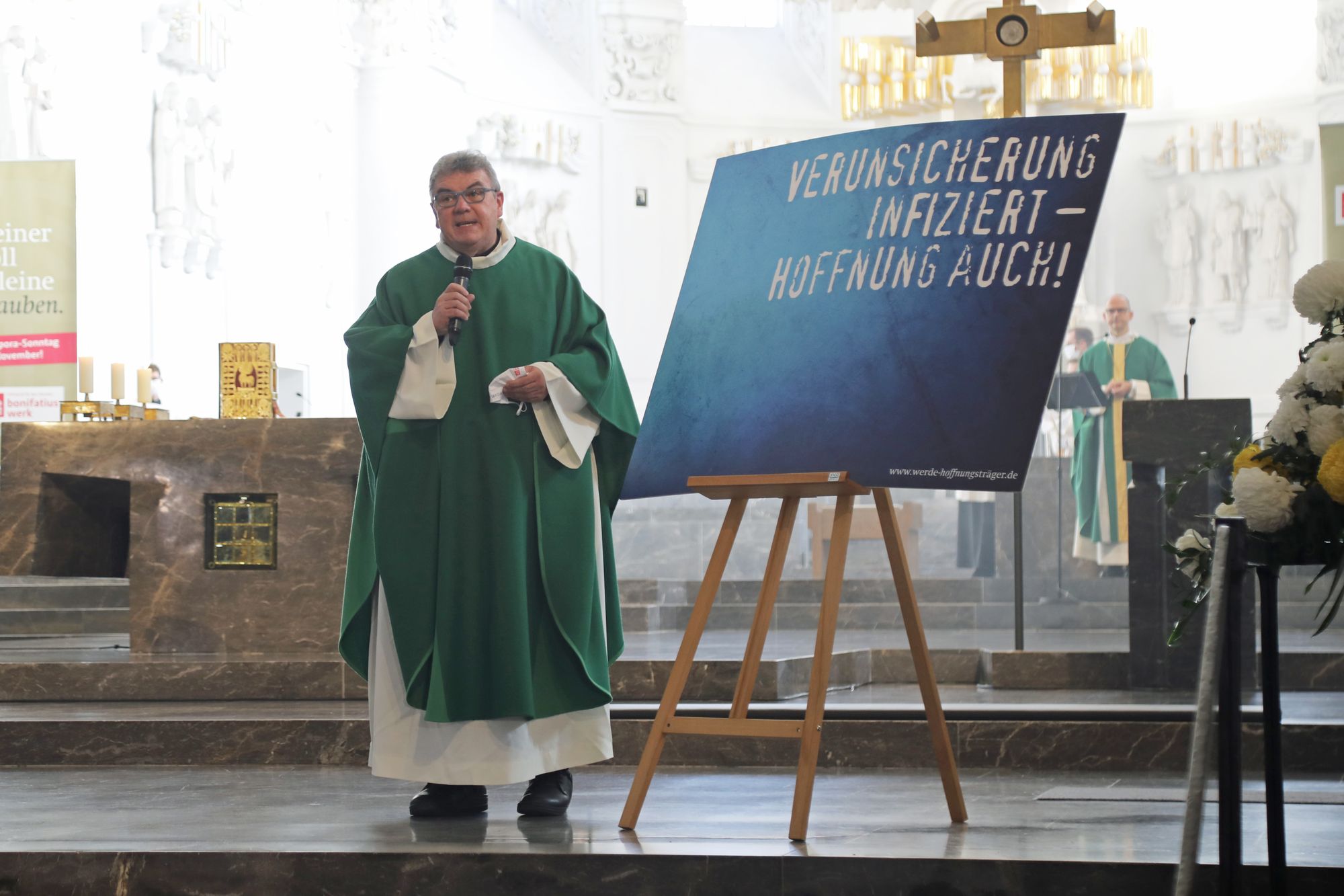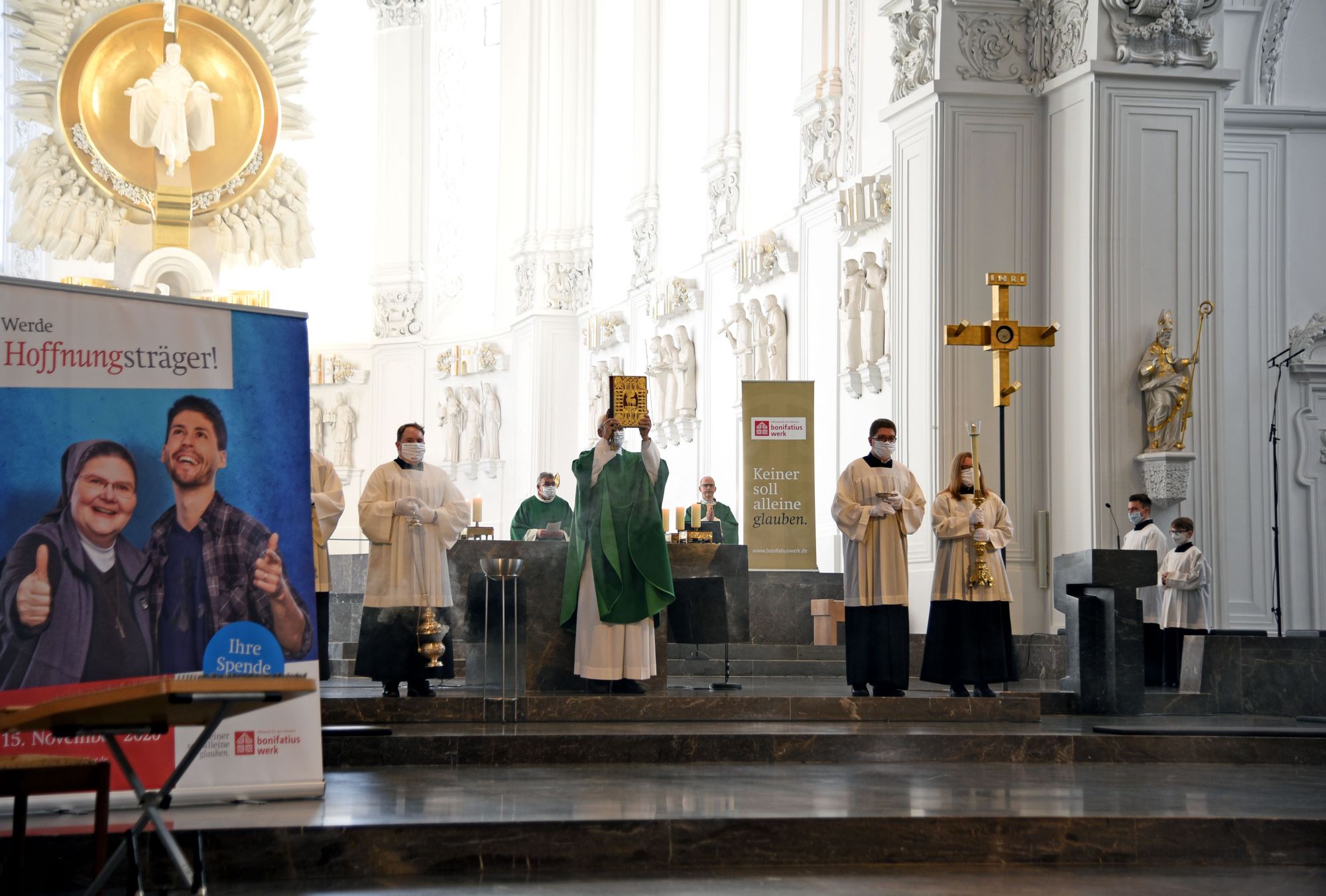 Eröffnet wurde die Aktion zu Beginn des Gottesdienstes durch den Generalsekretär des Bonifatiuswerkes, Monsignore Georg Austen, mit Schwester Lydia Kaps vom Kinder- und Jugendzentrum Don Bosco in Magdeburg. „Trotz Corona geht die Arbeit in unseren Hilfsprojekten weiter. Dabei gibt es notwendige pastorale und soziale Projekte, die gerade in dieser herausfordernden Zeit Menschen auf unterschiedliche Weise unterstützen, die es zu fördern gilt. Viele Menschen sind auf unser Gebet und unsere Solidarität angewiesen. Der Spagat von Abstand halten und Nähe suchen, von Hoffnung geben und Solidarität zeigen, gehört in Gebet, Wort und Tat erkennbar zusammen. Vielleicht werden wir als Kirche nicht mehr von allen als systemrelevant angesehen, aber durch unsere konkrete Hilfe sind wir mehr und in diesem Sinn existenzrelevant für den Menschen“, sagte Monsignore Austen. Corona heiße nicht, dass wir alleine glauben.