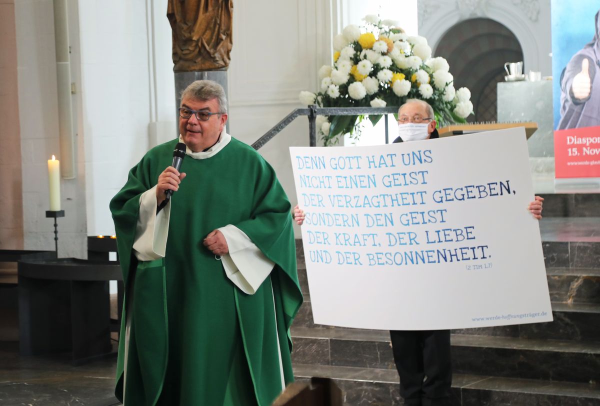 Die diesjährige Diaspora-Aktion steht unter dem Leitwort „Werde Hoffnungsträger“ und soll die Aufmerksamkeit auf die Schwestern und Brüder richten, die in der Diaspora, in der Zerstreuung, leben. In seiner Predigt sagte Bischof Jung, Diaspora oder Zerstreuung bedeuten in diesen Tagen des teilweisen Lockdowns mehr als nur eine konfessionelle Minderheitensituation. „Unser Land durchlebt angesichts der Corona-Pandemie insgesamt eine Diaspora-Erfahrung. Wegen der Einschränkungen können wir nur noch wenige Familienangehörige und Freunde treffen. Wir leben aufgrund der Kontaktbeschränkungen gewissermaßen alle in der Diaspora. Das Motto könnte deshalb kaum besser gewählt sein, auch wenn bei der Planung die jetzige Situation wahrscheinlich noch nicht im Blick war. Aber das macht nichts. Hoffnungsträger werden zu allen Zeiten benötigt, aber jetzt sicher besonders dringlich“, sagte Bischof Jung.