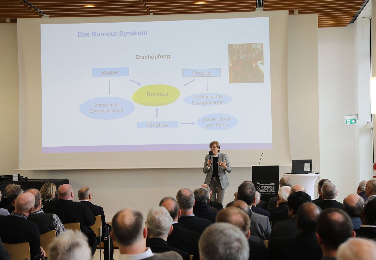 Der Umbruch in der Kirche, der unter anderem mit Personalmangel, einem Anstieg der Bürokratie und hohen Rollenerwartungen einhergehe, habe Auswirkungen auf die Gesundheit der Seelsorger, sagte Jentschke. Sie ist Psychologin, Psychotherapeutin, Vorsitzende des Klinischen Ethikkomitees sowie Leiterin der Abteilung für Psychoonkologie und Palliativpsychologie am Universitätsklinikum Würzburg. Studien hätten ergeben, dass 13 Prozent der Priester von Burn-out betroffen und 33 Prozent gefährdet seien. „Stress entsteht, wenn die Bewältigungsstrategien nicht mehr mit den Veränderungen Schritt halten“, erklärte sie. Dabei liefen im Körper die gleichen Mechanismen ab wie vor Jahrtausenden, als die Menschen noch vor wilden Tieren flüchten mussten. Als Beispiele nannte sie etwa einen erhöhten Blutdruck oder ein gehemmtes Immunsystem. Nicht kompensierter Stress könne zu Symptomen wie Tinnitus, Zähneknirschen, Depressionen oder kognitiven Einschränkungen führen. Sie nannte auch Herz-Kreislauf-Erkrankungen oder Schlaganfälle als mögliche Langzeitfolgen.