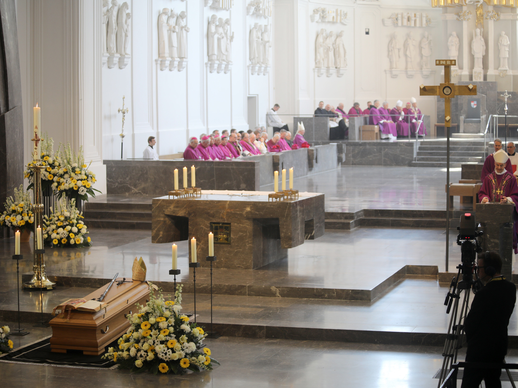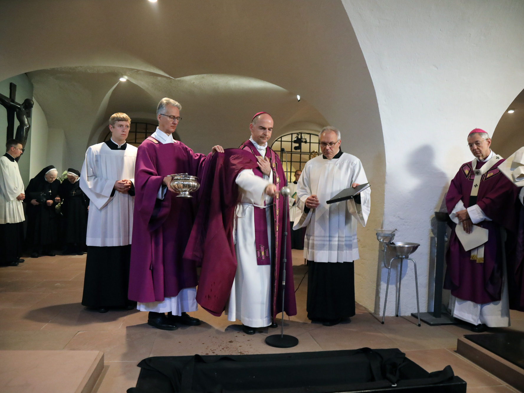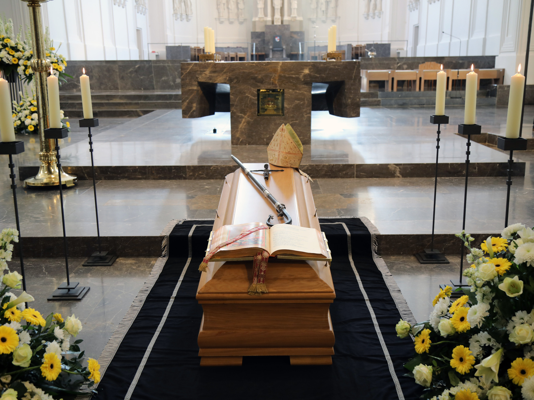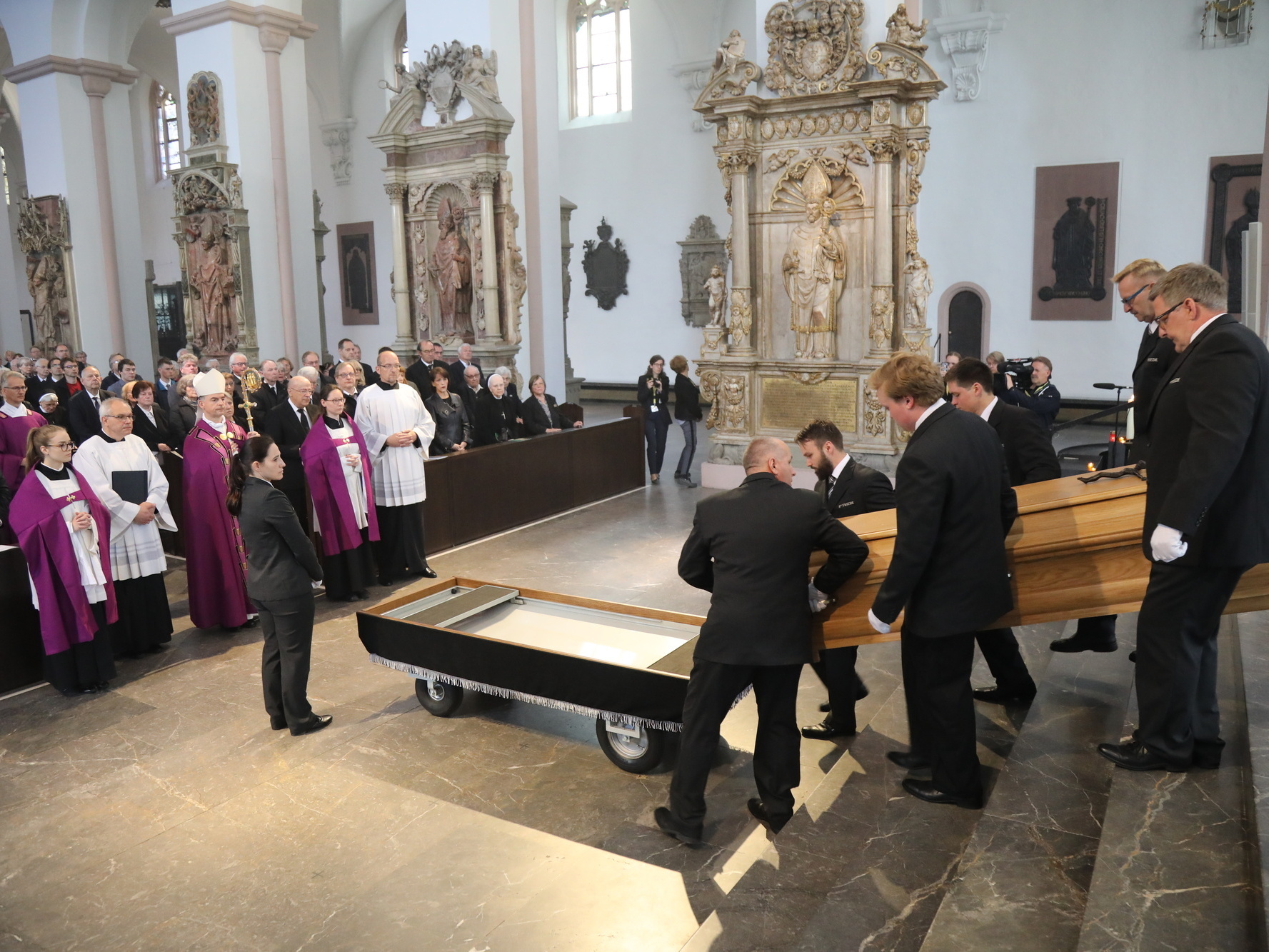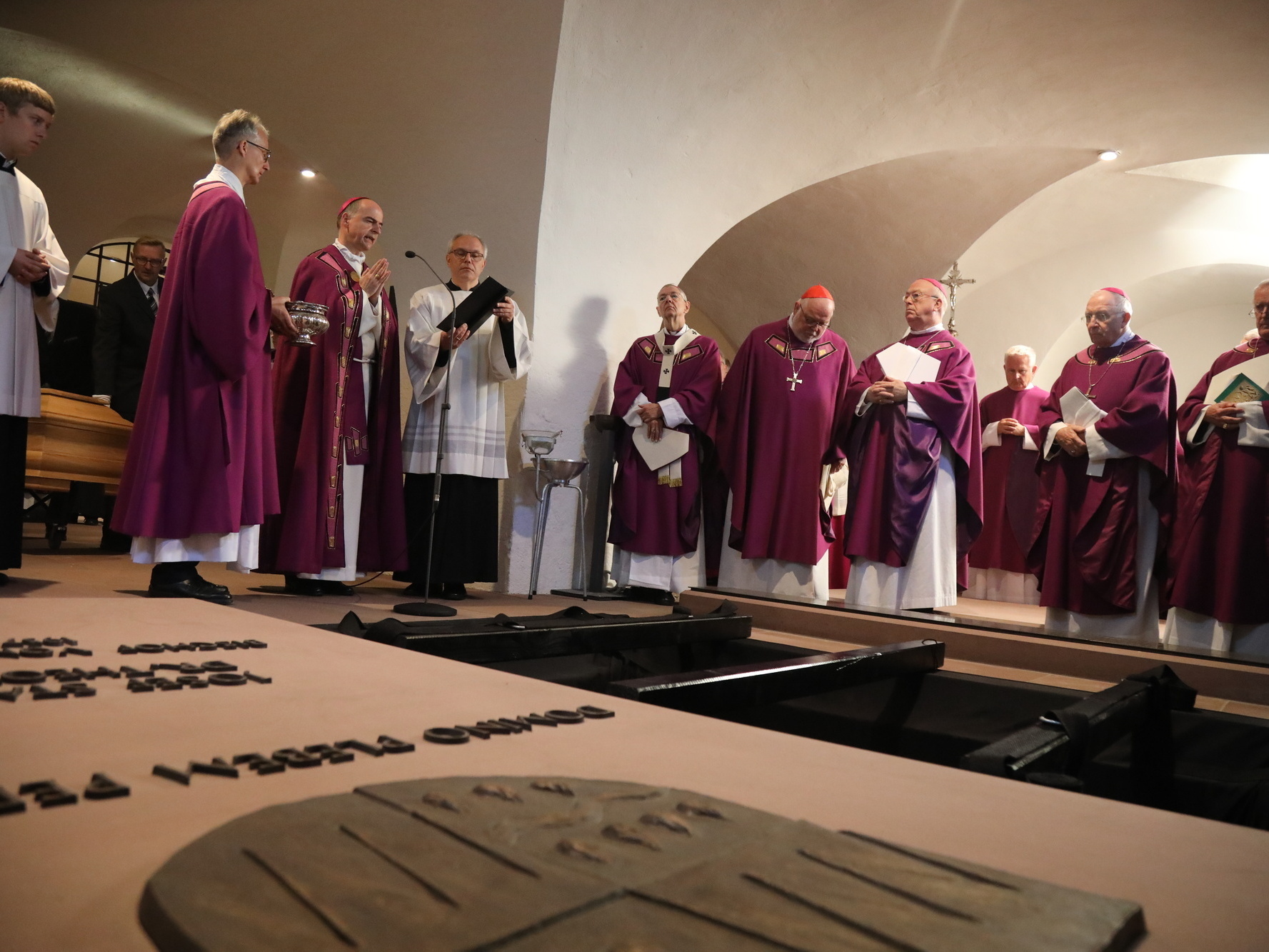 Würzburg (POW) Abschied von einem beliebten Hirten: Unter großer Anteilnahme von Gläubigen aus dem gesamten Bistum Würzburg und Trauergästen aus ganz Deutschland ist Bischof em. Dr. Paul-Werner Scheele am Samstag, 18. Mai, in der Krypta des Kiliansdoms beigesetzt worden. Rund 1000 Personen feierten gemeinsam mit Bischof Dr. Franz Jung, den Kardinälen Reinhard Marx und Friedrich Wetter sowie einer großen Zahl von Erzbischöfen, Bischöfen und Weihbischöfen das Requiem. Benediktinerpater Augustinus Sander aus Rom vertrat den Päpstlichen Rat für die Einheit der Christen. Für die evangelisch-lutherische Kirche nahm Regionalbischöfin Gisela Bornowski teil. Unter den zahlreichen Vertretern des öffentlichen Lebens waren auch Landtagspräsidentin a. D. Barbara Stamm sowie der bayerische Staatsminister a. D. Professor Dr. Winfried Bausback. In einem Trauerzug wurde nach dem Schlusssegen der Sarg mit dem Leichnam des Verstorbenen durch den Mittelgang und das Seitenschiff in die Krypta unter dem Dom geleitet. Dort wurde die sterbliche Hülle von Bischof Scheele im Grab neben seinem direkten Vorgänger Josef Stangl beigesetzt.