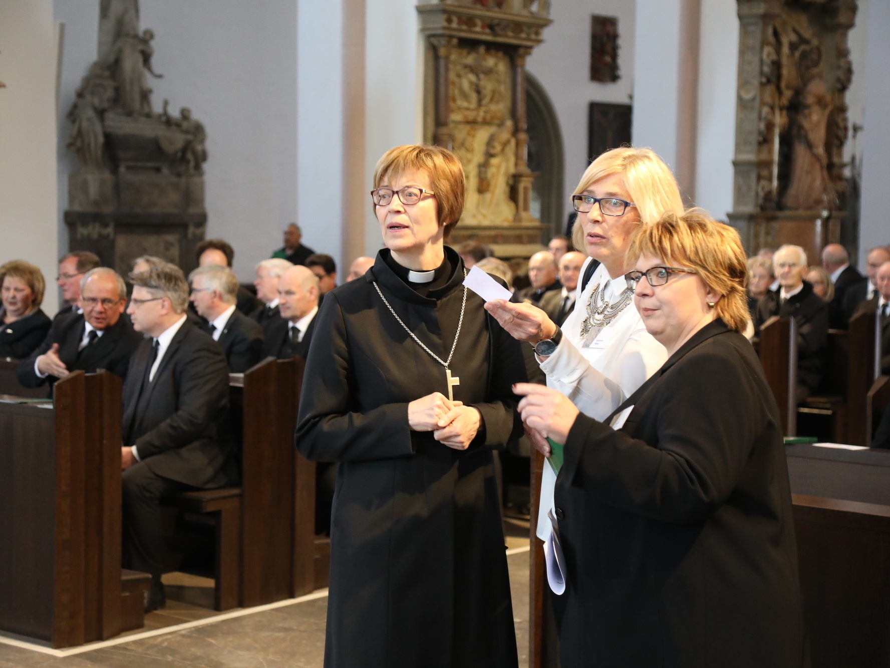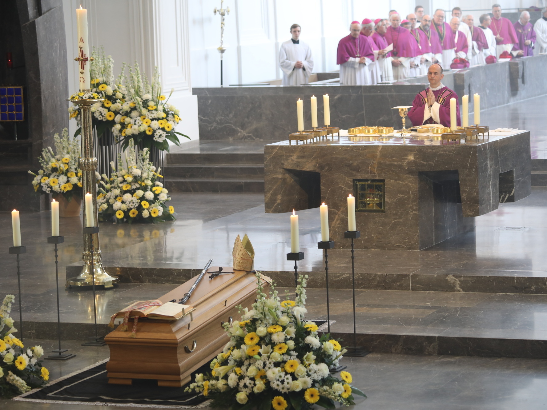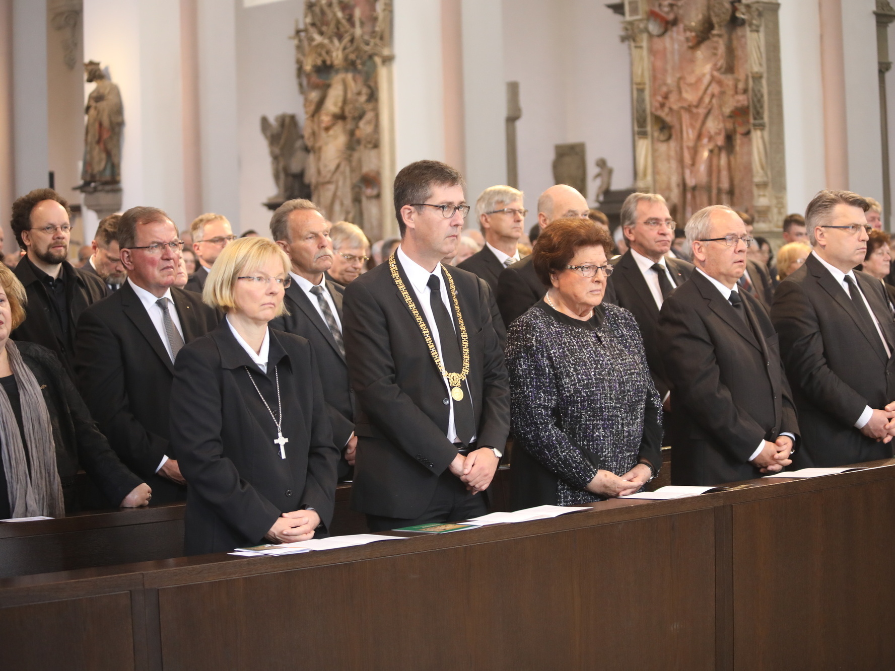 Auch in den Fürbitten wurde Bezug auf das vielfältige Wirken von Bischof Scheele genommen. So beteten die Gläubigen für alle Theologen, für die christlichen Glaubensgeschwister, für alle, die in der Musik die Herrlichkeit Gottes verkünden. Um Gottes Hilfe gebetet wurde auch für alle Kunstschaffenden und die Menschen, die in und durch die Kunst etwas von Gottes Heil entdecken. Außerdem für Irland, die Heimat der Frankenapostel, und die Menschen in den Partnerbistümern Mbinga und Óbidos sowie alle, denen Bischof Scheele verbunden war wie seiner Familie im Sauerland, den Menschen im Erzbistum Paderborn und allen bereits verstorbenen Weggefährten.