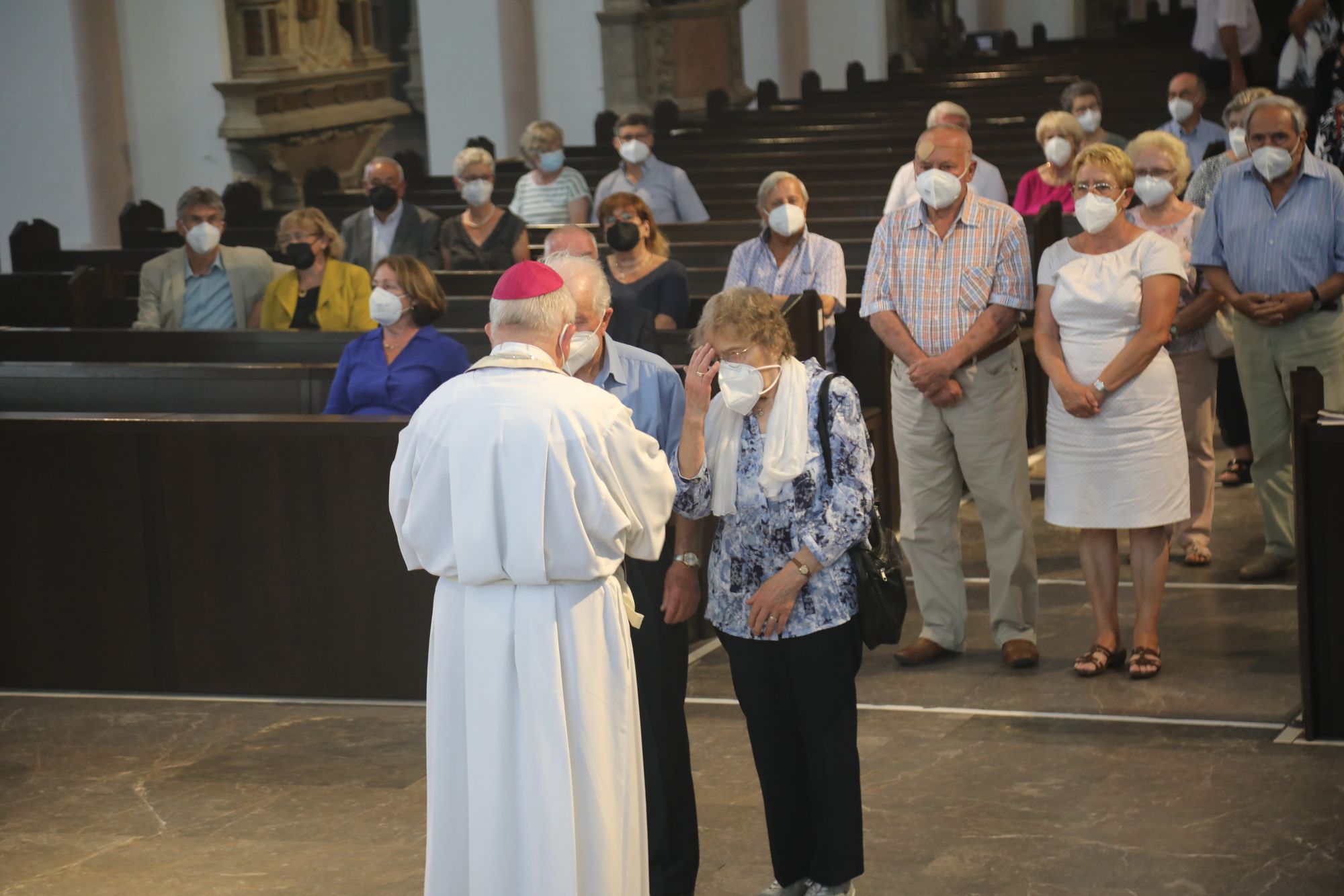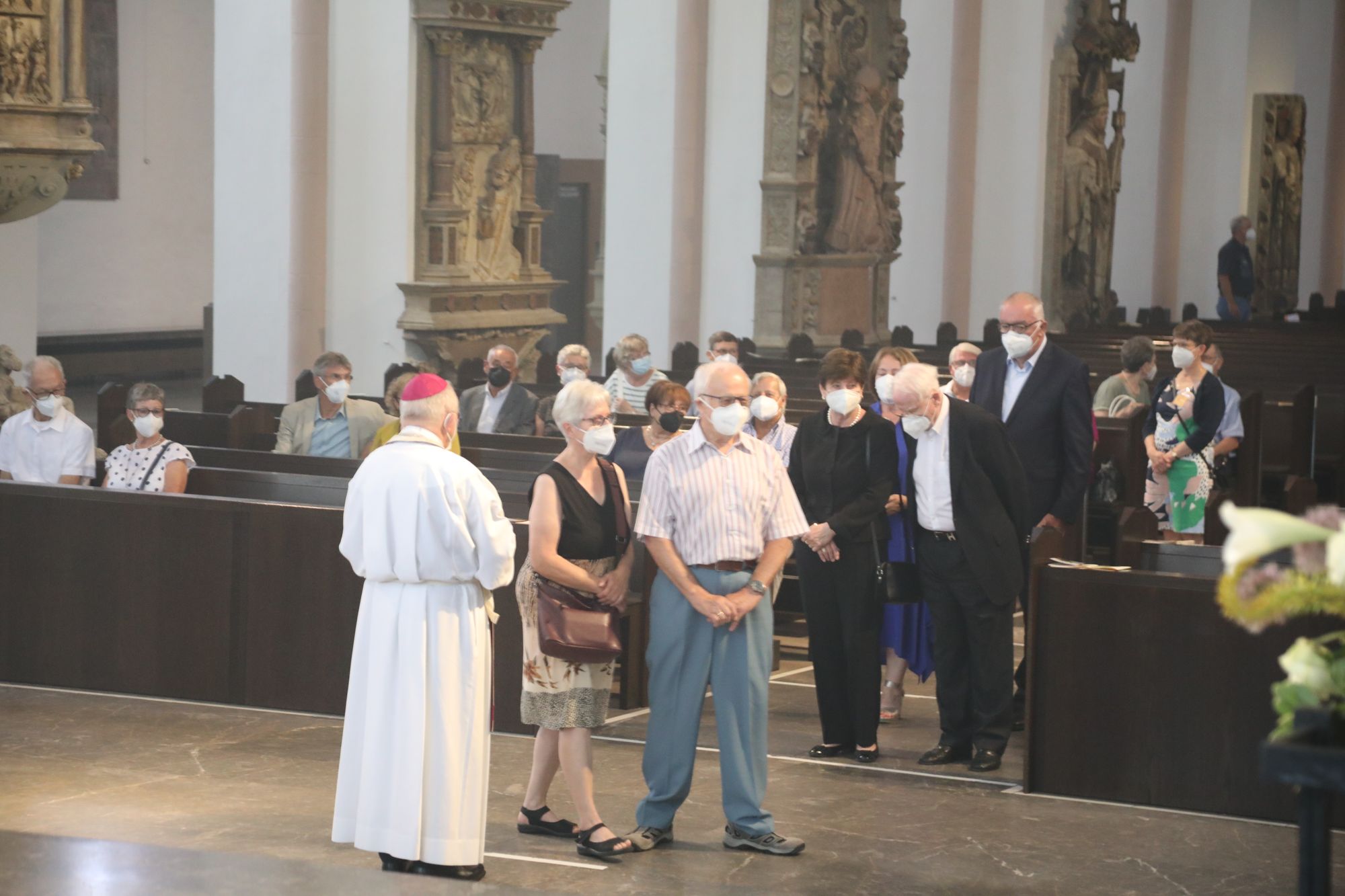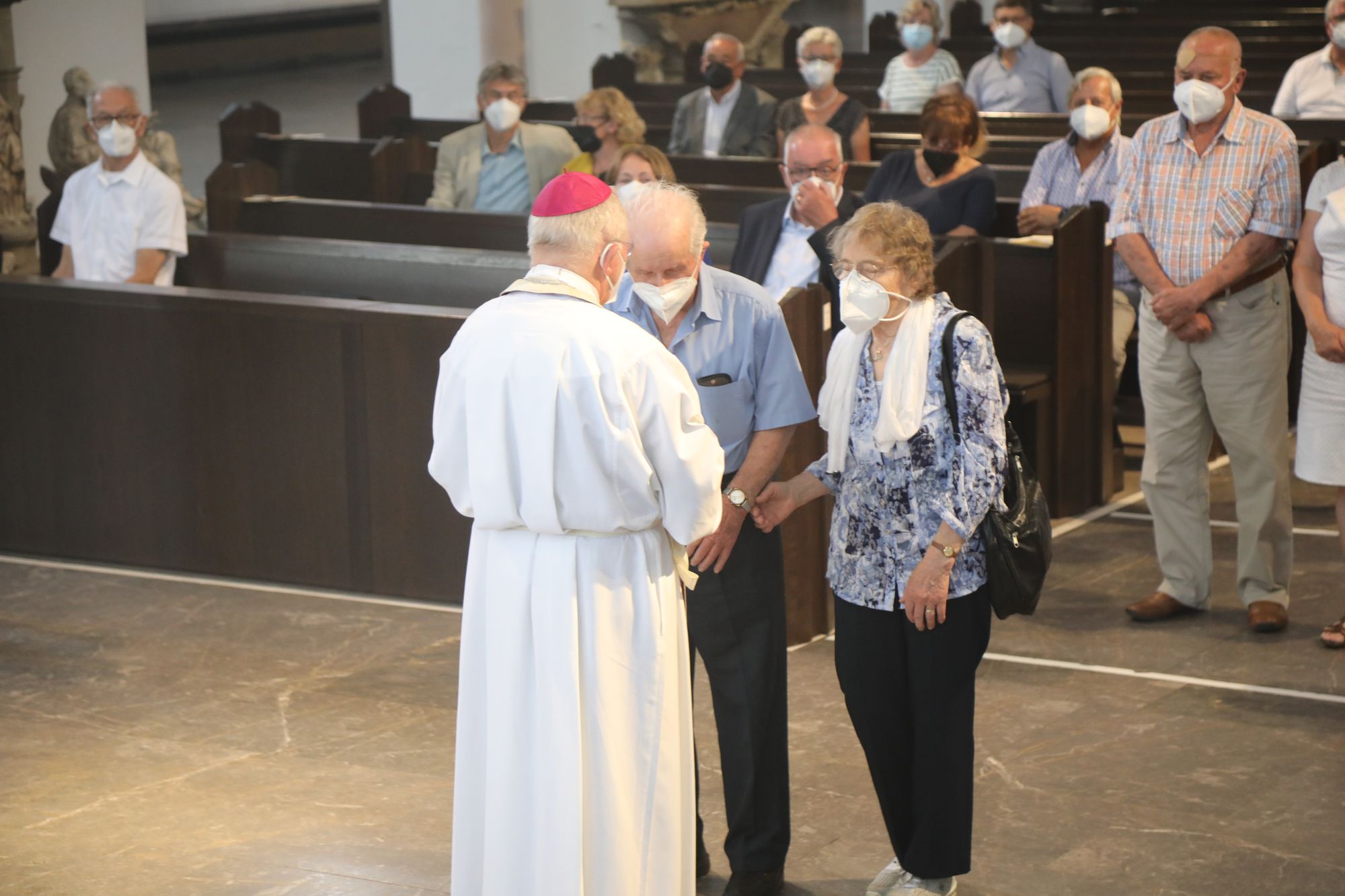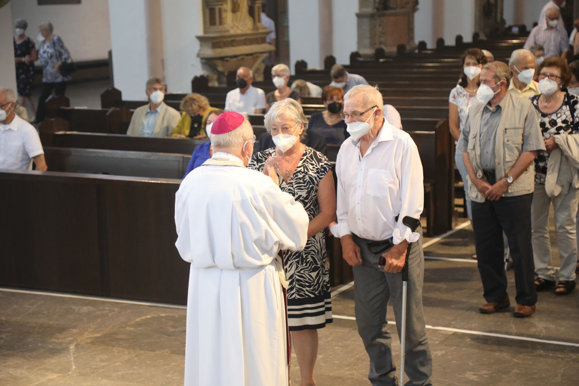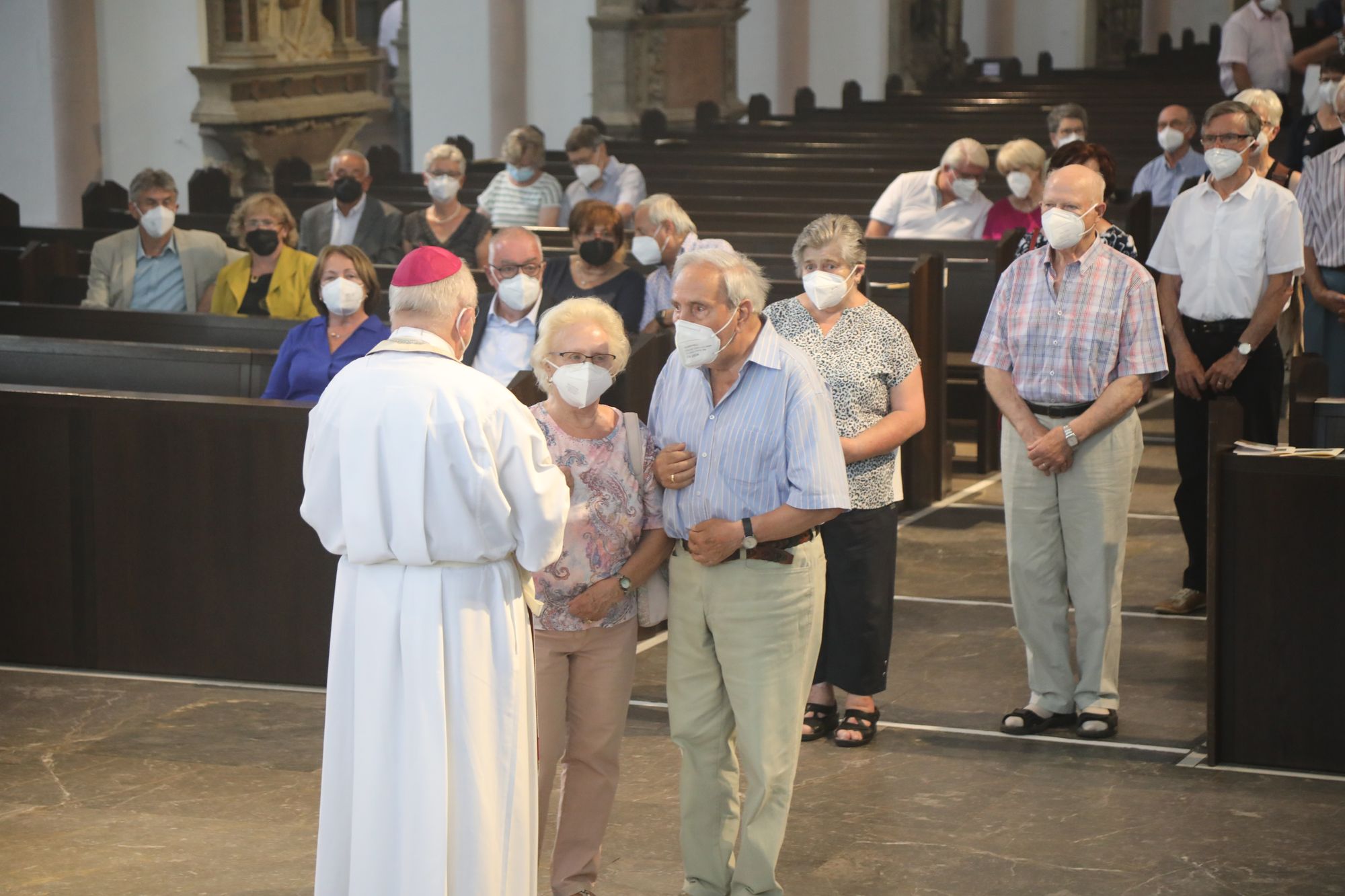 Eingeladen waren Ehejubilare, die in den Jahren 2020 und 2021 ihr goldenes, diamantenes oder eisernes Ehejubiläum feiern. Nach dem Gottesdienst ließen sich die Ehepartner von Weihbischof Boom und weiteren Priestern und Diakonen segnen. Die übliche Begegnung auf dem Kiliansplatz im Anschluss an den Gottesdienst musste aufgrund der Coronapandemie entfallen. Der Dankgottesdienst für Ehejubilare war der achte von insgesamt 18, die vor der diesjährigen Kiliani-Wallfahrtswoche unter den aktuellen Corona-Schutzmaßnahmen stattfinden.