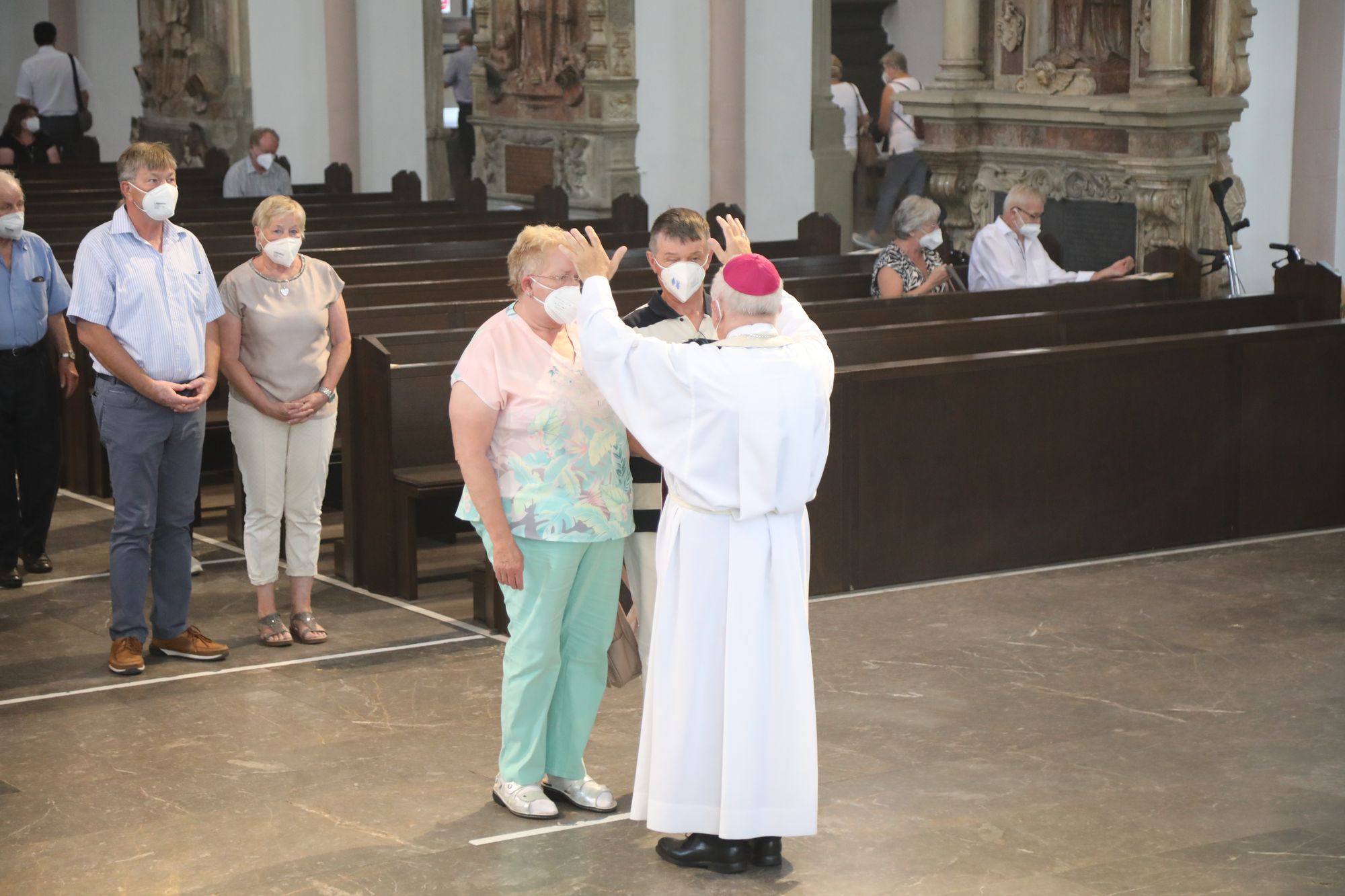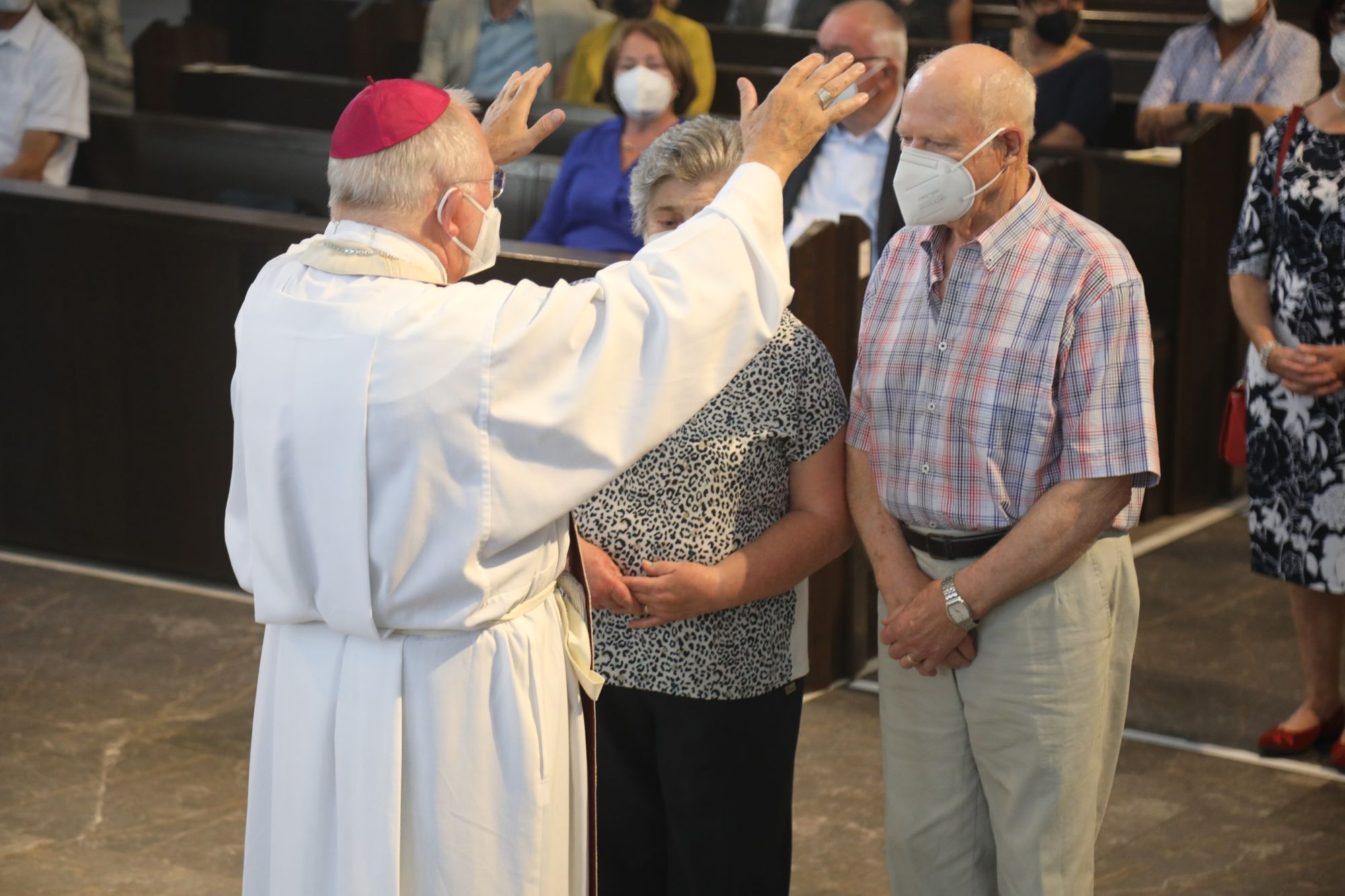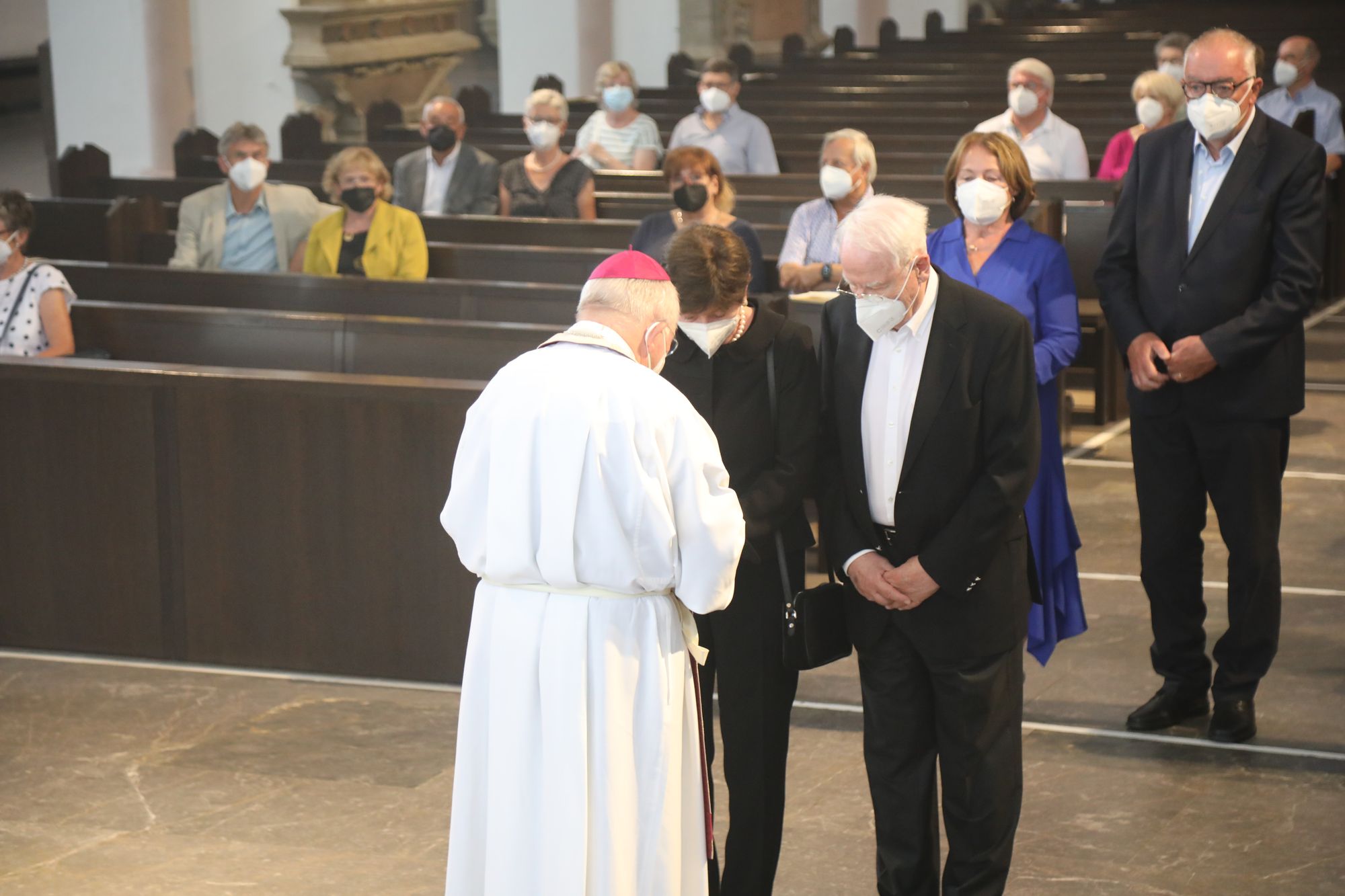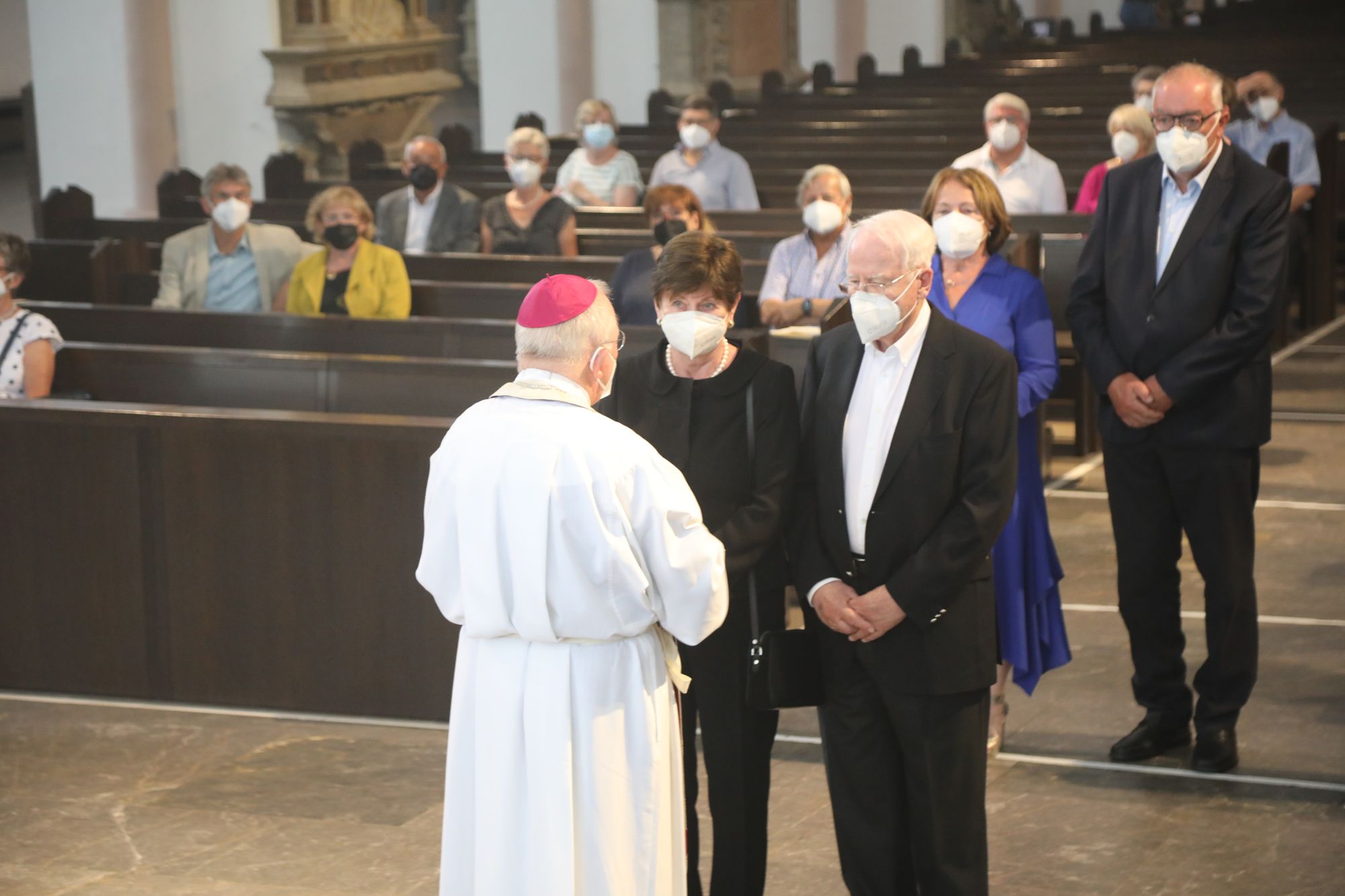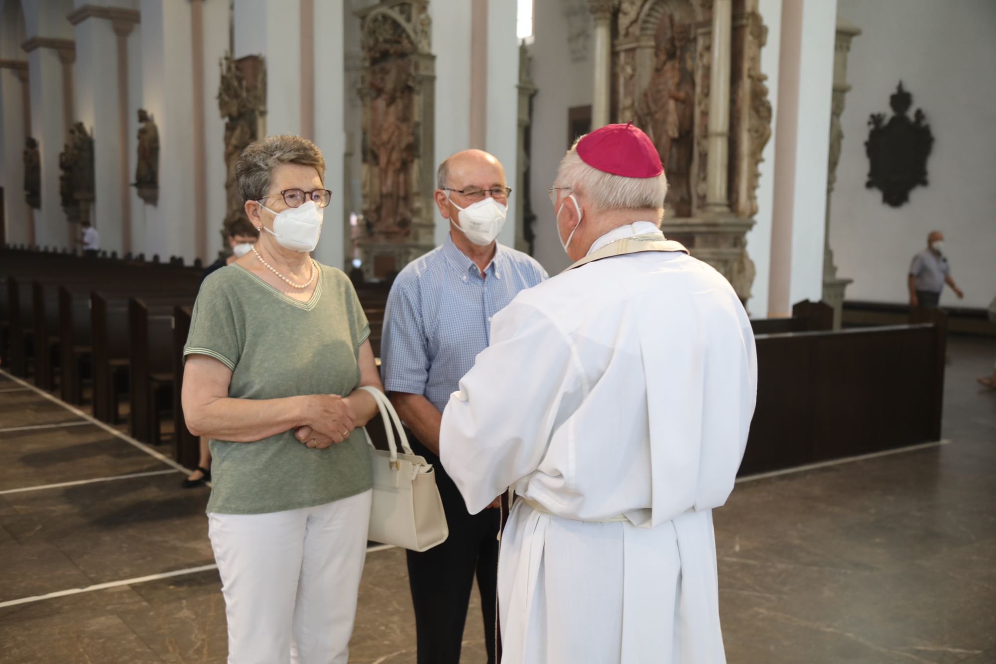 Eingeladen waren Ehejubilare, die in den Jahren 2020 und 2021 ihr goldenes, diamantenes oder eisernes Ehejubiläum feiern. Nach dem Gottesdienst ließen sich die Ehepartner von Weihbischof Boom und weiteren Priestern und Diakonen segnen. Die übliche Begegnung auf dem Kiliansplatz im Anschluss an den Gottesdienst musste aufgrund der Coronapandemie entfallen. Der Dankgottesdienst für Ehejubilare war der achte von insgesamt 18, die vor der diesjährigen Kiliani-Wallfahrtswoche unter den aktuellen Corona-Schutzmaßnahmen stattfinden.