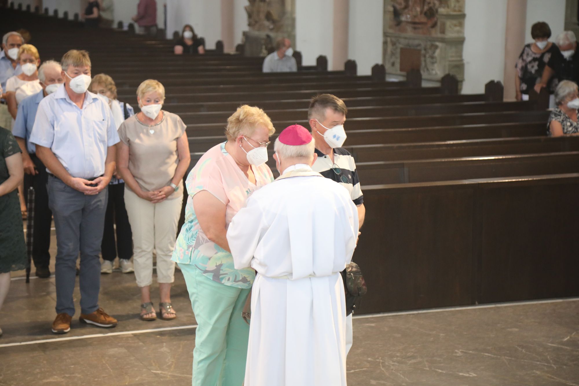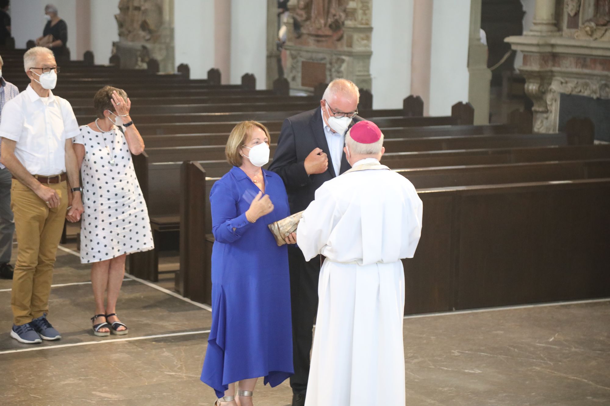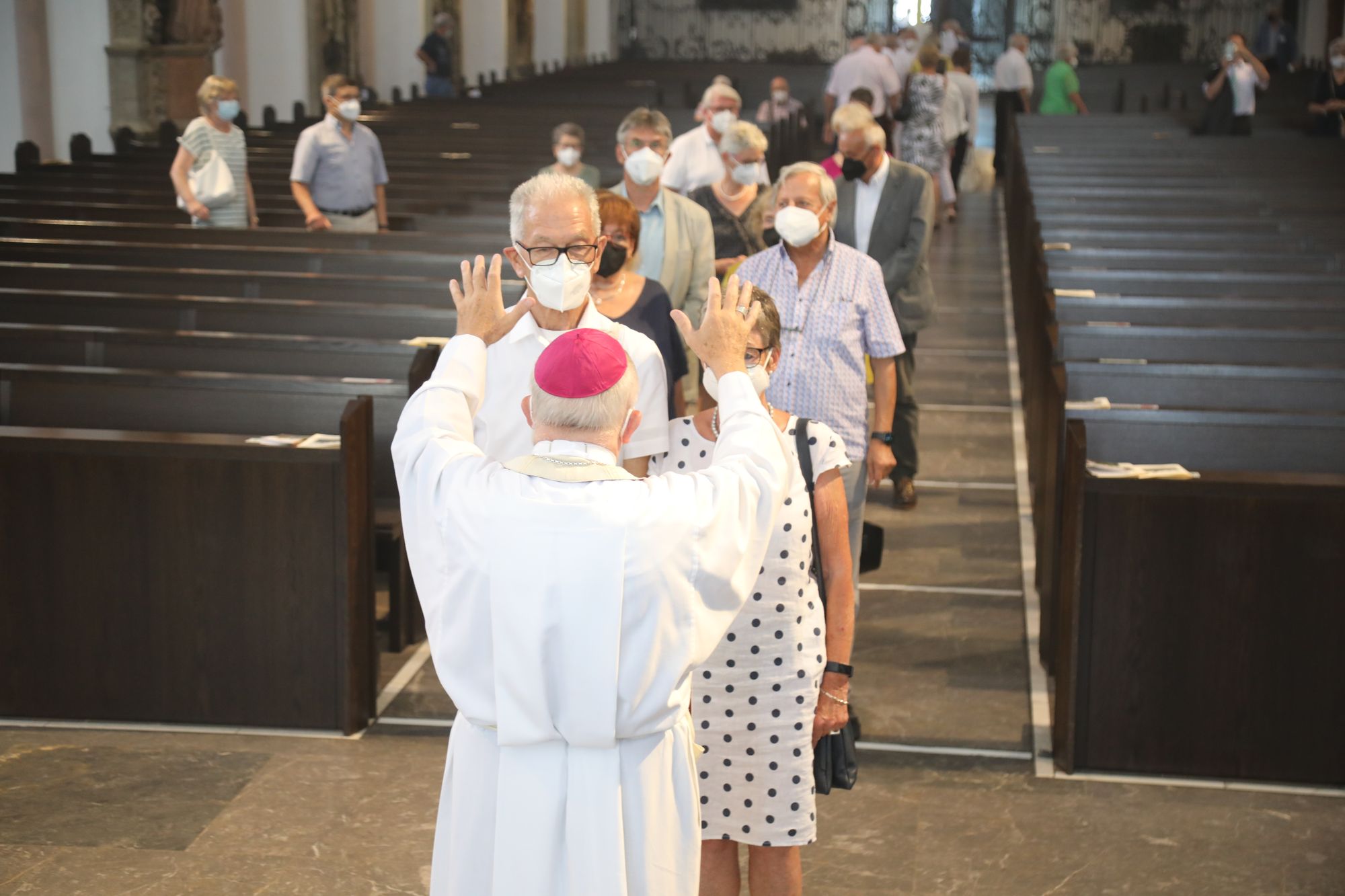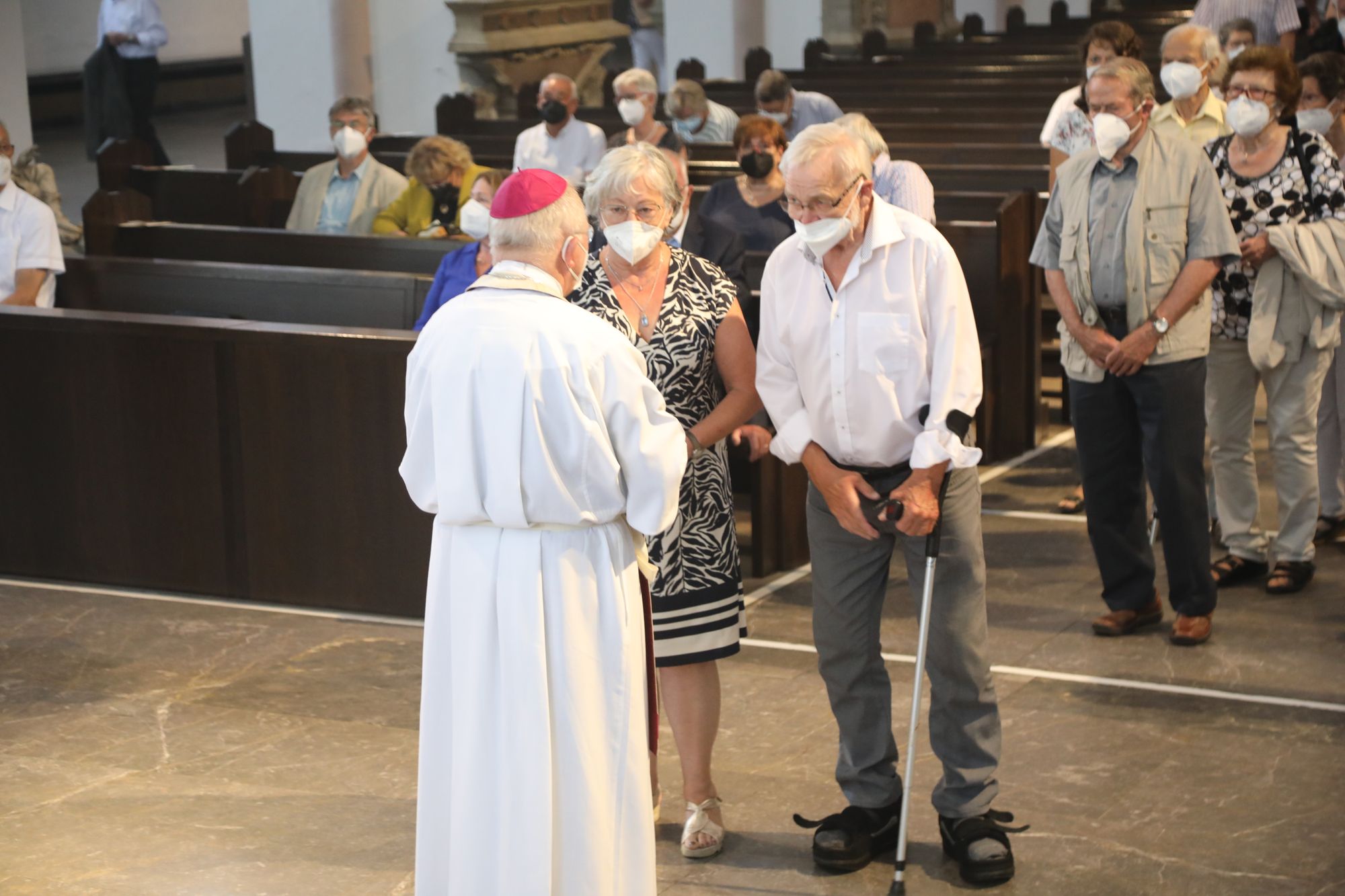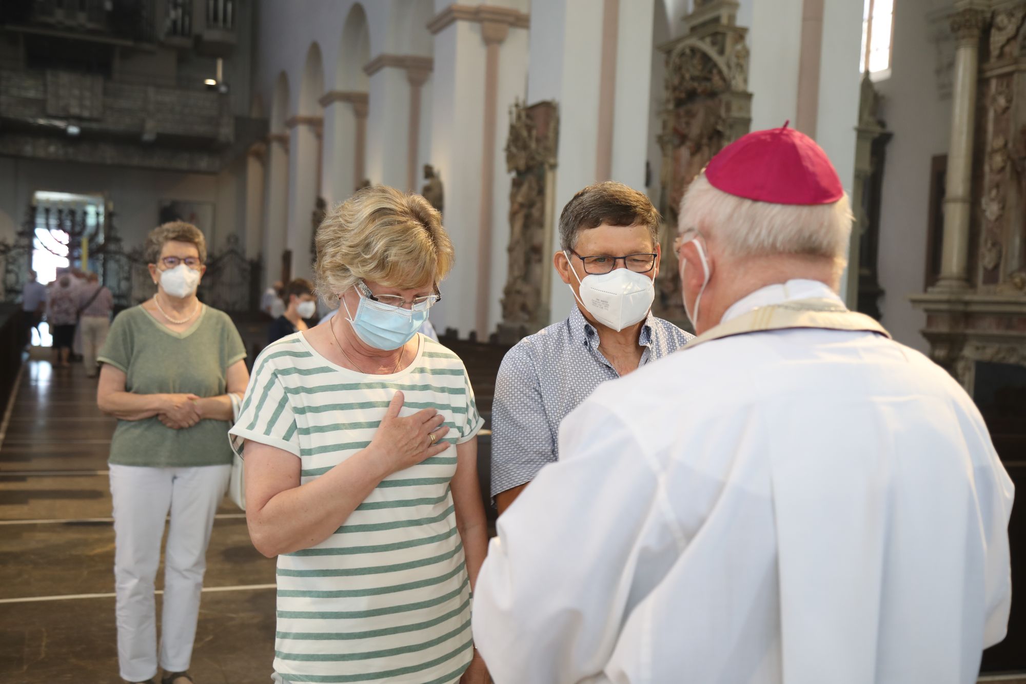 Eingeladen waren Ehejubilare, die in den Jahren 2020 und 2021 ihr goldenes, diamantenes oder eisernes Ehejubiläum feiern. Nach dem Gottesdienst ließen sich die Ehepartner von Weihbischof Boom und weiteren Priestern und Diakonen segnen. Die übliche Begegnung auf dem Kiliansplatz im Anschluss an den Gottesdienst musste aufgrund der Coronapandemie entfallen. Der Dankgottesdienst für Ehejubilare war der achte von insgesamt 18, die vor der diesjährigen Kiliani-Wallfahrtswoche unter den aktuellen Corona-Schutzmaßnahmen stattfinden.