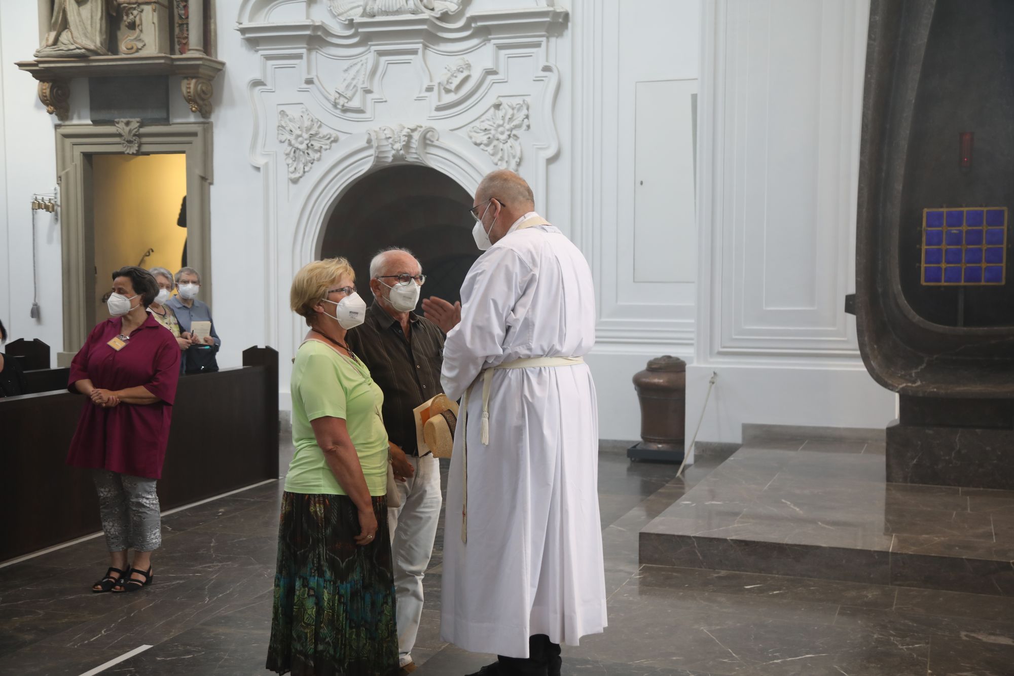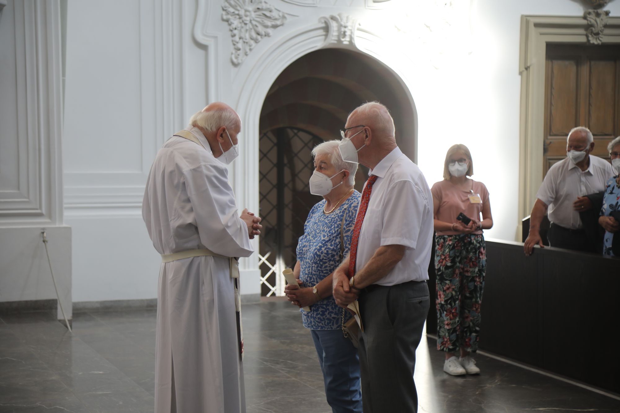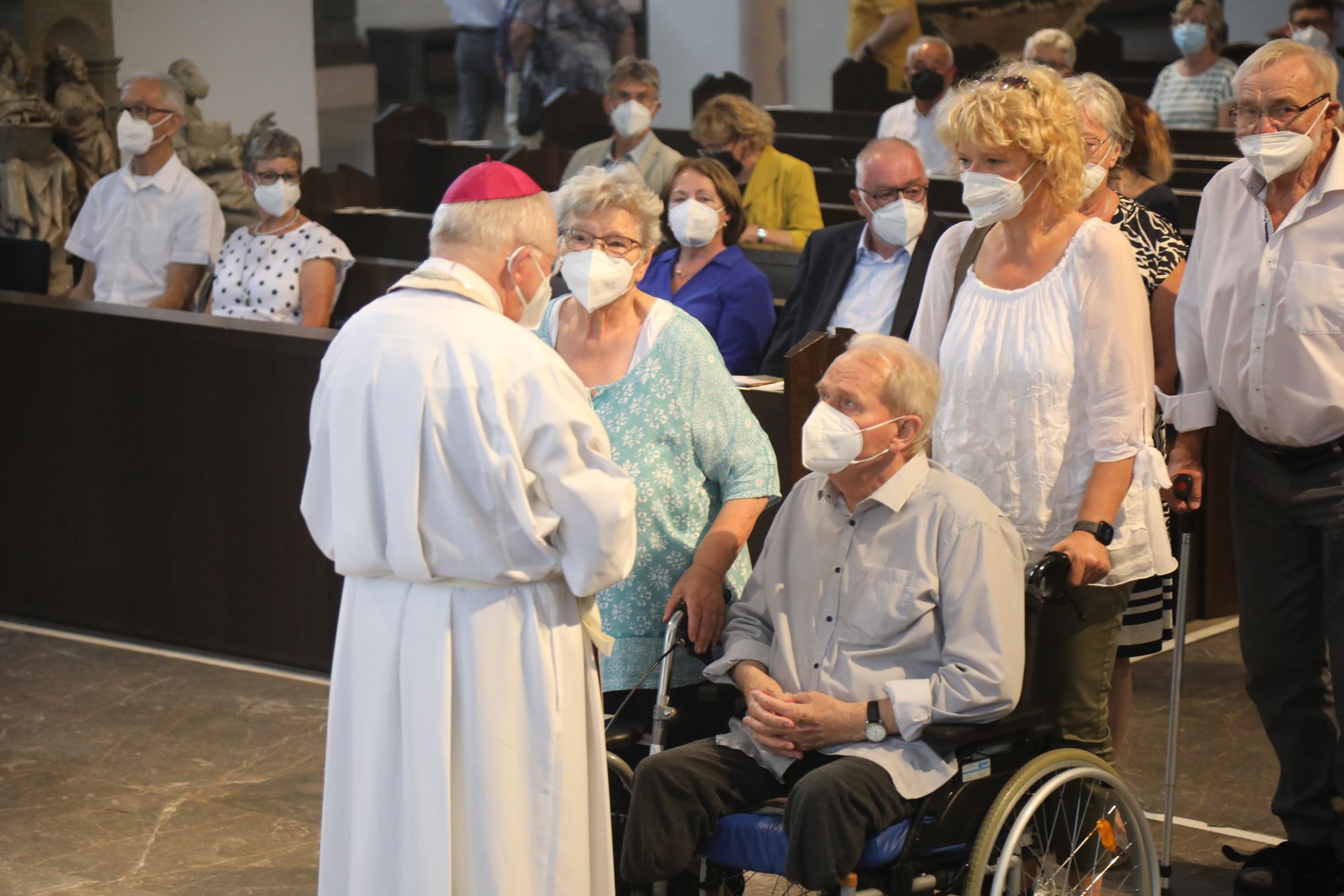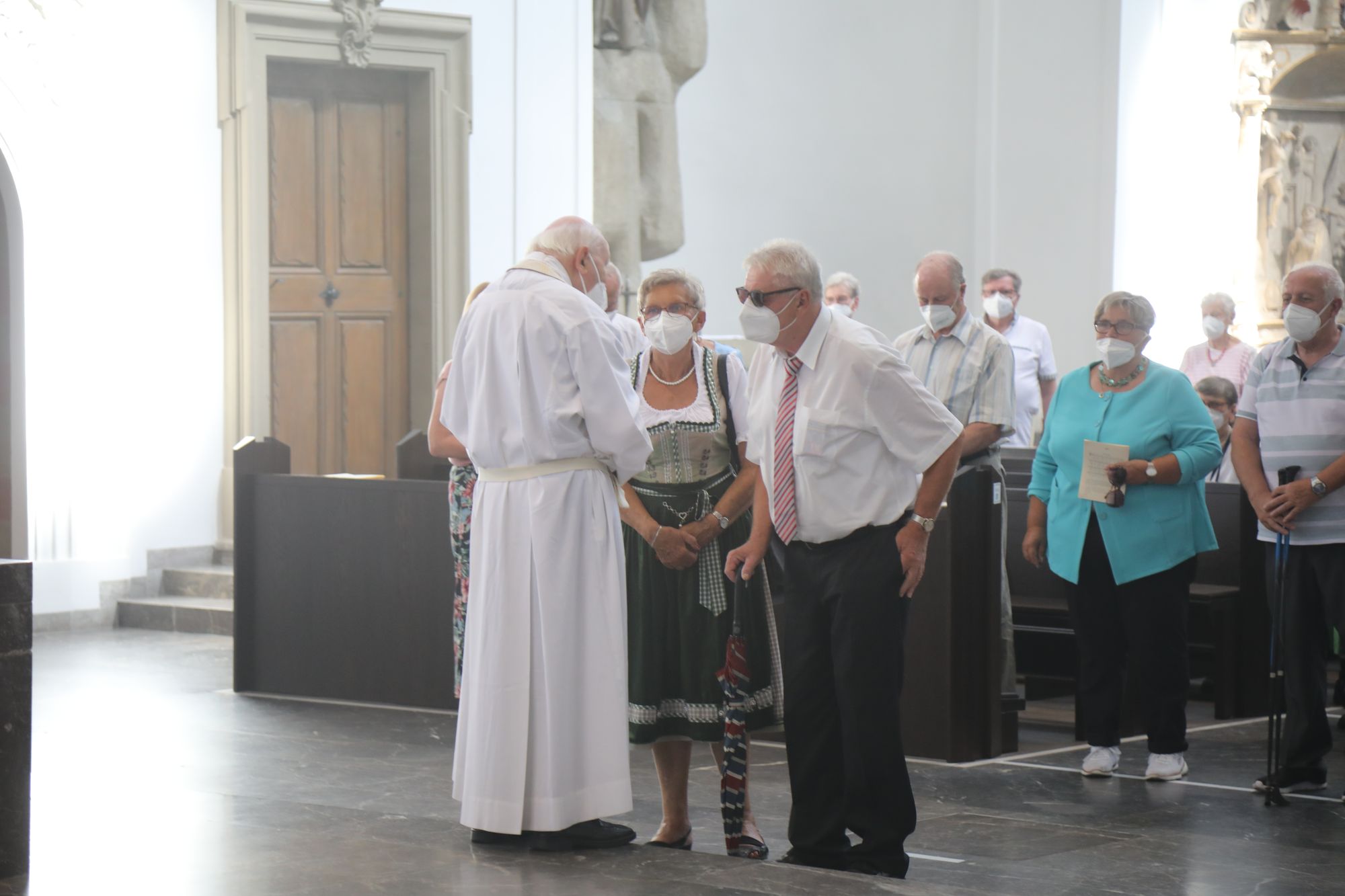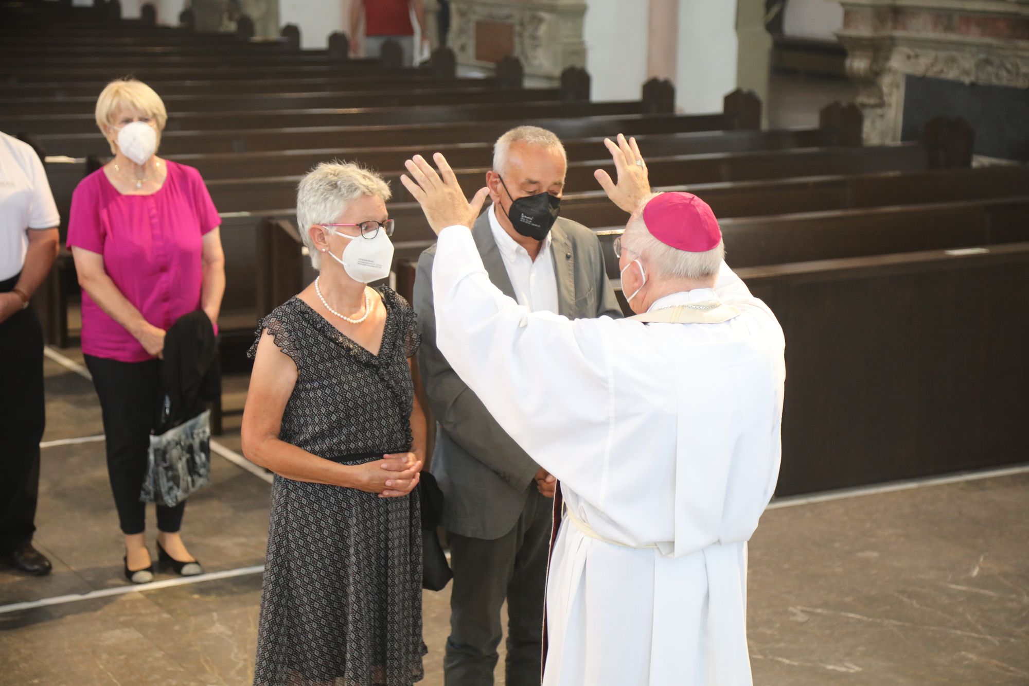 Eingeladen waren Ehejubilare, die in den Jahren 2020 und 2021 ihr goldenes, diamantenes oder eisernes Ehejubiläum feiern. Nach dem Gottesdienst ließen sich die Ehepartner von Weihbischof Boom und weiteren Priestern und Diakonen segnen. Die übliche Begegnung auf dem Kiliansplatz im Anschluss an den Gottesdienst musste aufgrund der Coronapandemie entfallen. Der Dankgottesdienst für Ehejubilare war der achte von insgesamt 18, die vor der diesjährigen Kiliani-Wallfahrtswoche unter den aktuellen Corona-Schutzmaßnahmen stattfinden.