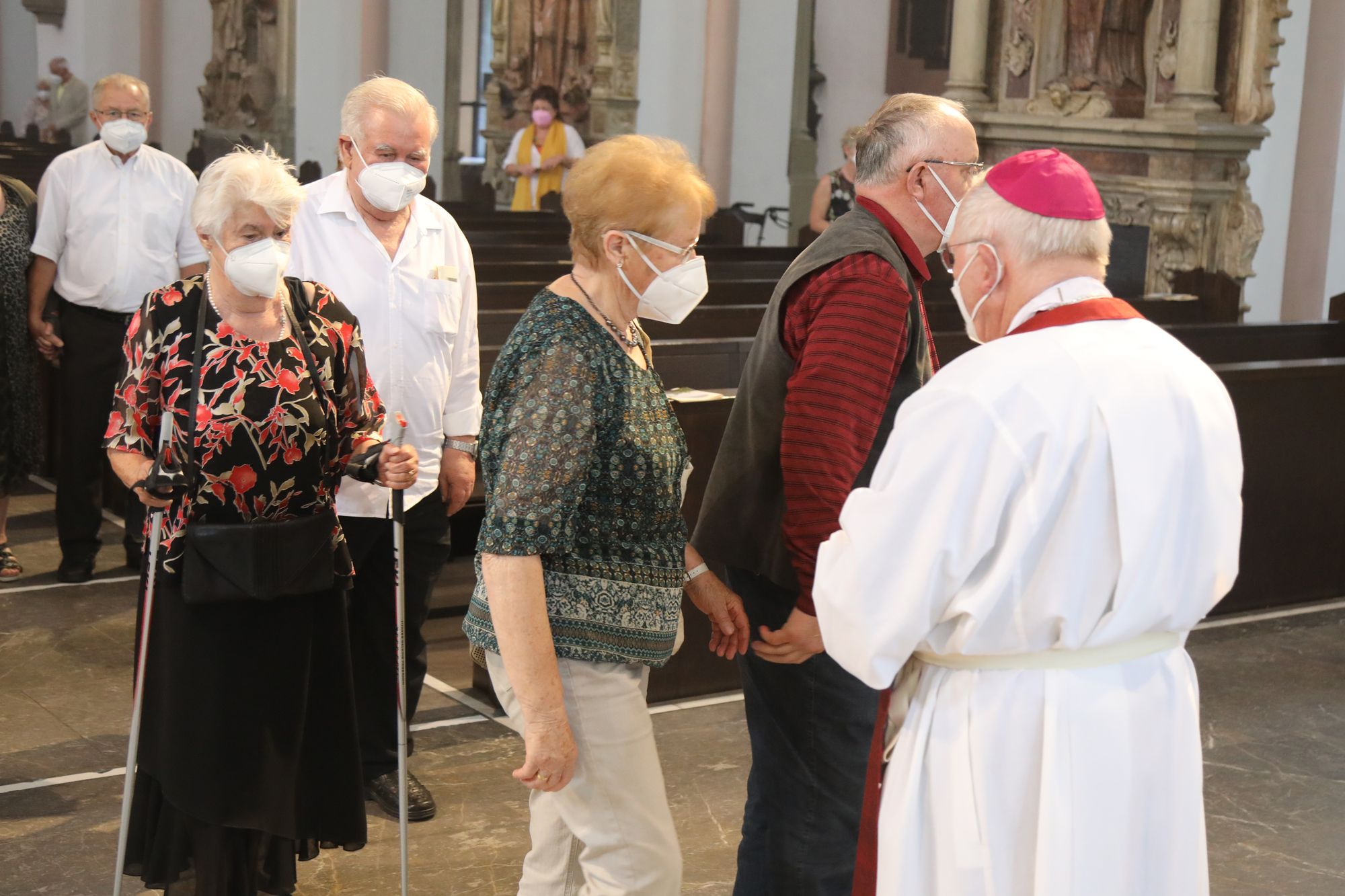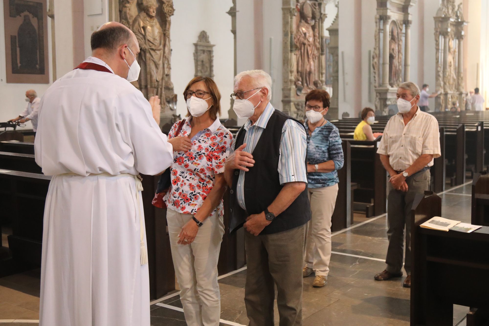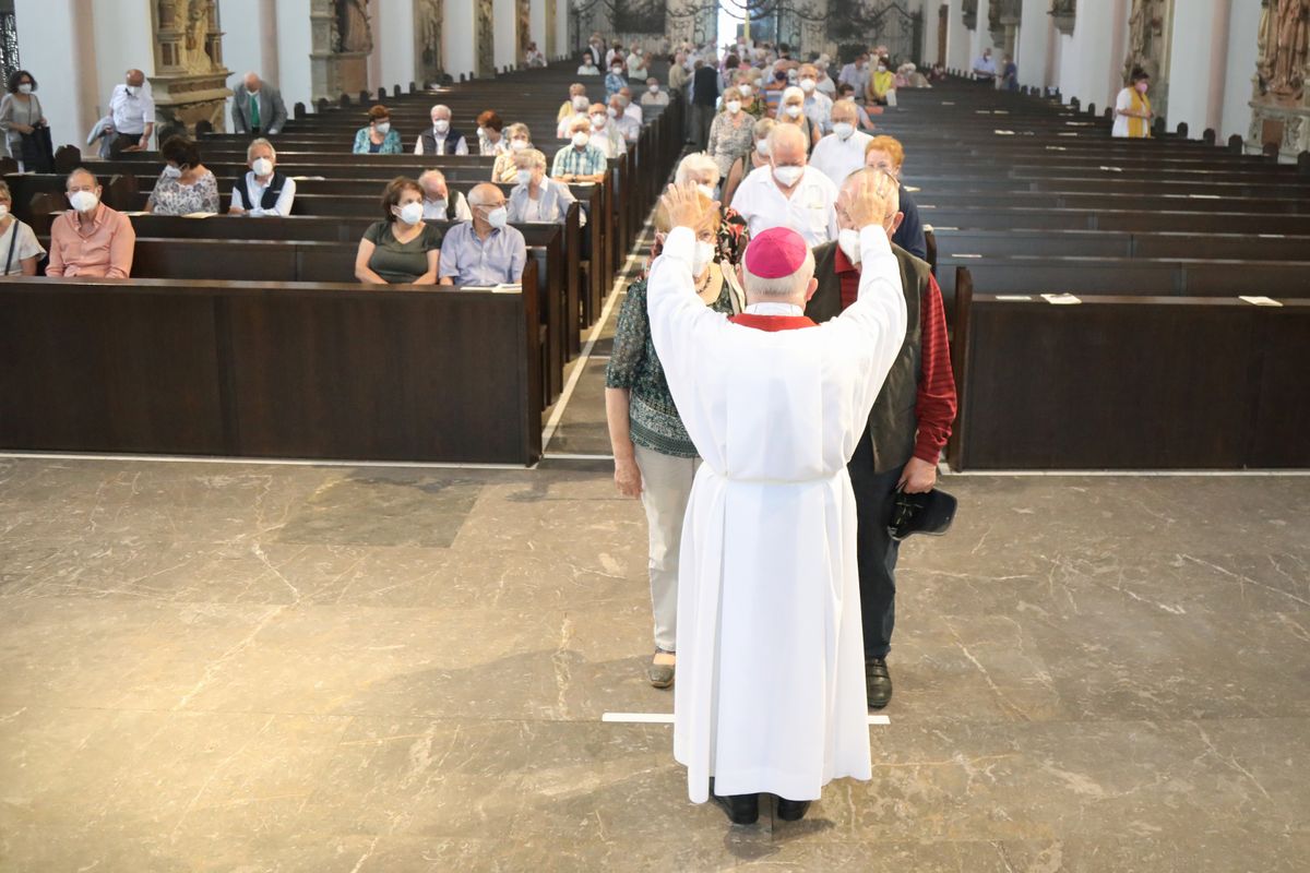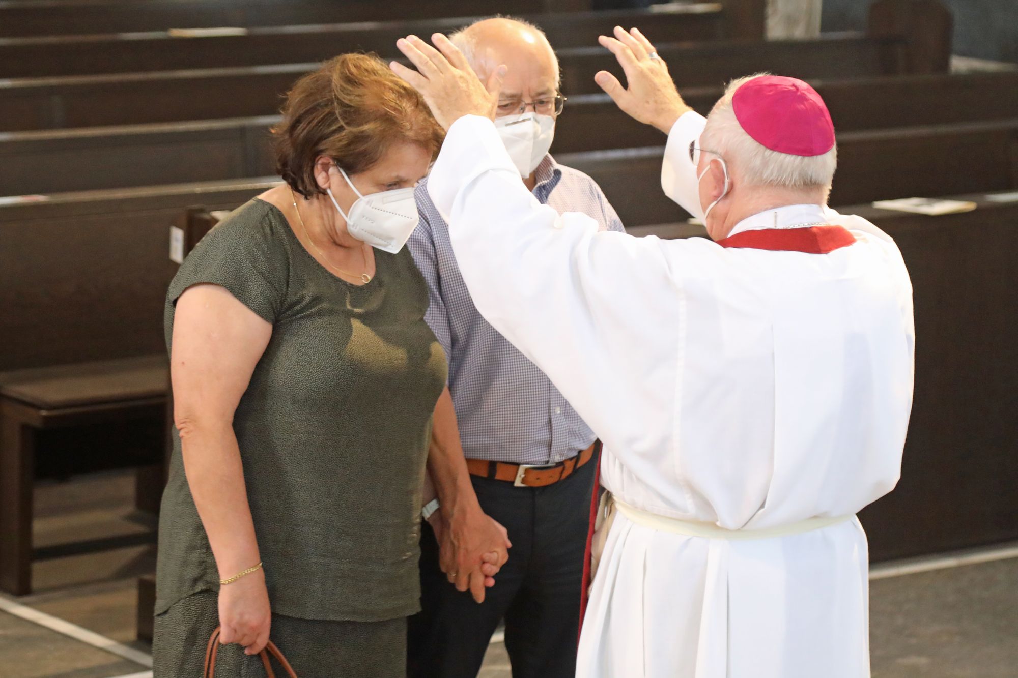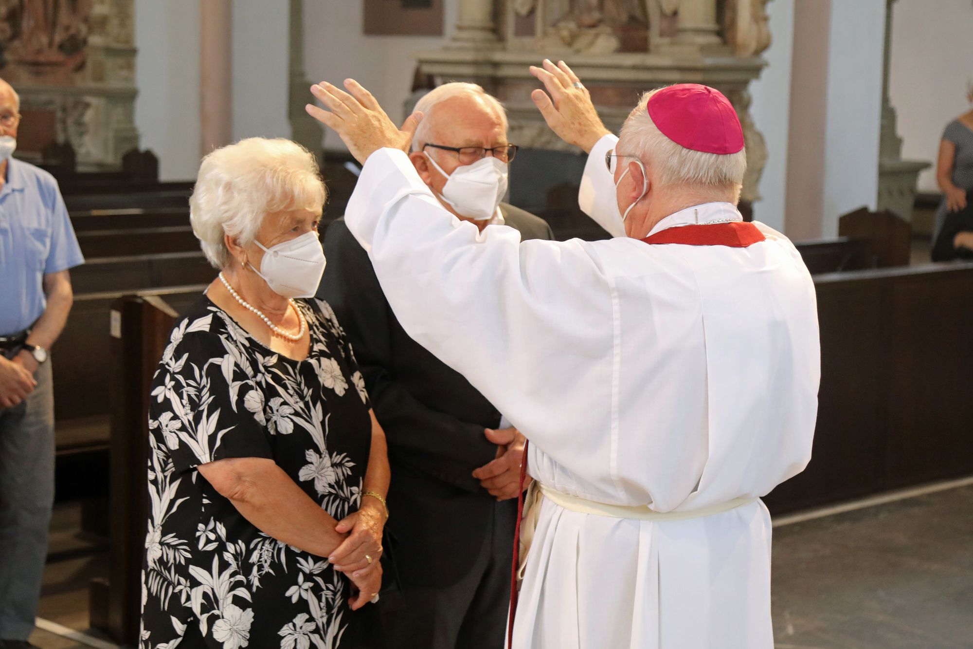 Eingeladen waren Ehejubilare, die in den Jahren 2020 und 2021 ihr goldenes, diamantenes oder eisernes Ehejubiläum feiern. Darunter waren auch Lydia und Leonhard Rothenhöfer aus Würzburg, die seit 71 Jahren verheiratet sind und von den Gläubigen mit einem herzlichen Applaus begrüßt wurden. „Geheiratet haben wir auf dem Käppele“, erzählte Lydia Rothenhöfer. Nach dem Gottesdienst ließen sich die Ehepartner von Weihbischof Boom und weiteren Priestern und Diakonen mit Abstand segnen. Aufgrund der Coronapandemie musste die übliche Begegnung auf dem Kiliansplatz im Anschluss an den Gottesdienst entfallen. Der Dankgottesdienst für Ehejubilare war der elfte von insgesamt 18, die vor der diesjährigen Kiliani-Wallfahrtswoche unter den aktuellen Corona-Schutzmaßnahmen stattfinden.