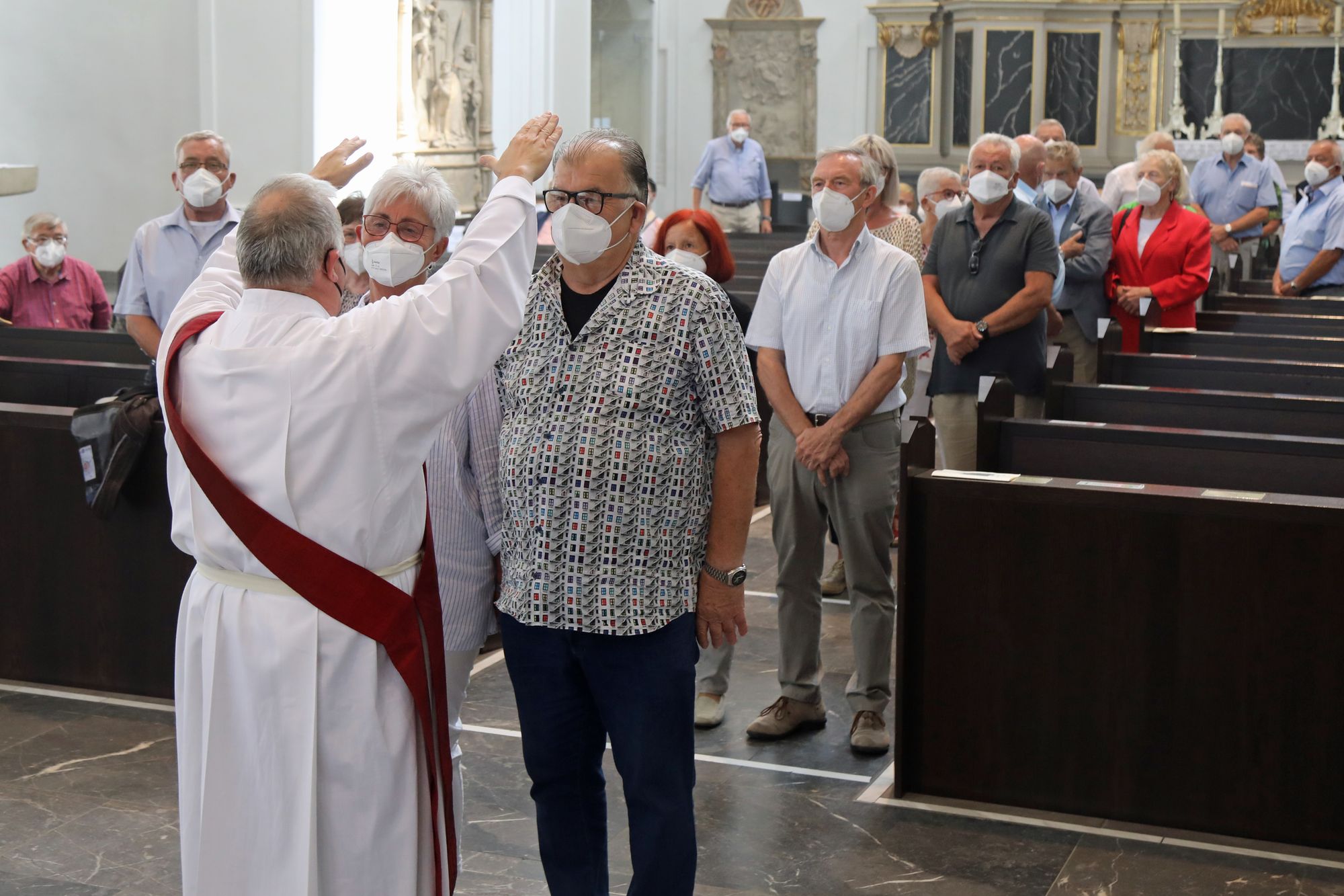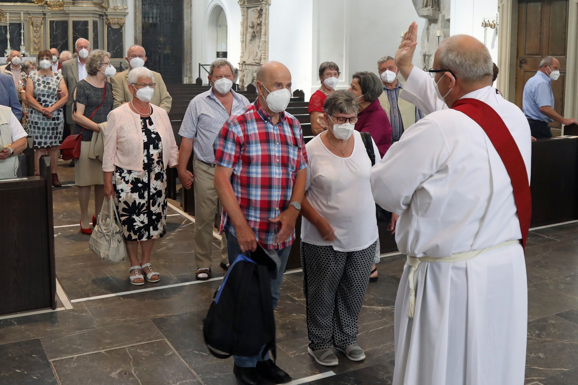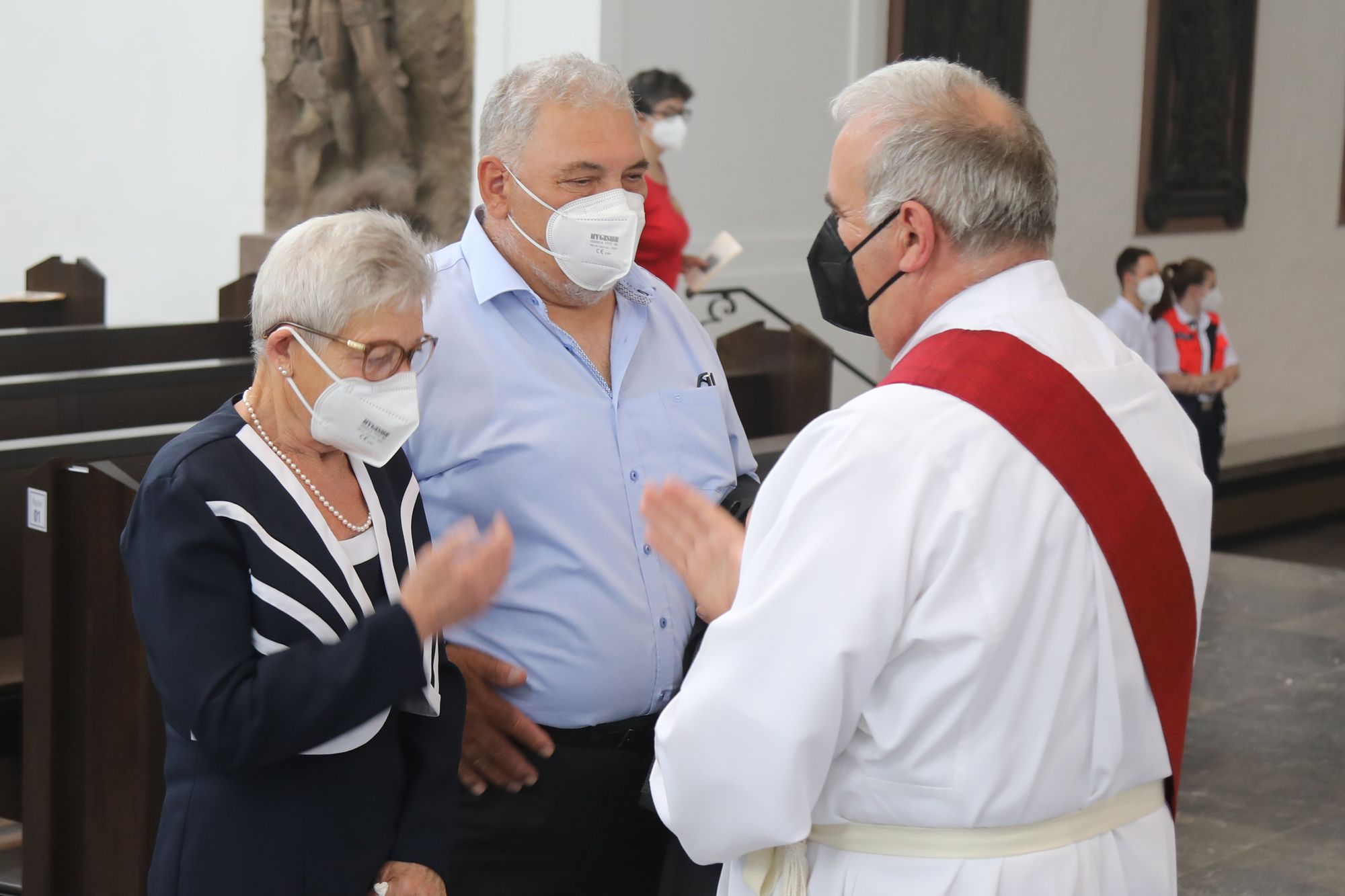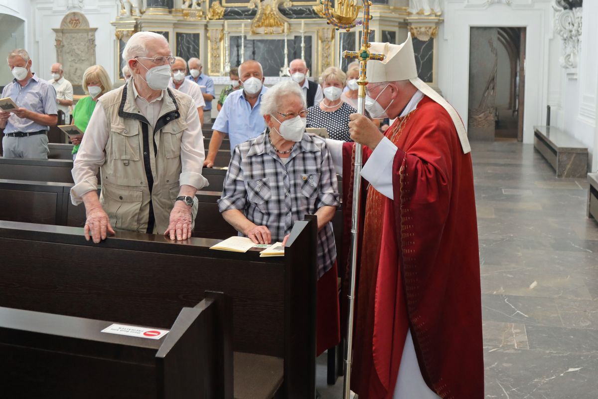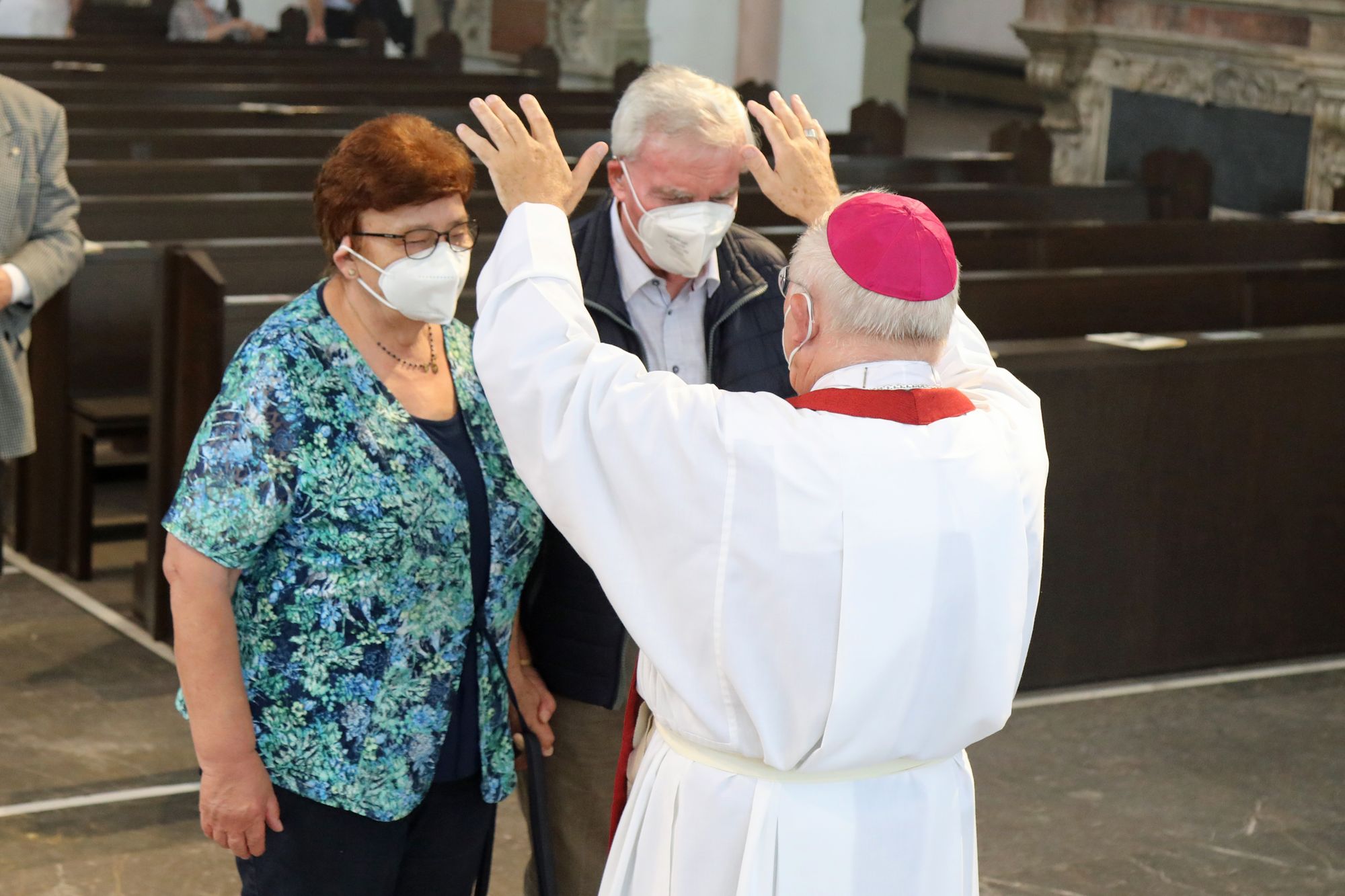 Eingeladen waren Ehejubilare, die in den Jahren 2020 und 2021 ihr goldenes, diamantenes oder eisernes Ehejubiläum feiern. Darunter waren auch Lydia und Leonhard Rothenhöfer aus Würzburg, die seit 71 Jahren verheiratet sind und von den Gläubigen mit einem herzlichen Applaus begrüßt wurden. „Geheiratet haben wir auf dem Käppele“, erzählte Lydia Rothenhöfer. Nach dem Gottesdienst ließen sich die Ehepartner von Weihbischof Boom und weiteren Priestern und Diakonen mit Abstand segnen. Aufgrund der Coronapandemie musste die übliche Begegnung auf dem Kiliansplatz im Anschluss an den Gottesdienst entfallen. Der Dankgottesdienst für Ehejubilare war der elfte von insgesamt 18, die vor der diesjährigen Kiliani-Wallfahrtswoche unter den aktuellen Corona-Schutzmaßnahmen stattfinden.