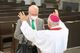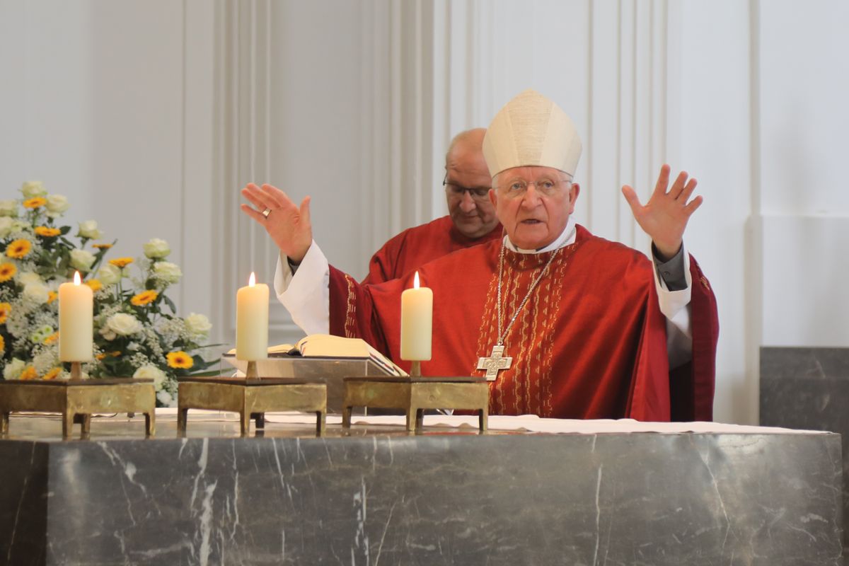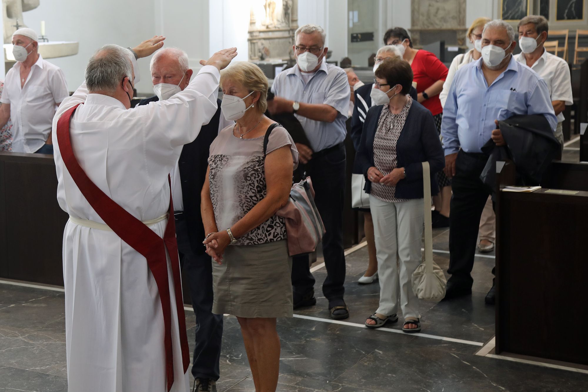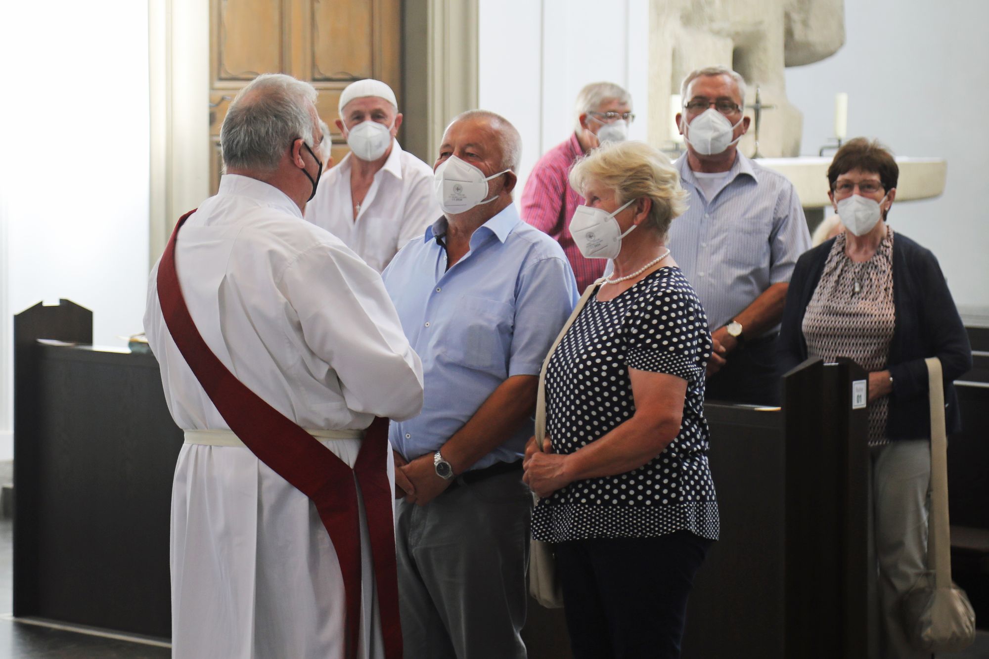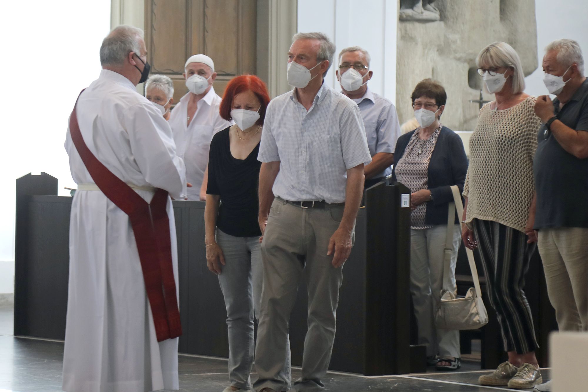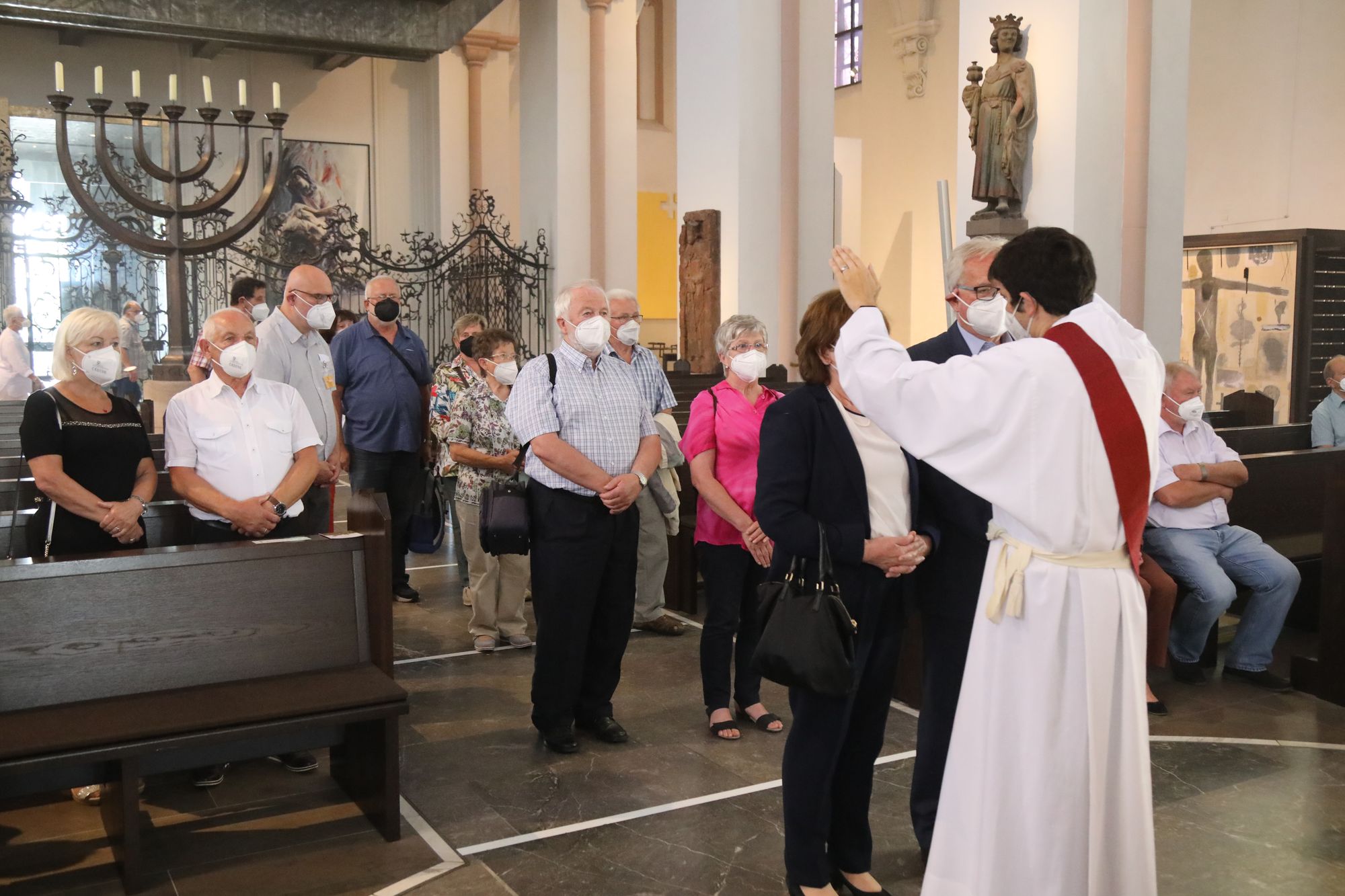 Eingeladen waren Ehejubilare, die in den Jahren 2020 und 2021 ihr goldenes, diamantenes oder eisernes Ehejubiläum feiern. Darunter waren auch Lydia und Leonhard Rothenhöfer aus Würzburg, die seit 71 Jahren verheiratet sind und von den Gläubigen mit einem herzlichen Applaus begrüßt wurden. „Geheiratet haben wir auf dem Käppele“, erzählte Lydia Rothenhöfer. Nach dem Gottesdienst ließen sich die Ehepartner von Weihbischof Boom und weiteren Priestern und Diakonen mit Abstand segnen. Aufgrund der Coronapandemie musste die übliche Begegnung auf dem Kiliansplatz im Anschluss an den Gottesdienst entfallen. Der Dankgottesdienst für Ehejubilare war der elfte von insgesamt 18, die vor der diesjährigen Kiliani-Wallfahrtswoche unter den aktuellen Corona-Schutzmaßnahmen stattfinden.