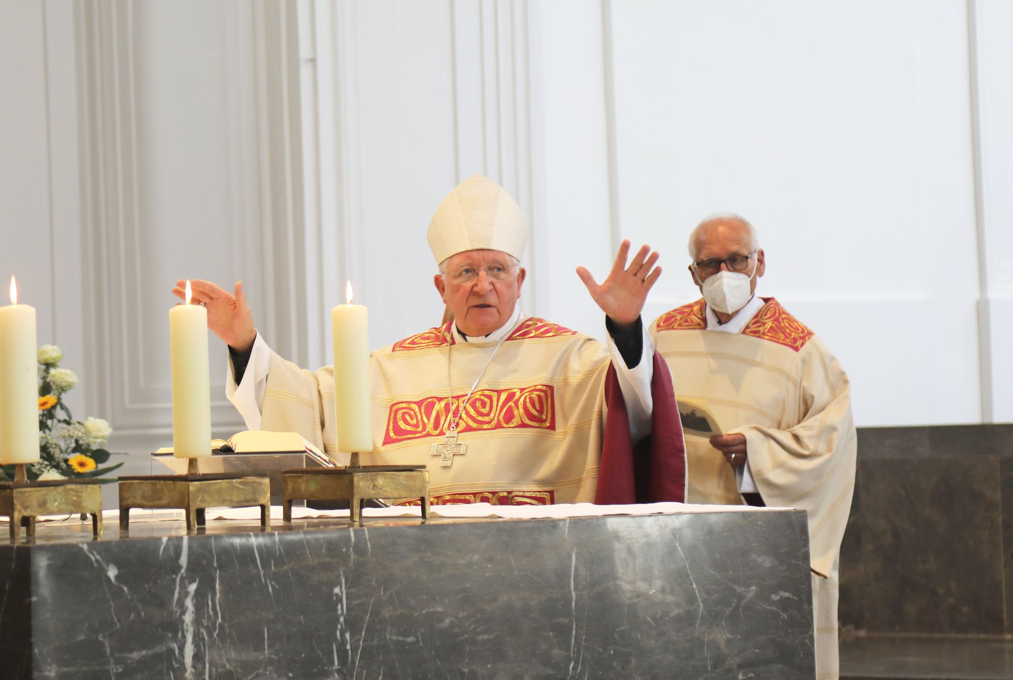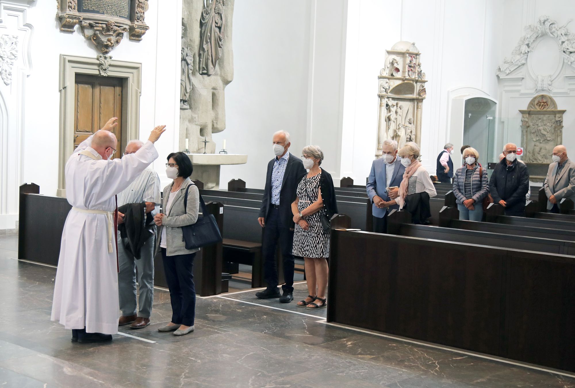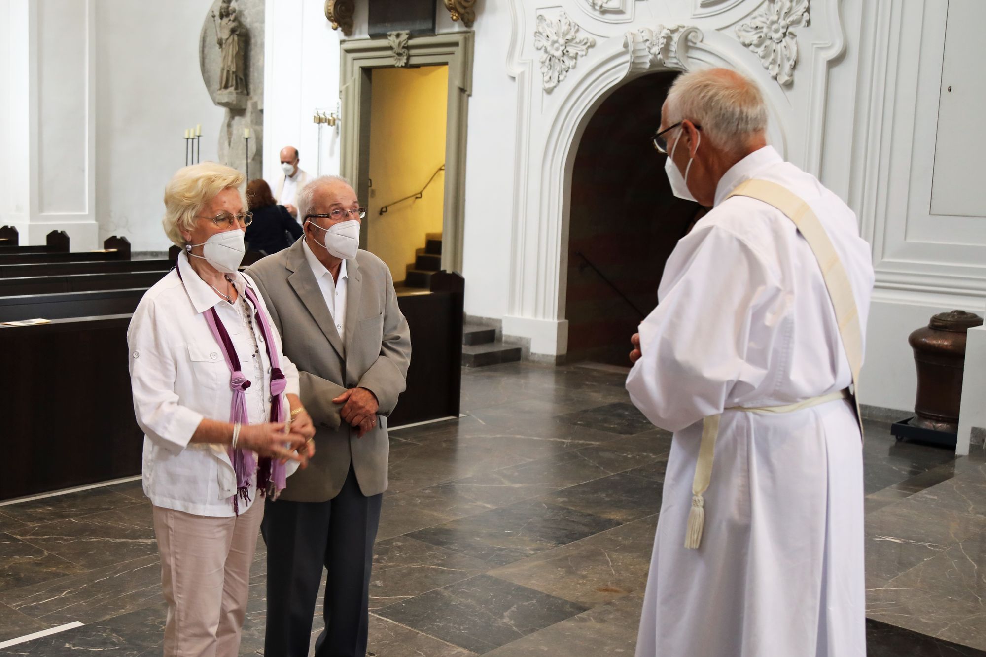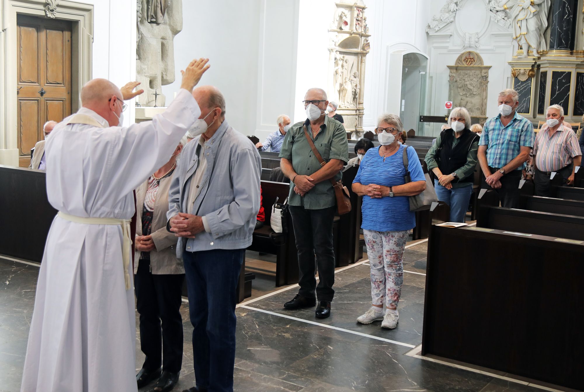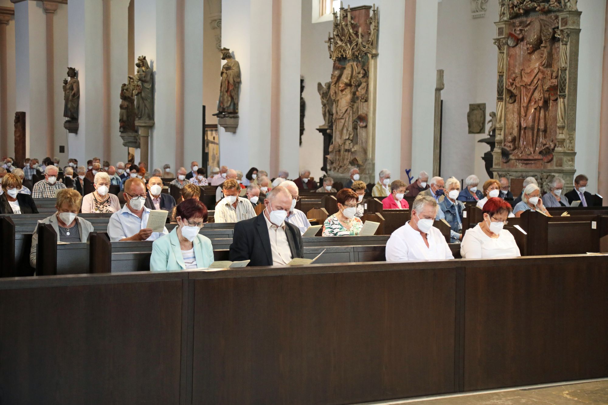 Eingeladen waren Ehejubilare, die in den Jahren 2020 und 2021 ihr goldenes, diamantenes oder eisernes Ehejubiläum feiern. Nach dem Gottesdienst ließen sich die Ehepartner von Weihbischof Boom und weiteren Priestern und Diakonen mit Abstand segnen. Aufgrund der Coronapandemie musste die übliche Begegnung auf dem Kiliansplatz im Anschluss an den Gottesdienst entfallen. Der Dankgottesdienst für Ehejubilare war der 14. von insgesamt 18, die vor der diesjährigen Kiliani-Wallfahrtswoche unter den aktuellen Corona-Schutzmaßnahmen stattfinden.