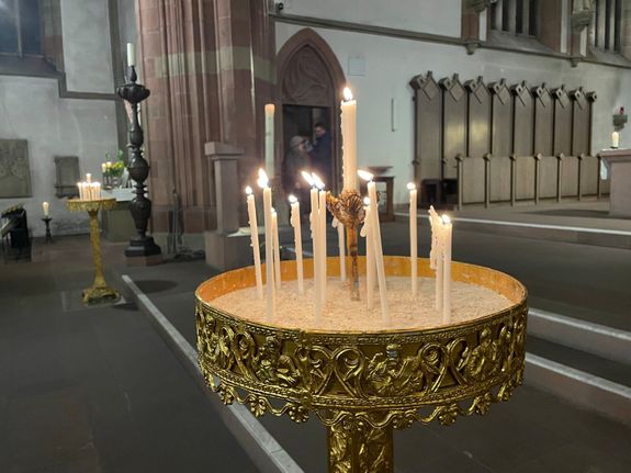 Würzburg (POW) Brennende Kerzen, bunte Blumen und blau-gelbe Ukraineflaggen haben die Würzburger Marienkapelle bei einem Friedensgebet am Dienstagabend, 24. Februar, geschmückt. Vier Jahre nach Beginn des russischen Angriffskrieges auf die Ukraine kamen Menschen dort auf Einladung der Gemeinschaft Sant’Egidio zusammen. Sie beteten für Frieden in der Ukraine und auf der ganzen Welt. Unter den Teilnehmenden befanden sich viele Ukrainerinnen und Ukrainer, die inzwischen in Würzburg leben. Für sie war der Jahrestag mit persönlichen Erinnerungen verbunden.