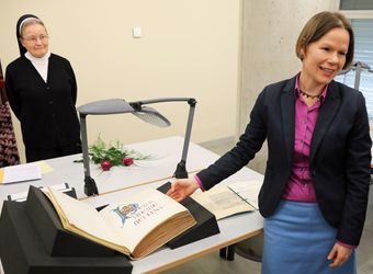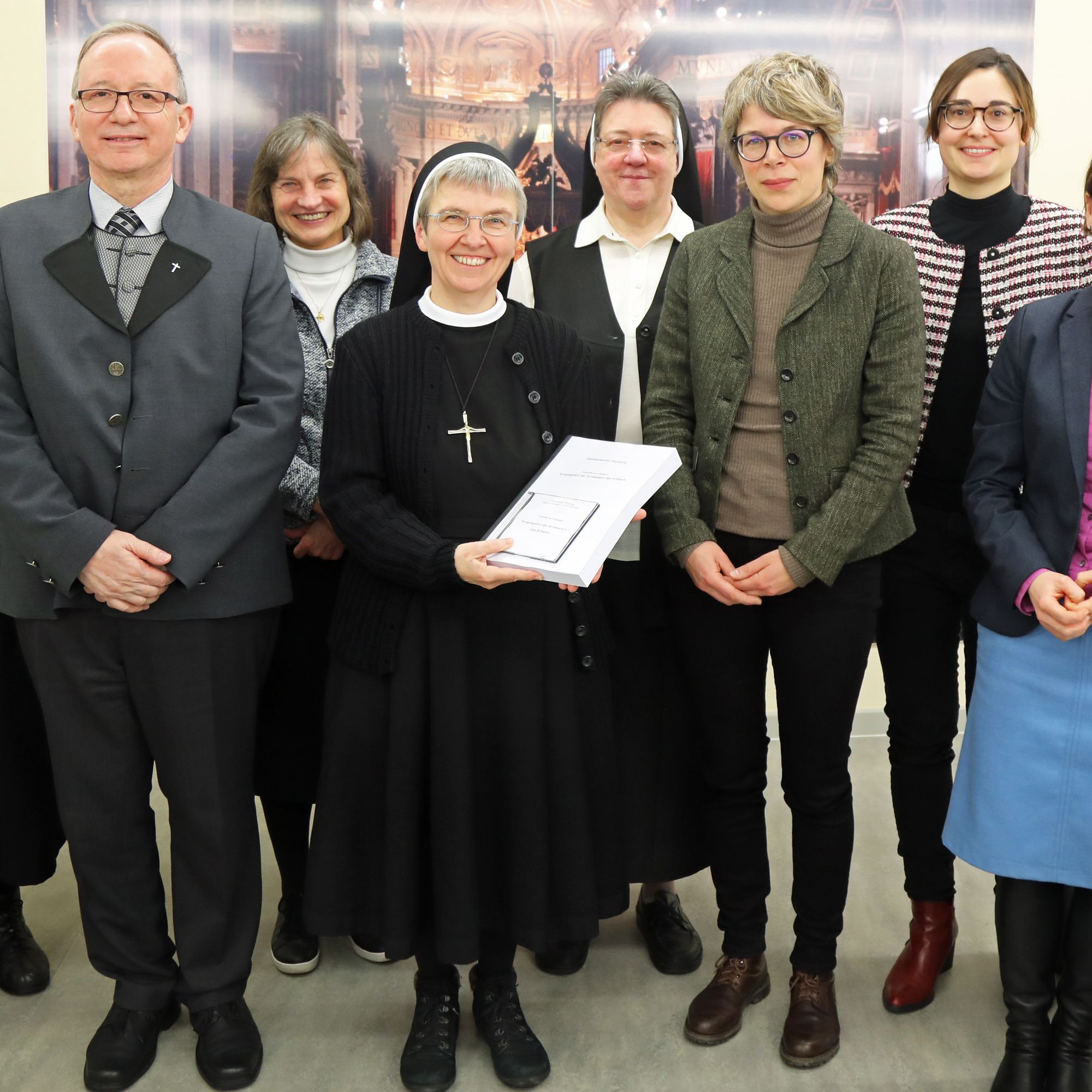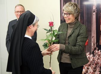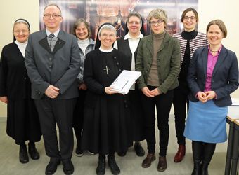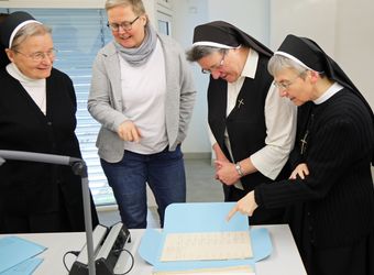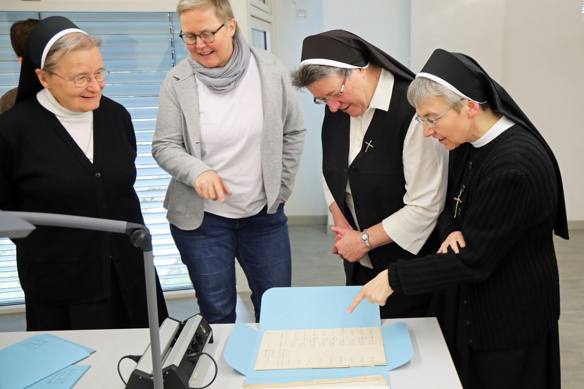 „Wir gehen heute einen guten Schritt. Archive sind das Gedächtnis der Welt und auch das Gedächtnis der Kongregation. Hinter diesen 5150 Einheiten stecken Leben und Menschen“, sagte Generaloberin Schwester Monika Edinger. Bei der Archivierung seien die Mitarbeiter vor vielen Fragen insbesondere im Zusammenhang mit der bevorstehenden Benutzung gestanden: Was soll im Gedächtnis behalten werden? „Manches würde man nachträglich gerne streichen. Doch es ist wichtig, zur eigenen Geschichte zu stehen mit ihren Höhen und Tiefen, hellen und dunklen Situationen, um aus ihr zu lernen“, fasste Edinger manche schwierige Debatte zusammen. Umgekehrt sei es bei der Archivierung auch darum gegangen, die Geschichten der betroffenen Schwestern zu schützen. „Wir sollten immer aus der Geschichte lernen, aber auch die Schätze entdecken, die darin stehen“, lautete das Fazit von Generaloberin Edinger.