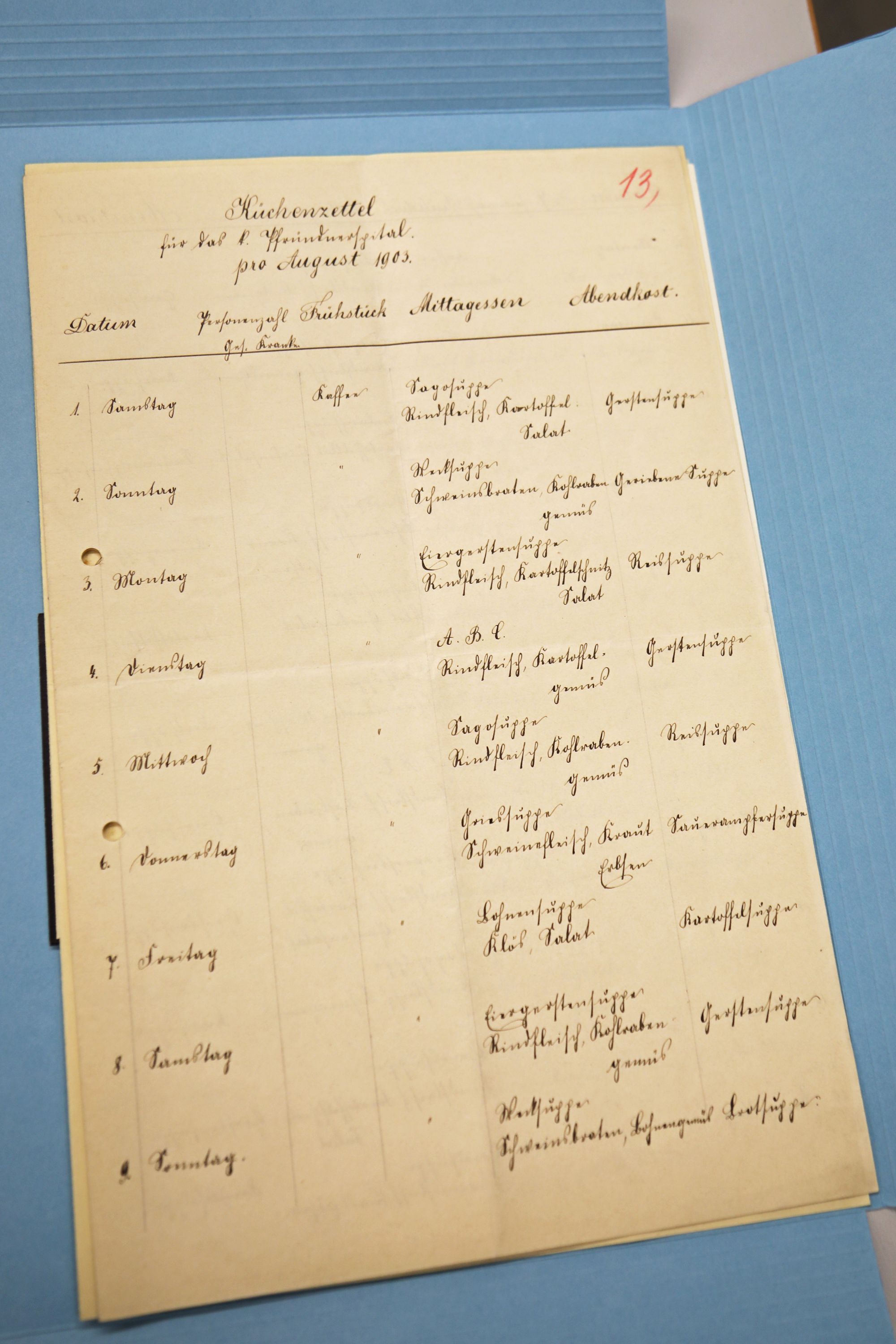 Zum Abschluss stellte Dr. Johanna Konrad-Brey, Archivmitarbeiterin bei den Erlöserschwestern, einige ausgewählte Unterlagen aus dem Archiv vor. Das Herzstück der Überlieferung seien die Akten der Schwestern, zu denen auch „wunderbare Fotos“ gehörten. „Sie lassen Untersuchungen zur Herkunft, Sozialstruktur und den Fähigkeiten zu, die die Schwestern mitbrachten.“ Ebenfalls ausgestellt war das Gästebuch des Mutterhauses. Auf diesem lägen allerdings teilweise noch Schutzfristen, erklärte Konrad-Brey. Mit das größte Interesse zog jedoch ein Küchenzettel aus dem Jahr 1903 auf sich. Unter anderem, weil unter der Rubrik „Frühstück“ an jedem einzelnen Tag nur ein Wort steht: „Kaffee“.