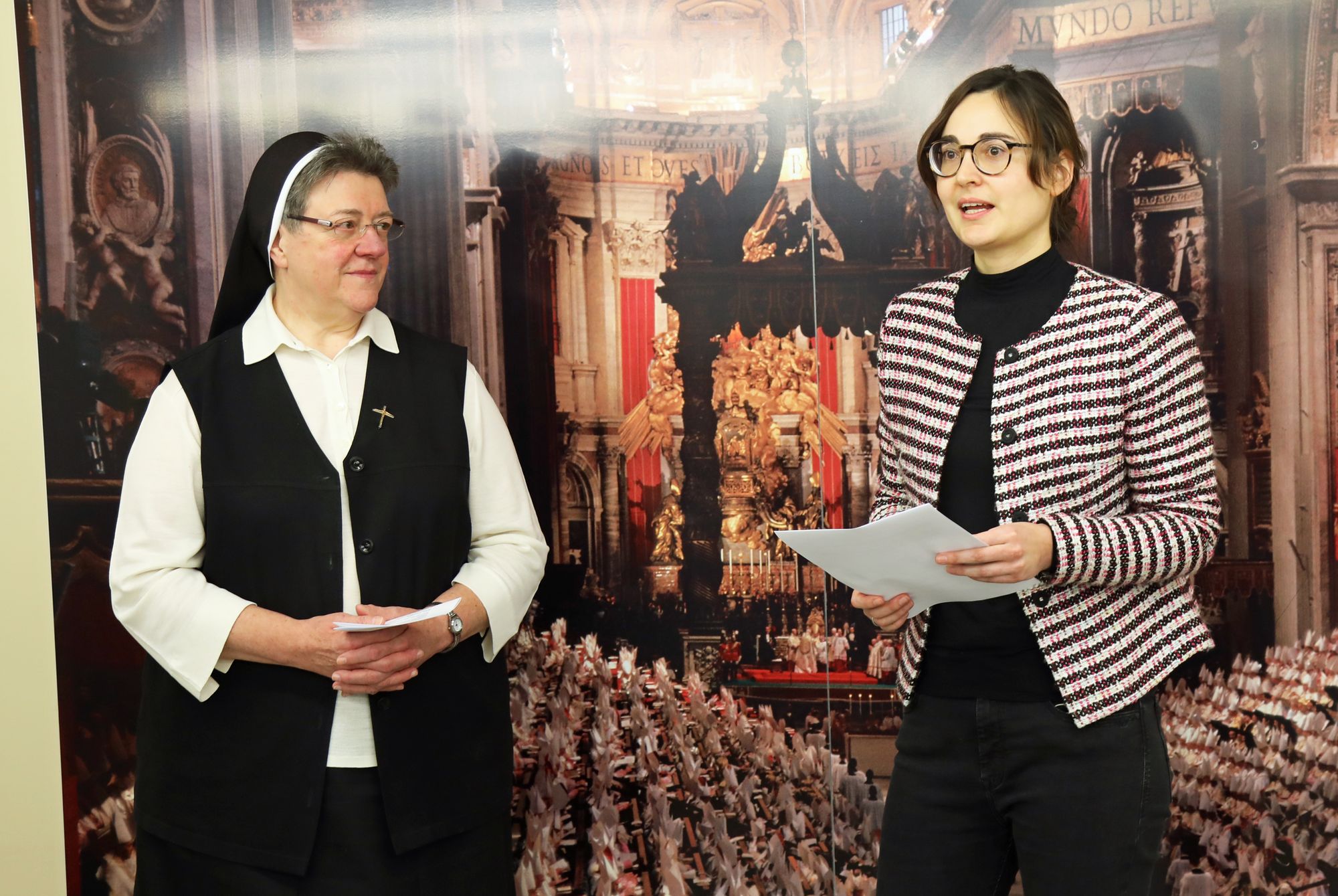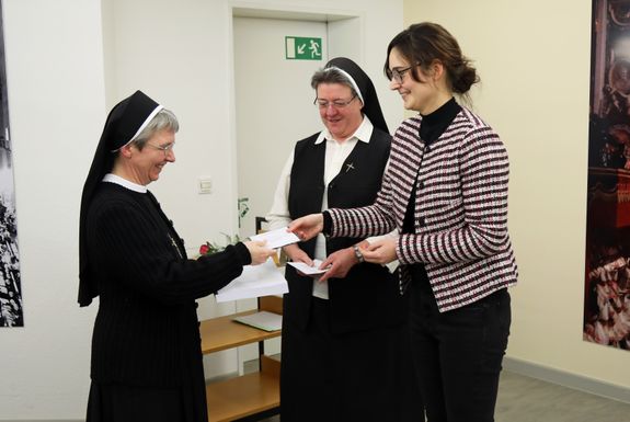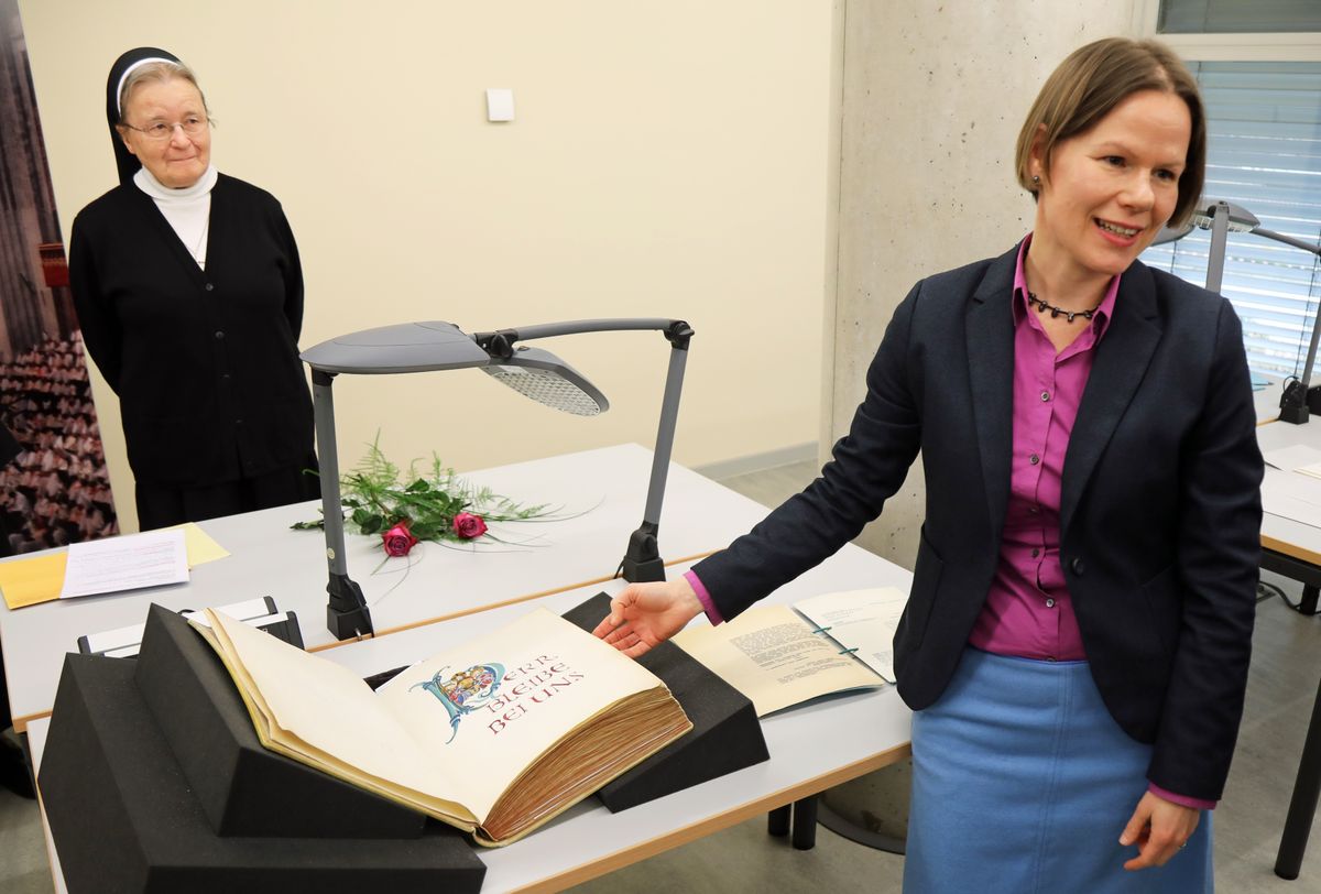 Projektleiterin Dr. Lina Hörl erläuterte anschließend die einzelnen Schritte, die für die Archivierung notwendig waren. Das begann beim Vorordnen und Sortieren der Unterlagen. Anschließend wurde bei einer sogenannten Provenienzanalyse die Herkunft der Unterlagen ermittelt. Die Metadaten wie Titel, Zeitangaben oder vorhandene Fotos mussten erfasst und ein Inhaltsverzeichnis erstellt werden. Auch mussten Dinge von Hand entfernt werden, die dem Papier schaden könnten – wie Klarsichtfolien oder Metallteile. Dann wurden die Unterlagen mit Spezialmaterial verpackt. Um sie zugänglich und benutzbar zu machen, wurde schließlich ein Findbuch mit Bestellnummern erstellt. Ein Exemplar samt dazugehöriger CD überreichte sie an Generaloberin Edinger.