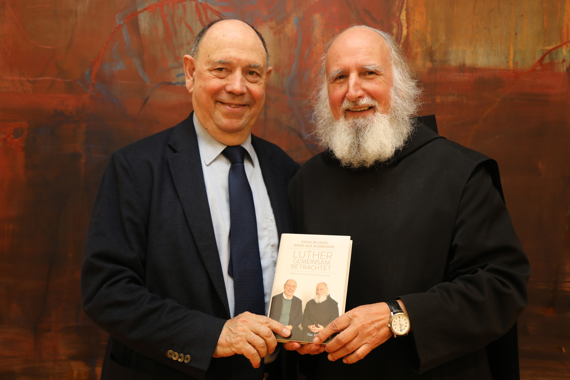 Würzburg (POW) Viel gegenseitige Wertschätzung und eine positive Grundeinstellung zur Ökumene: So lässt sich auf den Punkt bringen, was Nikolaus Schneider, langjähriger Ratsvorsitzender der Evangelischen Kirche in Deutschland, und Bestsellerautor Benediktinerpater Dr. Anselm Grün in ihrem Buch „Luther gemeinsam betrachtet“ festgehalten haben. Wie im Gespräch mit den Journalisten Klaus Hofmeister und Lothar Bauerochse, das die Grundlage für das Werk darstellt, erweisen sich die beiden auch bei der Vorstellung des Buchs im Würzburger Exerzitienhaus Himmelspforten am Donnerstagabend, 2. November, als gegenseitige Ergänzung.