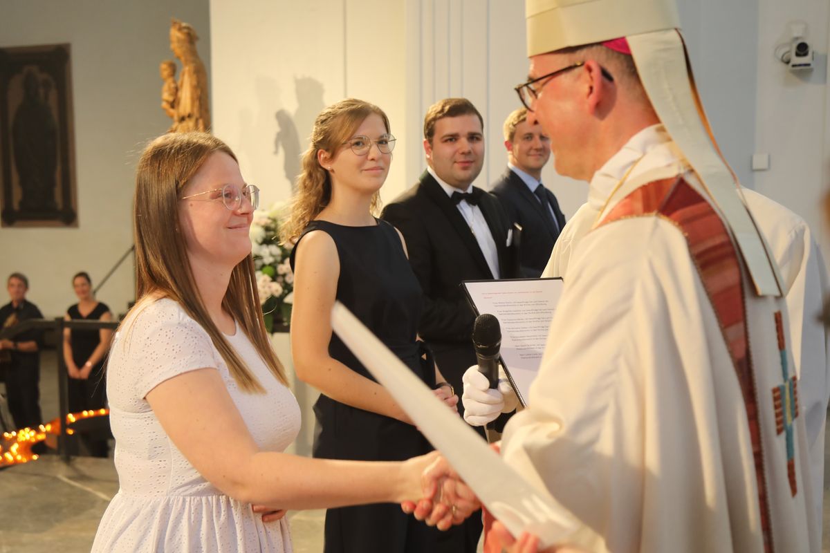 Im Namen aller Beauftragten dankte Elisabeth Baumann Bischof Jung, allen Ausbildungsverantwortlichen, den Heimat- und Ausbildungsgemeinden sowie allen, die zum Gelingen des Gottesdienstes beigetragen haben. Der „allergrößte Dank“ galt den Familien, Partnerinnen und Partnern, Freundinnen und Freunden sowie Weggefährtinnen und -gefährten: „Ihr wart immer an unserer Seite, habt uns in unserer Berufung unterstützt und wart eine Kraftquelle für uns.“ Stellvertretend für alle kamen für jeden Beauftragten und jede Beauftragte ein oder zwei Personen nach vorne, um mit ihnen zu beten.