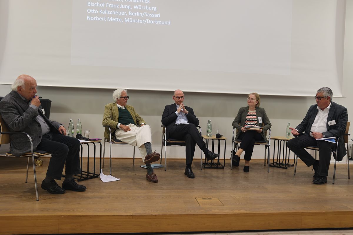 Artikulieren sich in diesem Dokument fundamentale theologische Grundanliegen, denen man sich in der Gegenwart weiterhin verpflichtet fühlen muss? Und wenn ja: Inwiefern spielen diese Motive in der heutigen Kirche und ihren Theologien noch eine Rolle? Mit diesen Fragen haben sich am Freitagabend, 26. September, als Teil einer Domschultagung zu dem Text im Würzburger Burkardushaus die Dogmatikerin Professorin Dr. Margit Eckholt (Universität Osnabrück), der Pastoraltheologe Professor Dr. Norbert Mette (Universität Dortmund), der Politikwissenschaftler und Philosoph Professor Dr. Otto Kallscheuer (Sassari) sowie Bischof Dr. Franz Jung auseinandergesetzt. Professor Dr. Matthias Reményi, Dekan der Katholisch-Theologischen Fakultät Würzburg, moderierte die Podiumsdiskussion. Die Veranstaltung war eine Kooperation der Domschule Würzburg in Zusammenarbeit mit dem iths Institut für Theologie und Sozialethik der TU Darmstadt, der Systematischen Theologie der Technischen Universität Dortmund, der Systematischen Theologie der Justus-Liebig-Universität Gießen sowie des Lehrstuhls für Fundamentaltheologie der Universität Würzburg.