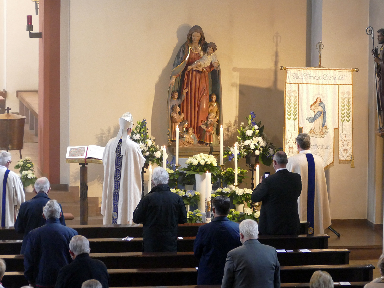 In seiner Predigt würdigte der Bischof diesen Zusammenschluss von Laien als wichtigen Beitrag für das Leben der Kirche. Bruderschaften und Sodalitäten seien immer aus wacher Zeitgenossenschaft heraus entstanden und eine Antwort auf eine konkrete Not in der Gesellschaft gewesen. Bischof Jung übertrug das auf die aktuelle Situation in Aschaffenburg, wo die Kirchengemeinden gerade zu einem gemeinsamen Pastoralen Raum umstrukturiert werden. „Als pfarreiübergreifender Zusammenschluss kann die Sodalität hier gute Dienste leisten und sich mit ihrer geprägten Spiritualität aktiv einbringen“, sagte der Bischof. Er ging auch auf die sechs geistlichen Übungen ein, zu denen sich jedes Mitglied der Männersodalität verpflichtet. Sie reichen vom Besuch der Sodalenmesse über die Wallfahrt nach Walldürn bis zur Treue im Gebet. „Der Glaube nimmt von uns die Traurigkeit dieser Zeit“, zitierte Bischof Jung aus der Lauretanischen Litanei und wünschte den Sodalen, dass die Helligkeit der Sehnsucht nach Gott in den Herzen der Mitglieder und aller Aschaffenburger Einzug halte und damit alle Traurigkeit vertreibe.