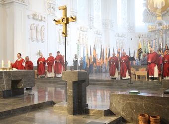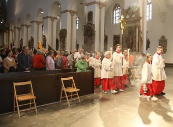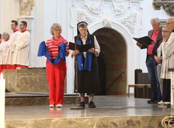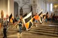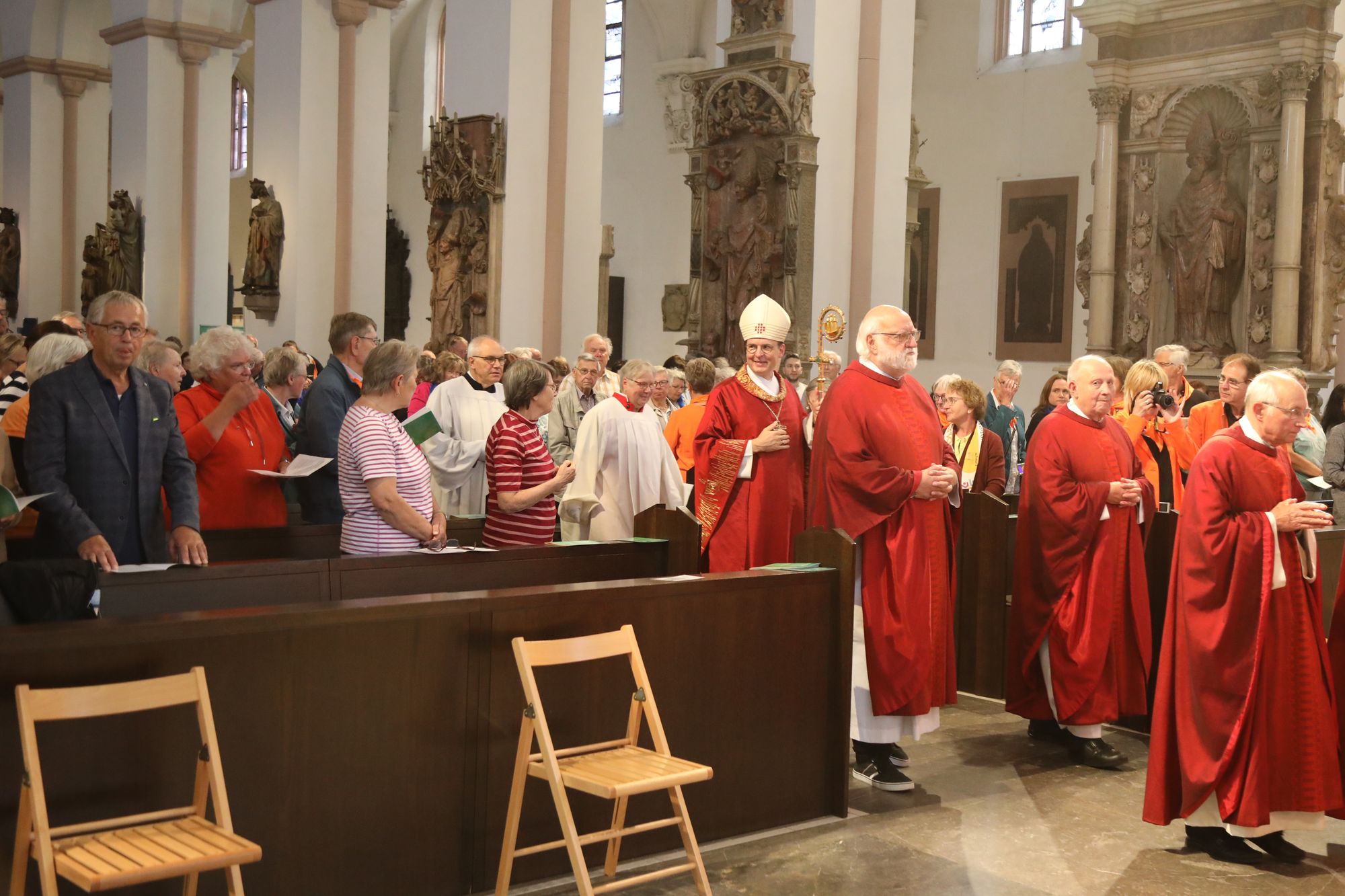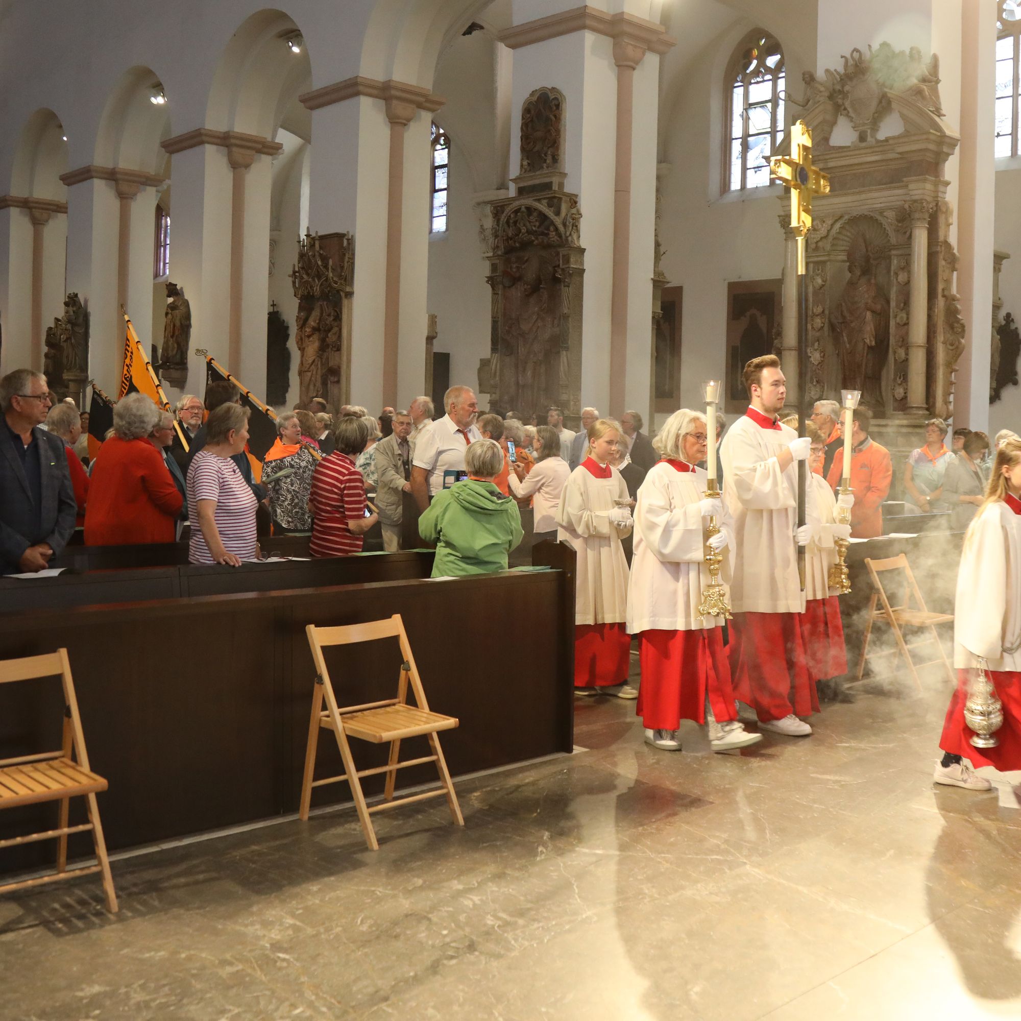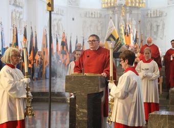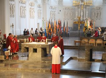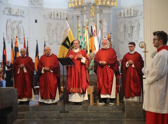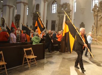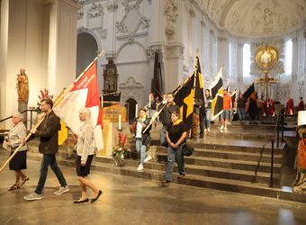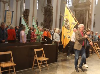 Würzburg (POW) Ein farbenfrohes Bild haben die Fahnen der Katholischen Erwachsenenverbände am Dienstagabend, 8. Juli, im Würzburger Kiliansdom geboten. Weihbischof Paul Reder feierte den Kiliani-Wallfahrtsgottesdienst mit rund 400 Frauen und Männern. „Die Fahnenabordnungen zeigen, welche Fahne Ihr hochhaltet – die Fahne der christlichen Hoffnung in einer Welt und Zeit, die oftmals so entmutigend und hoffnungslos ist“, sagte der Weihbischof in seiner Begrüßung.