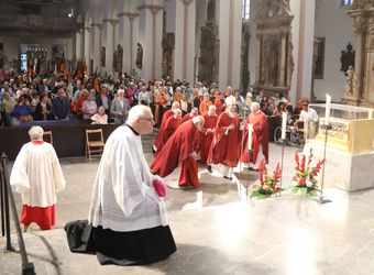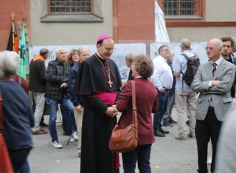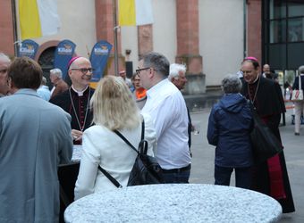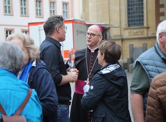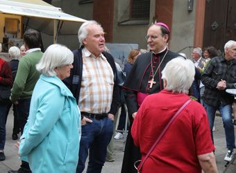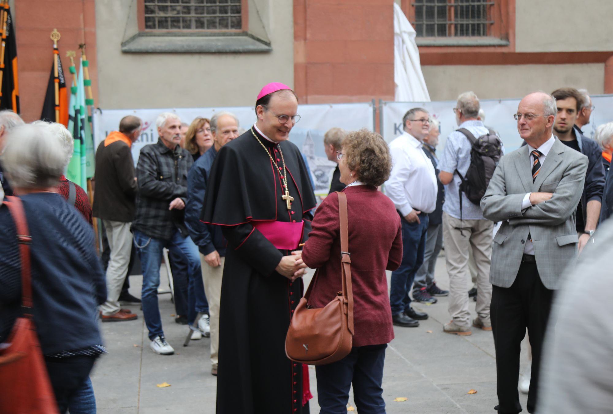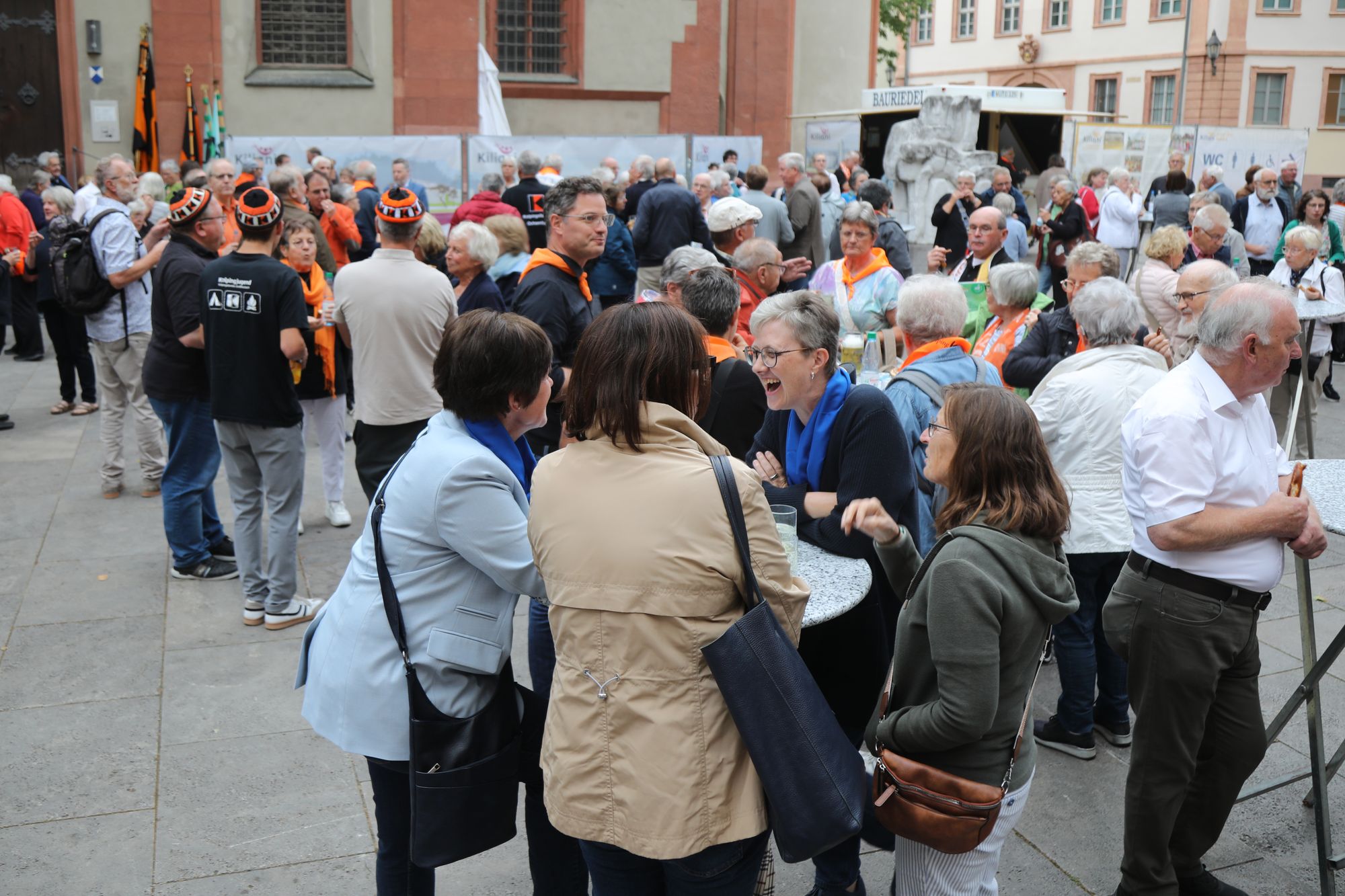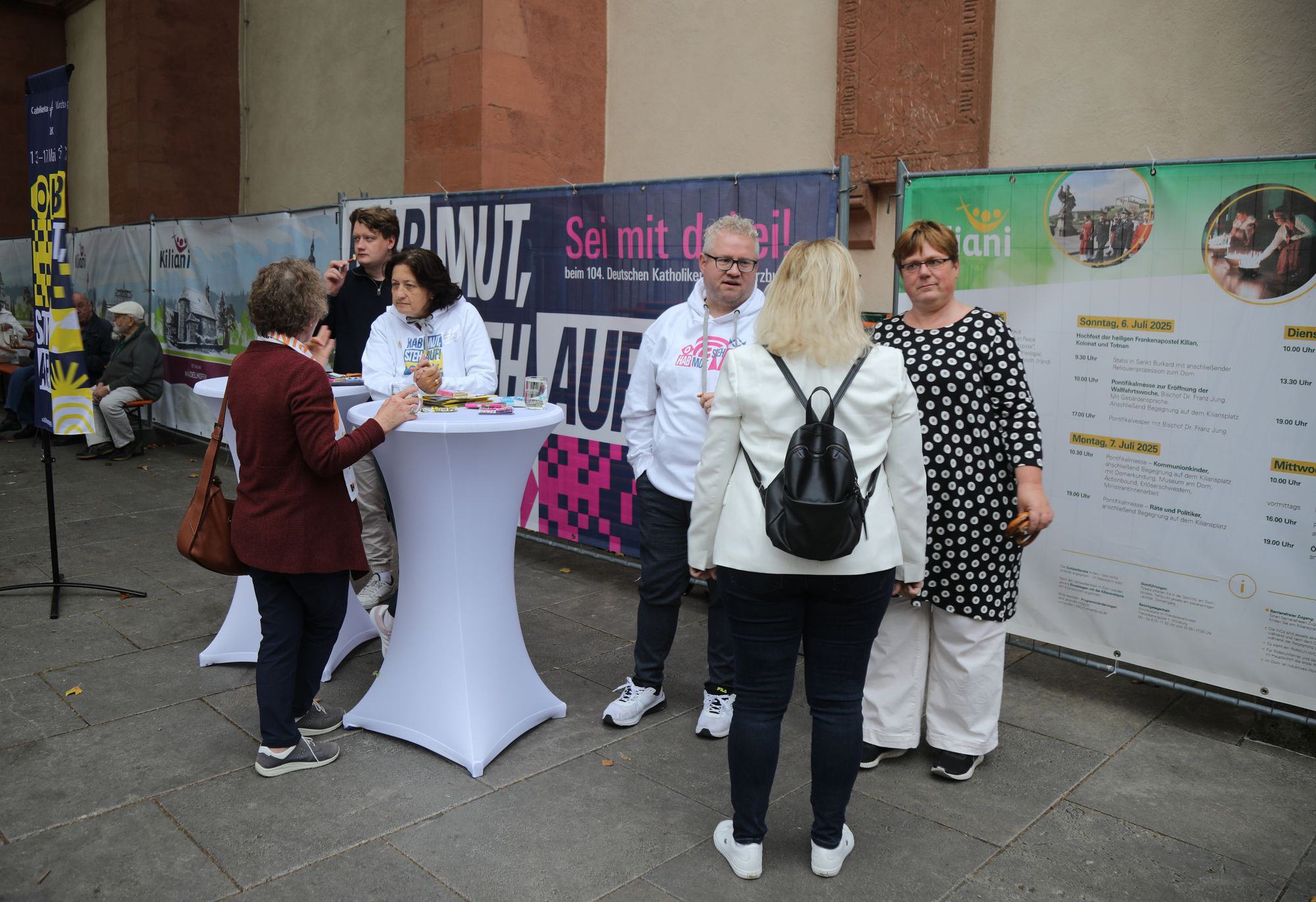 Im Anschluss an den Gottesdienst nutzten viele Gläubige das Angebot, sich unter Auflegen von Reliquien der Frankenapostel segnen zu lassen. Auf dem Kiliansplatz konnten die Gottesdienstbesucher das Gespräch mit Weihbischof Reder und Bischof Dr. Franz Jung suchen und sich am Stand des 104. Deutschen Katholikentags über die Großveranstaltung vom 13. bis zum 17. Mai 2026 in Würzburg informieren.