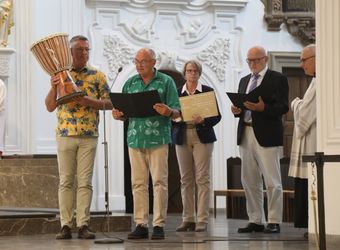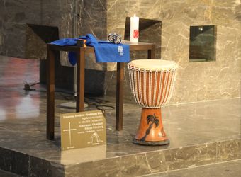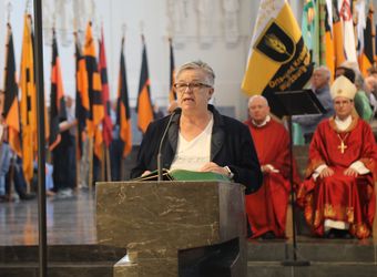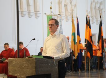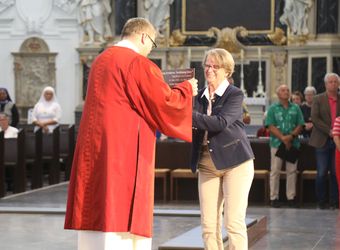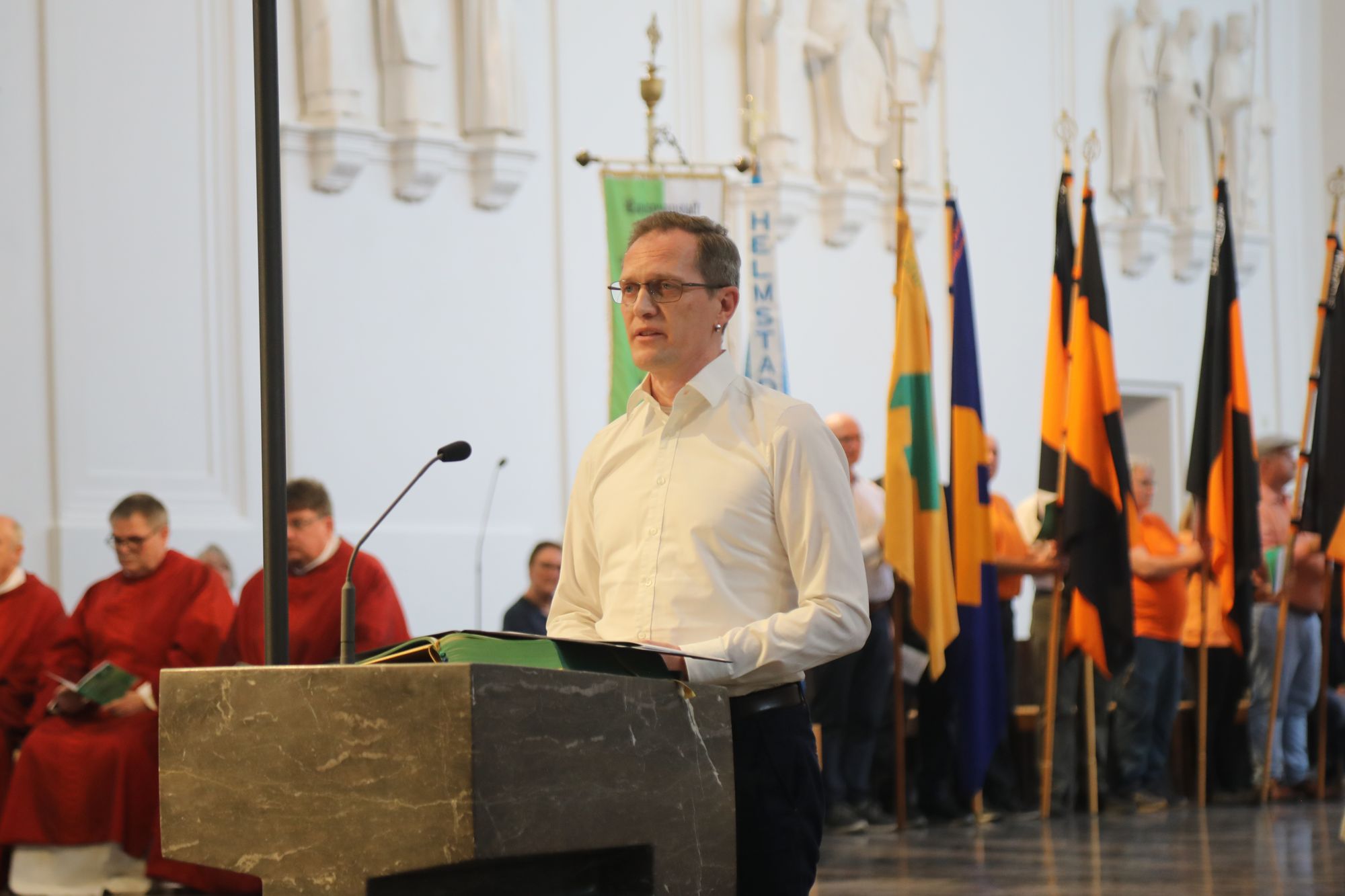 Bei den Fürbitten brachten Vertreterinnen und Vertreter der Verbände symbolisch Gaben vor den Altar. Ein Kolpingwürfel aus ineinander verschlungenen orangefarbenen und schwarzen Seiten stand für das Miteinander aller Generationen, in dem alle ihren Platz haben. Mit dem blauen Schal des KDFB war die Bitte für mehr Frauengerechtigkeit in Politik, Gesellschaft und Kirche verbunden. Die Katholische Arbeitnehmer-Bewegung (KAB) hatte ein Kugellager mitgebracht als Zeichen für den Kampf um faire Arbeitsbedingungen und ein christliches Miteinander in der Arbeitswelt. Mit einer Trommel warb die Katholische Landvolkbewegung (KLB) für Solidarität und Geschwisterlichkeit über Grenzen hinweg. Versöhnung und Völkerverständigung waren die Anliegen der Ackermann-Gemeinde, die eine Nagelkreuzplakette und eine Kerze brachte.