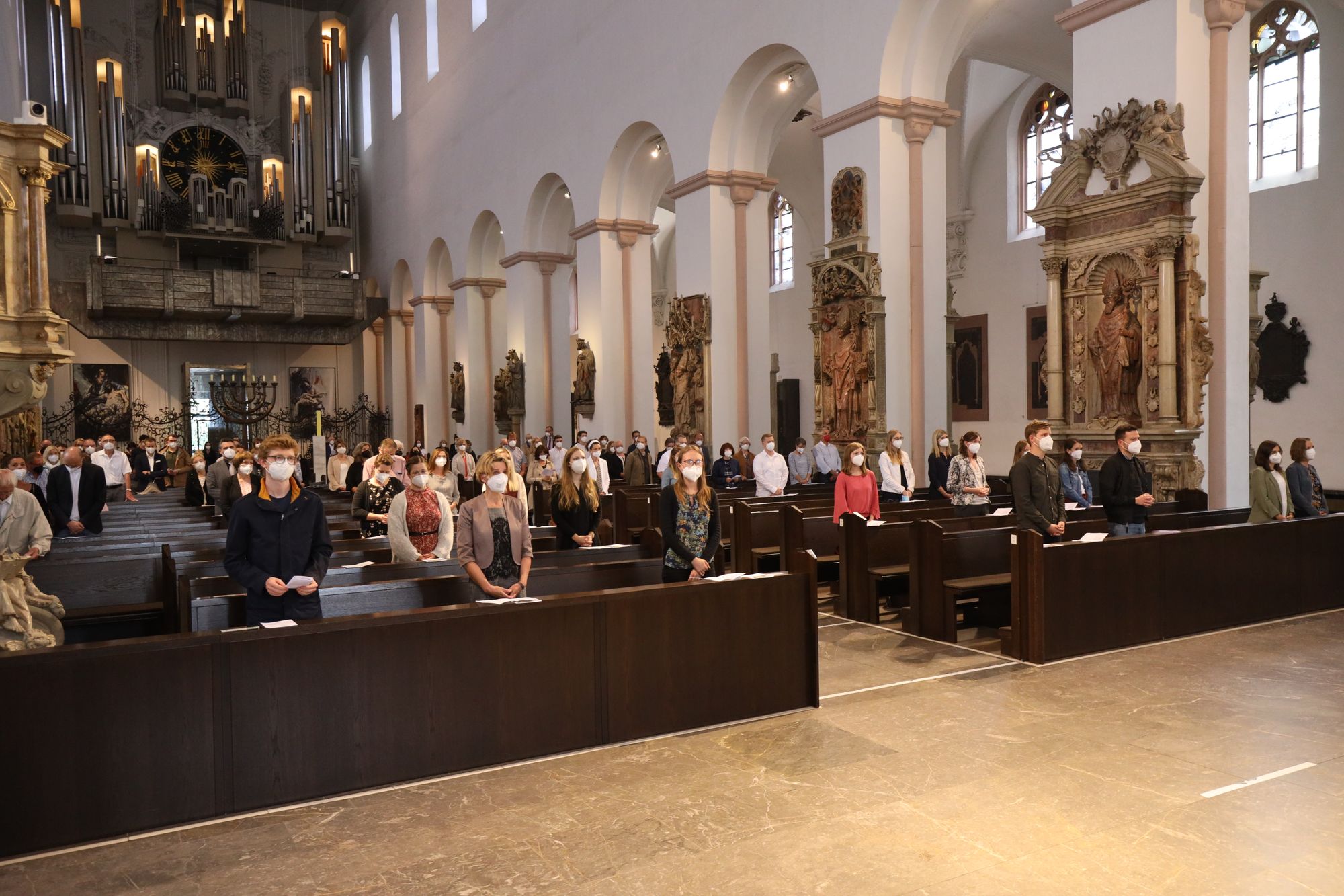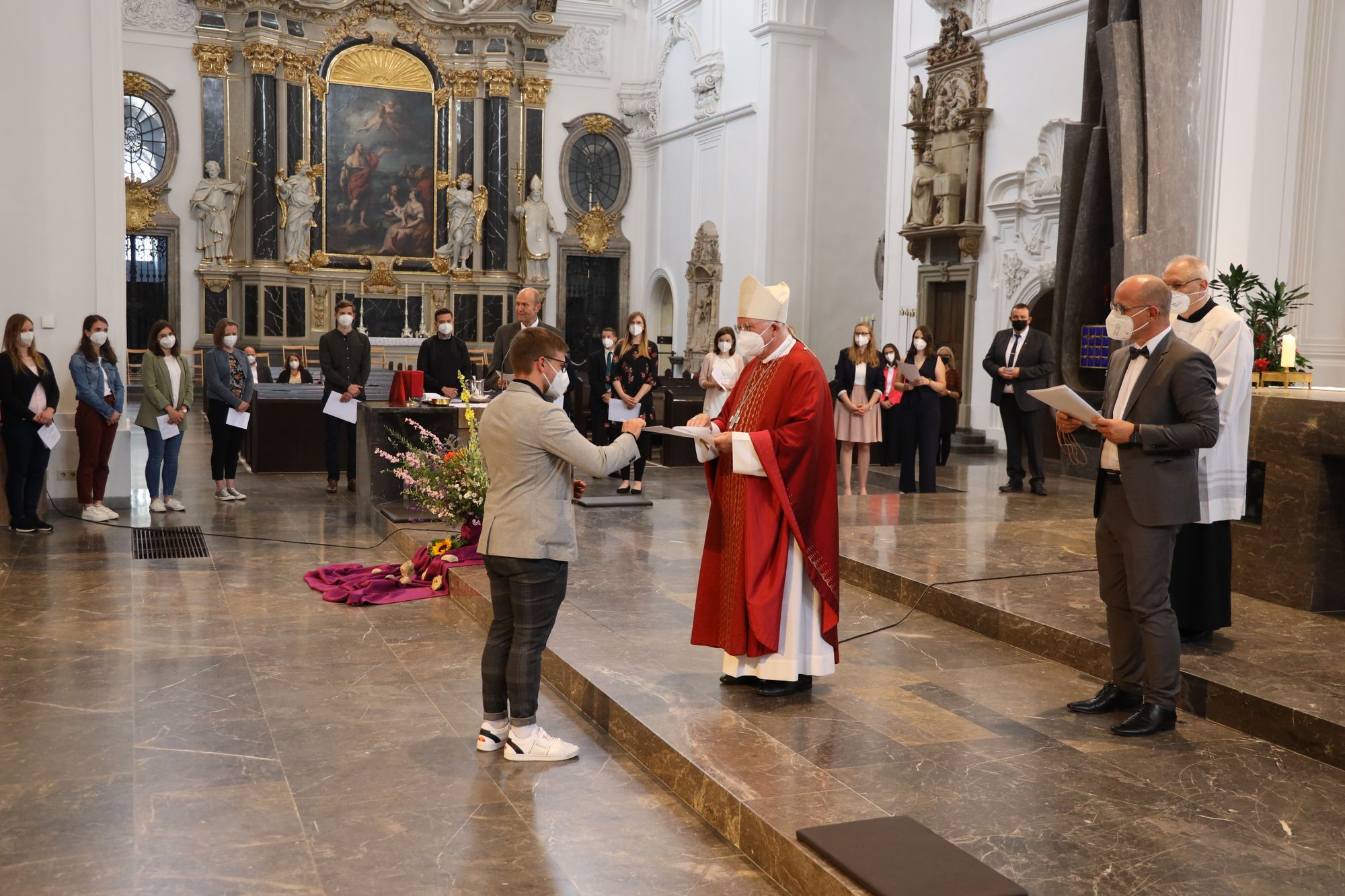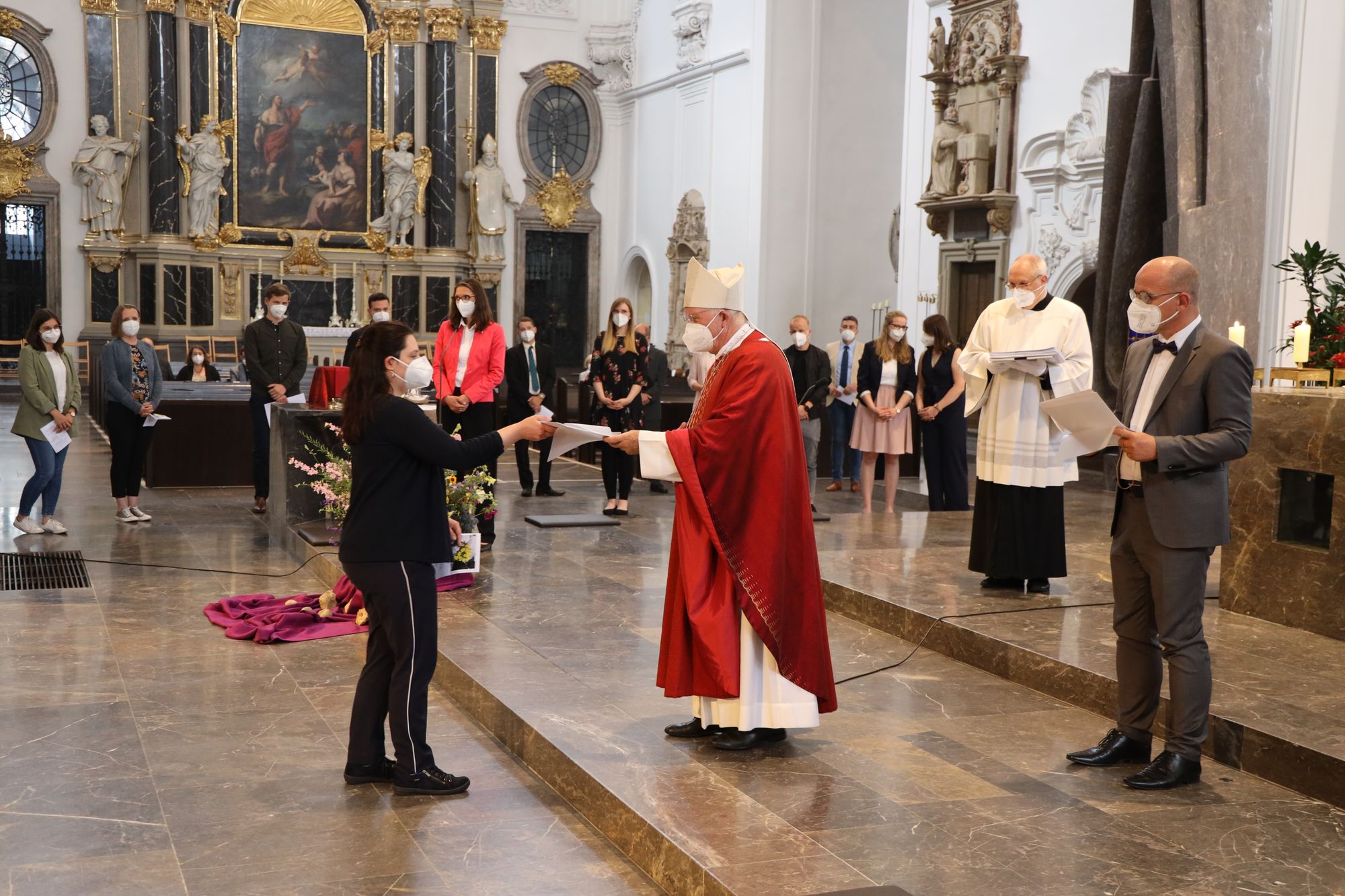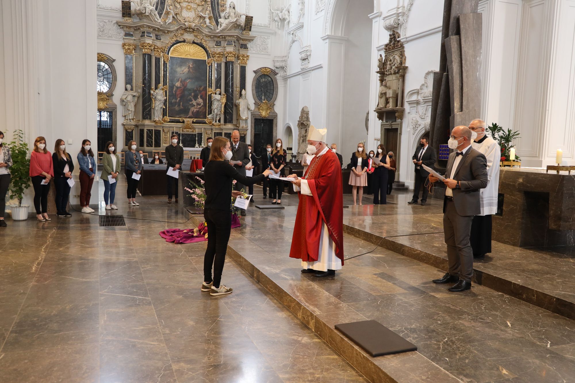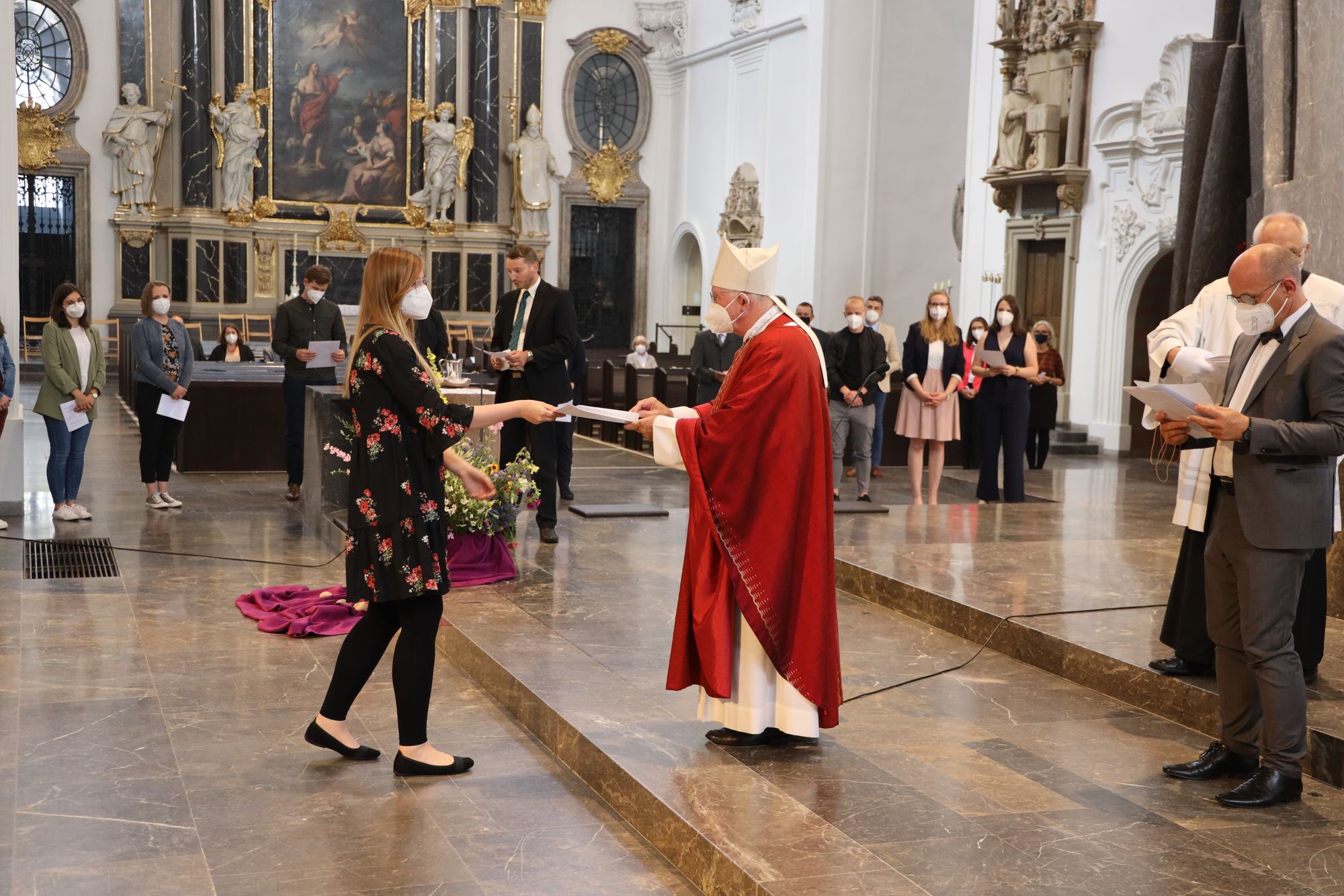 Würzburg (POW) 33 Frauen und sieben Männern hat Weihbischof Ulrich Boom im Auftrag von Bischof Dr. Franz Jung am Freitagabend, 9. Juli, beim Kiliani-Tag der Verantwortlichen in Schule und Erziehung die Missio canonica verliehen. Bei einer Eucharistiefeier unter den aktuellen Coronaschutzvorschriften mit rund 120 Gläubigen im Kiliansdom erklärte der Weihbischof, die Frankenapostel Kilian, Kolonat und Totnan seien wie die Menschen in der aktuellen Coronapandemie mit Sorgen und Nöten konfrontiert gewesen. Aber sie hätten ein tiefes Vertrauen gehabt, das sich auf sie selbst, die Gemeinschaft und nicht zuletzt auf Gott gegründet habe. „In Jesus Christus hat Gott uns gezeigt, wie nahe er uns ist in unserem Leben und Sterben, in unseren Unsicherheiten und Ängsten.“ Insofern seien die Frankenapostel Vorbilder und Helfer, „sowohl im Blick auf die globale Krise, verursacht durch den Coronavirus, als auch auf die noch tiefer sitzende Verunsicherung durch den Virus des Misstrauens“. Gemeinsam mit Leitendem Schulamtsdirektor i. K. Jürgen Engel, Leiter der Abteilung Schule und Hochschule, übergab der Weihbischof den neuen Religionslehrern dieses Schuljahres die Beauftragungsurkunden. Pandemiebedingt musste die Begegnung nach dem Gottesdienst entfallen.